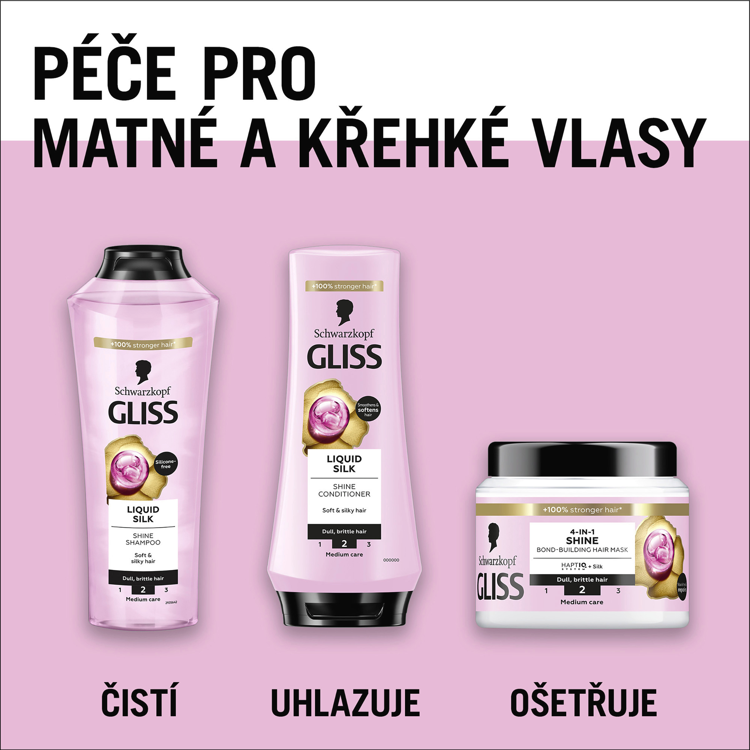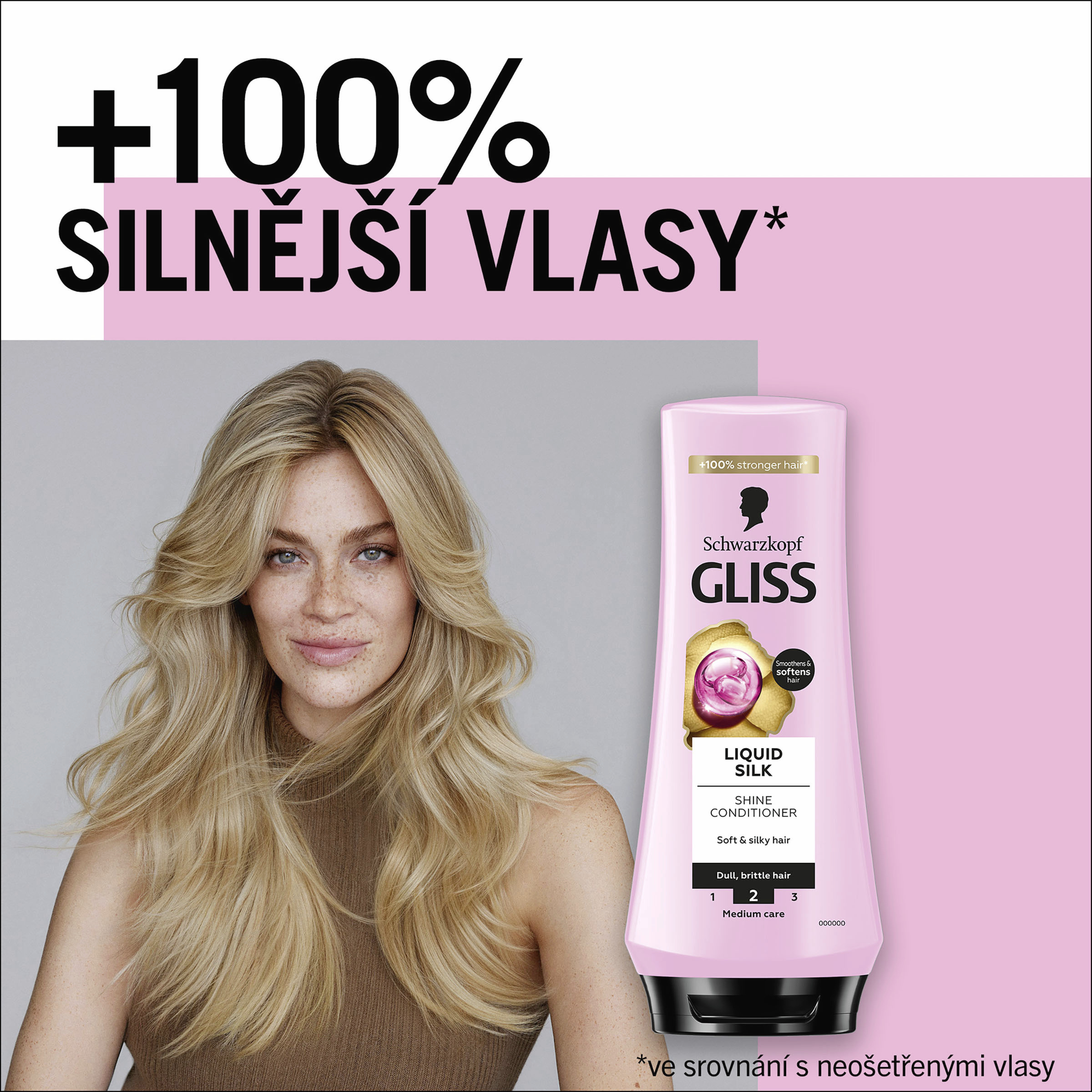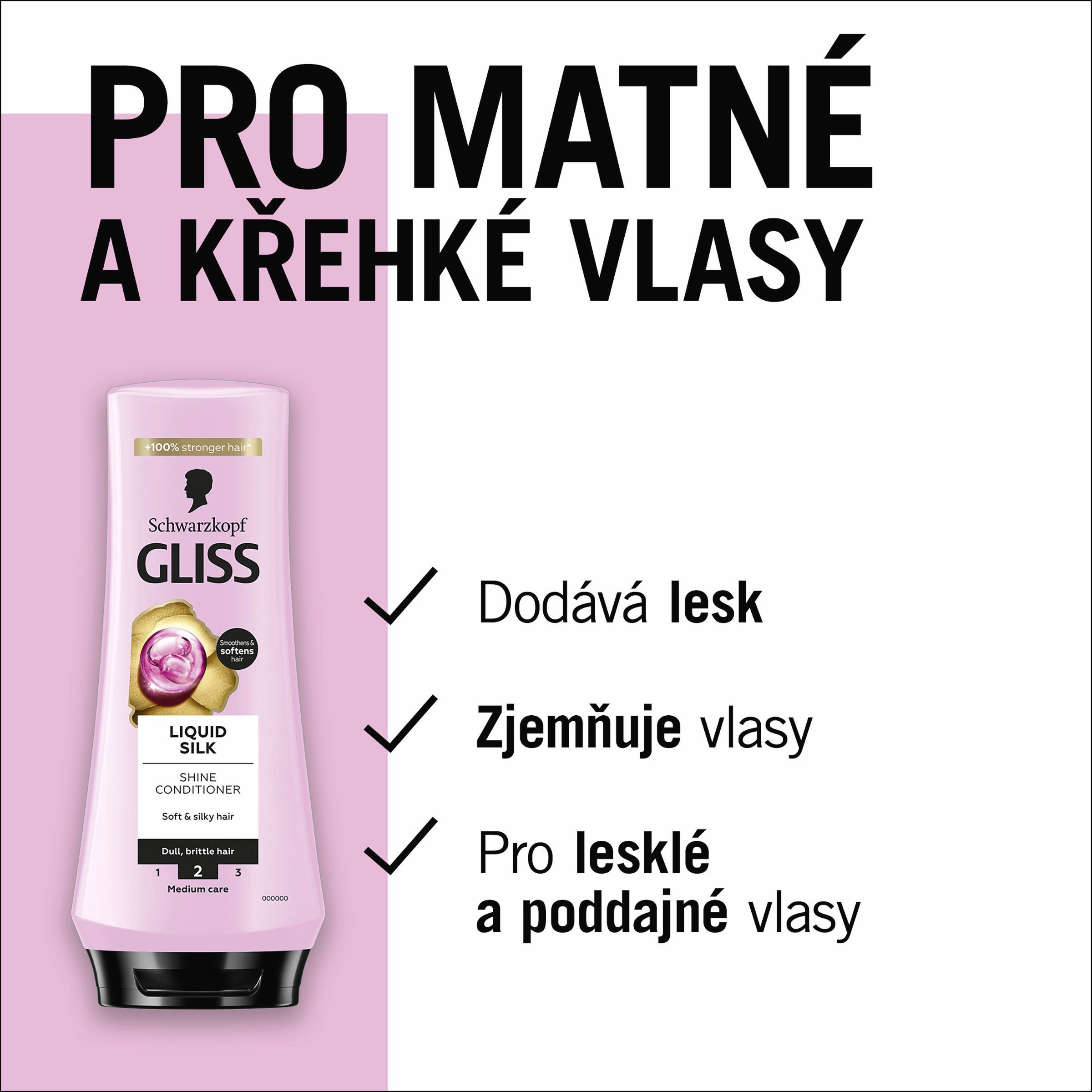 Schwarzkopf Gliss Liquid Silk kondicionér pro lesk vlasů - Kondicionér pro lámavé, matné vlasy. Vlasy mohou trpět nerovnostmi na jejich povrchu, takže mohou být křehké a matné. Vyžadují tak intenzivní vyživující péči, která vlasy obnoví a díky které budou hladké a hedvábné. Gliss Liquid Silk kondicionér kombinuje ceramidy a tekuté hedvábí k vyhlazení povrchu vlasů a zesílení jejich přirozeného lesku.