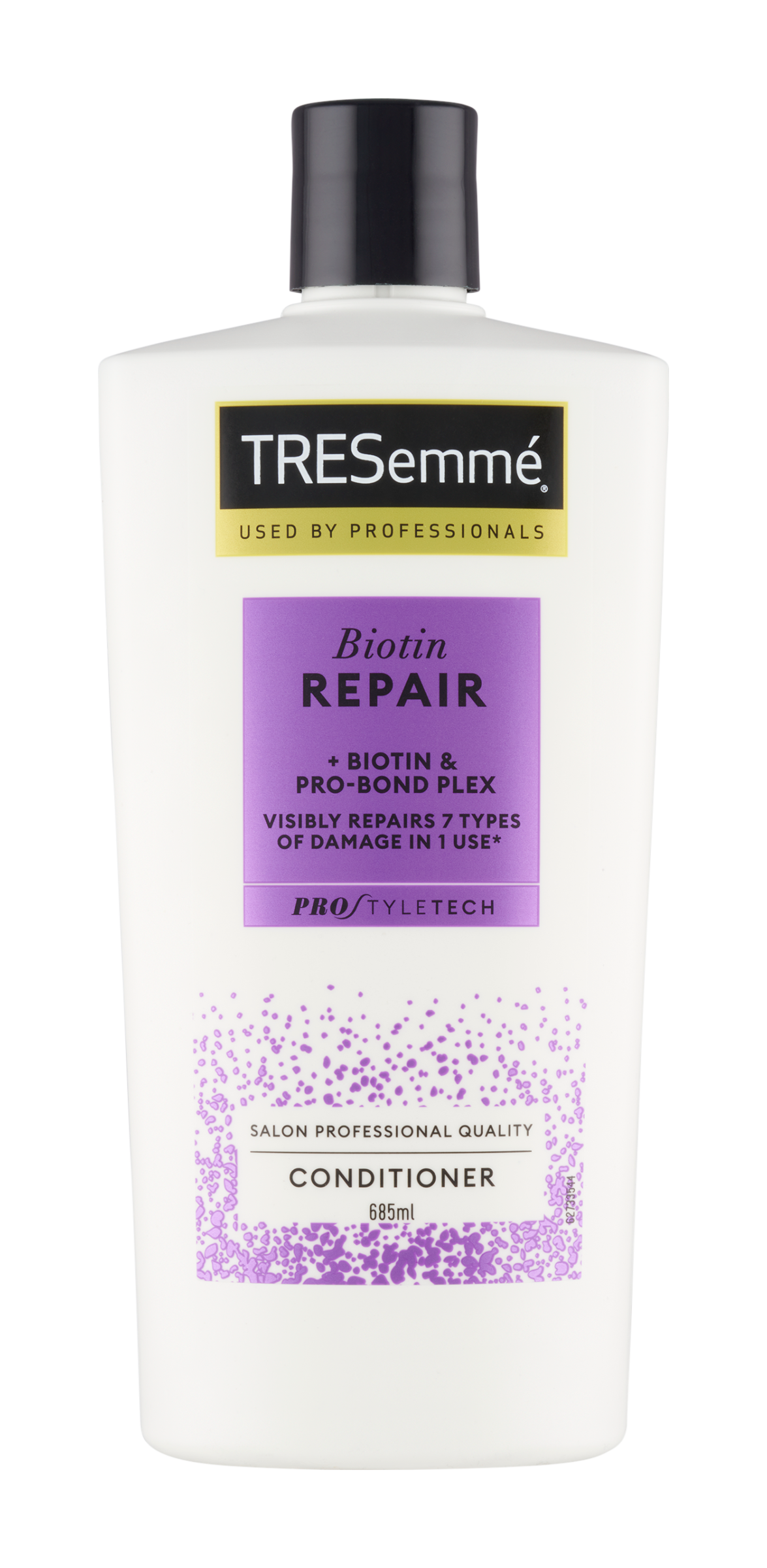 Vaše vlasy nemusí být dokonalé, ale můžou dosáhnout své nejlepší formy. Předcházejte jejich poškození s naší nejpokročilejší řadou Biotin Repair. Tato řada se postará o viditelný rozdíl v péči o vlasy díky speciální technologii Pro-Bond Plex, která poskytne vlasům štít a ochrání je tak, aby zůstaly silné a vyživené. Zabraňuje totiž oslabení, lámání, vysušení i třepení konečků. Dokáže opravit prameny poškozené barvením nebo stylingem a pomáhá vlasům rychleji se vrátit do formy. Díky tomu tato řada napomáhá předcházet problémům a chrání vlasy až před 7 typy poškození.* TRESemmé je nositelem PETA certifikace a netestuje na zvířatech.