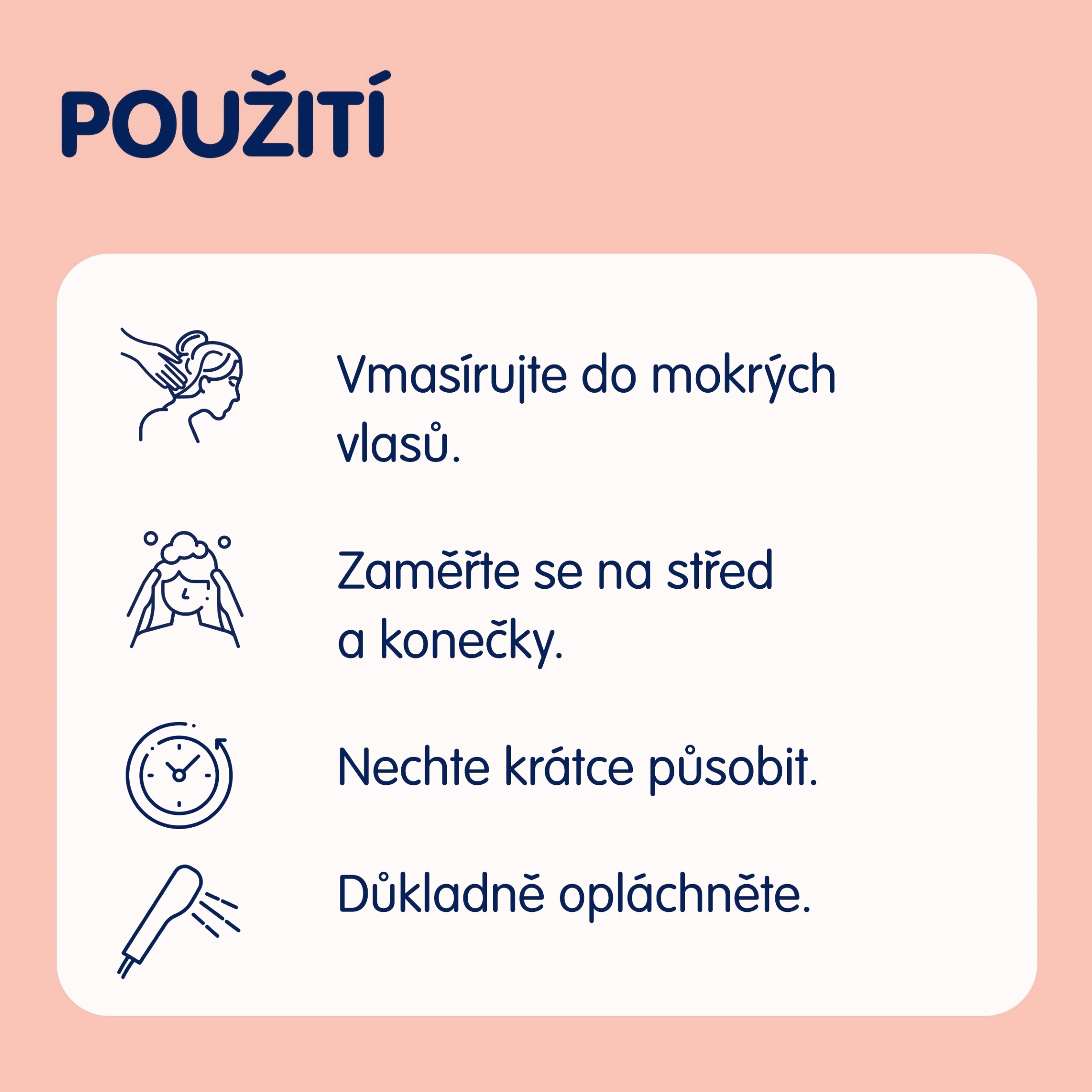 Vpracujte kondicionér do mokrých vlasů, soustřeďte se na střed a konečky. Nechte krátce působit a potom důkladně opláchněte.
