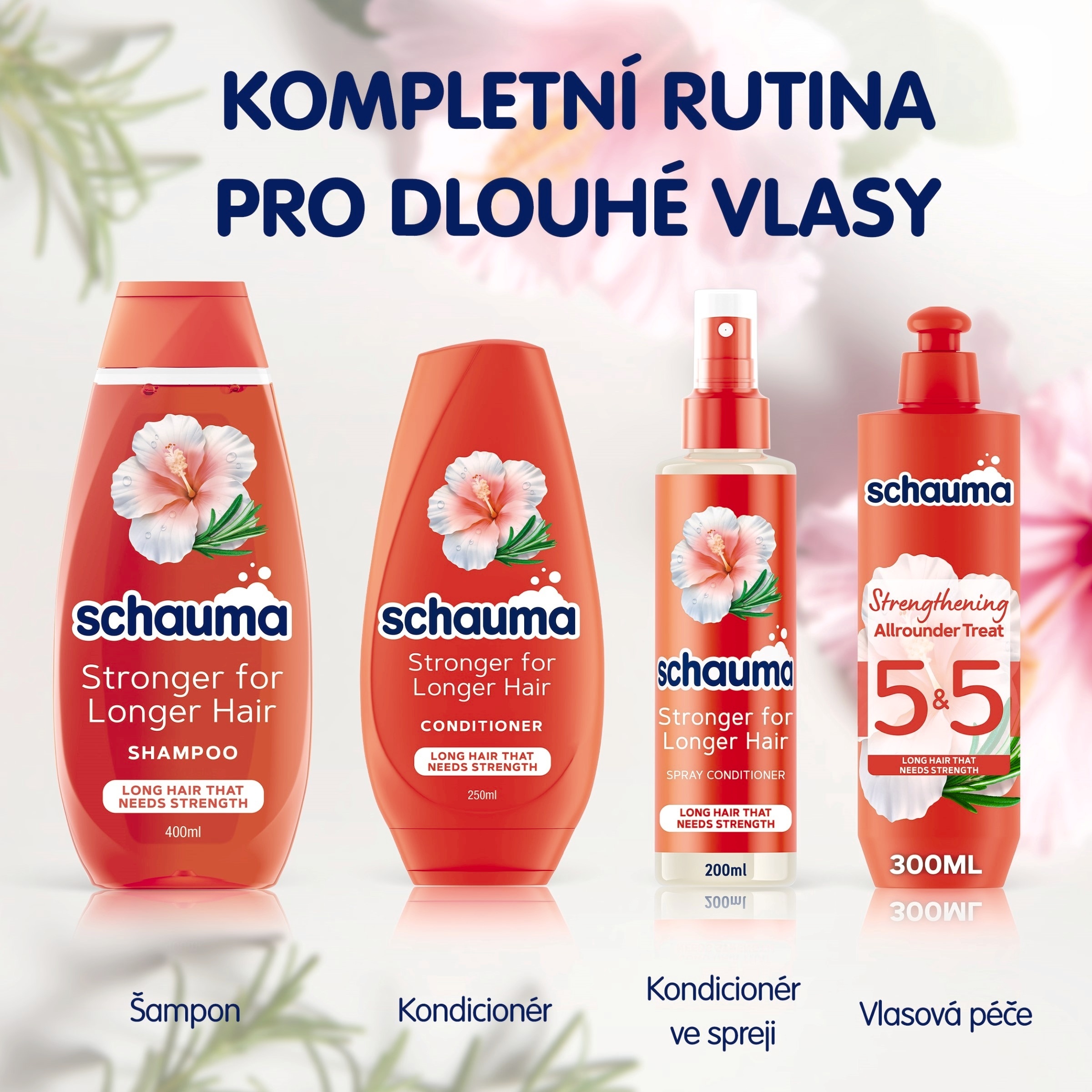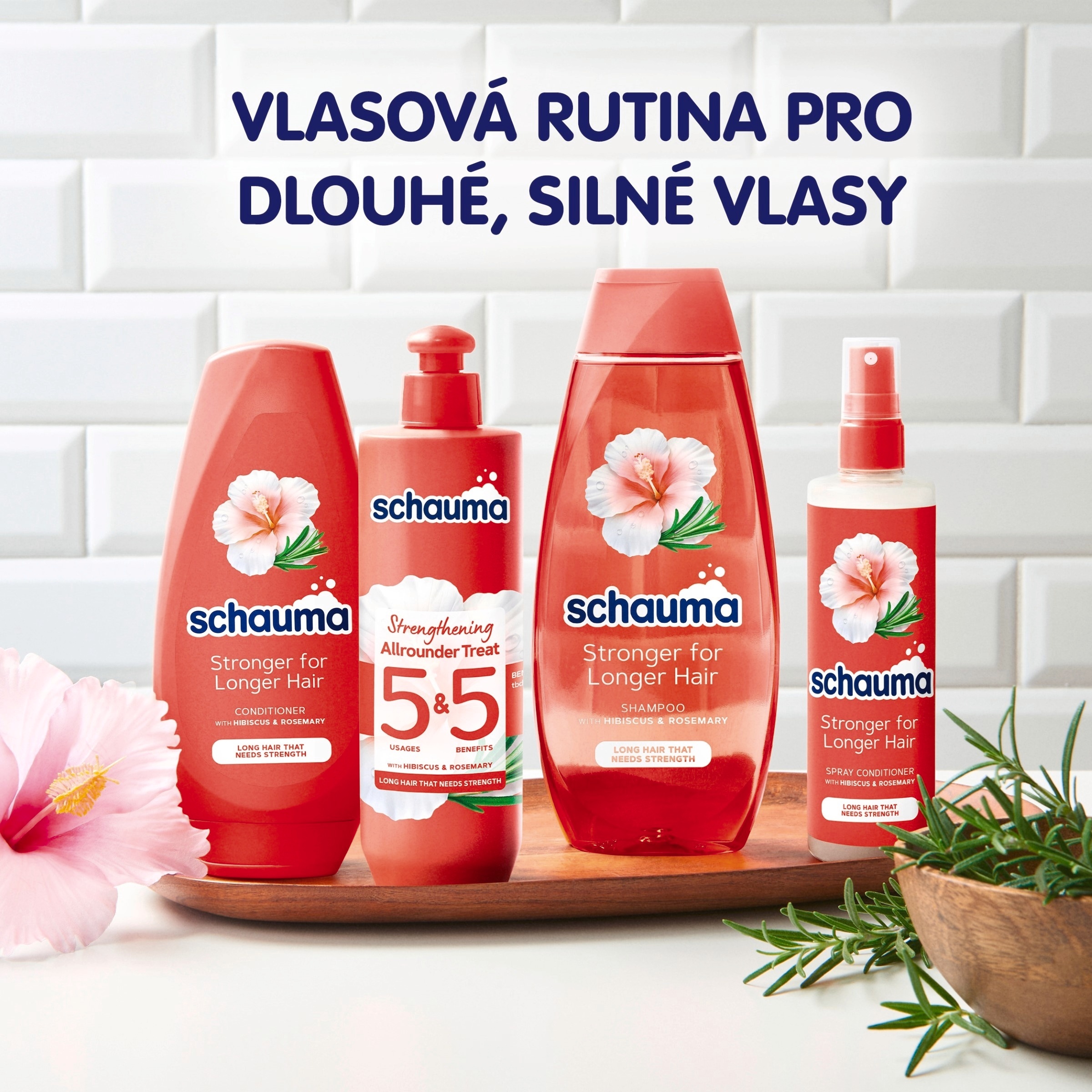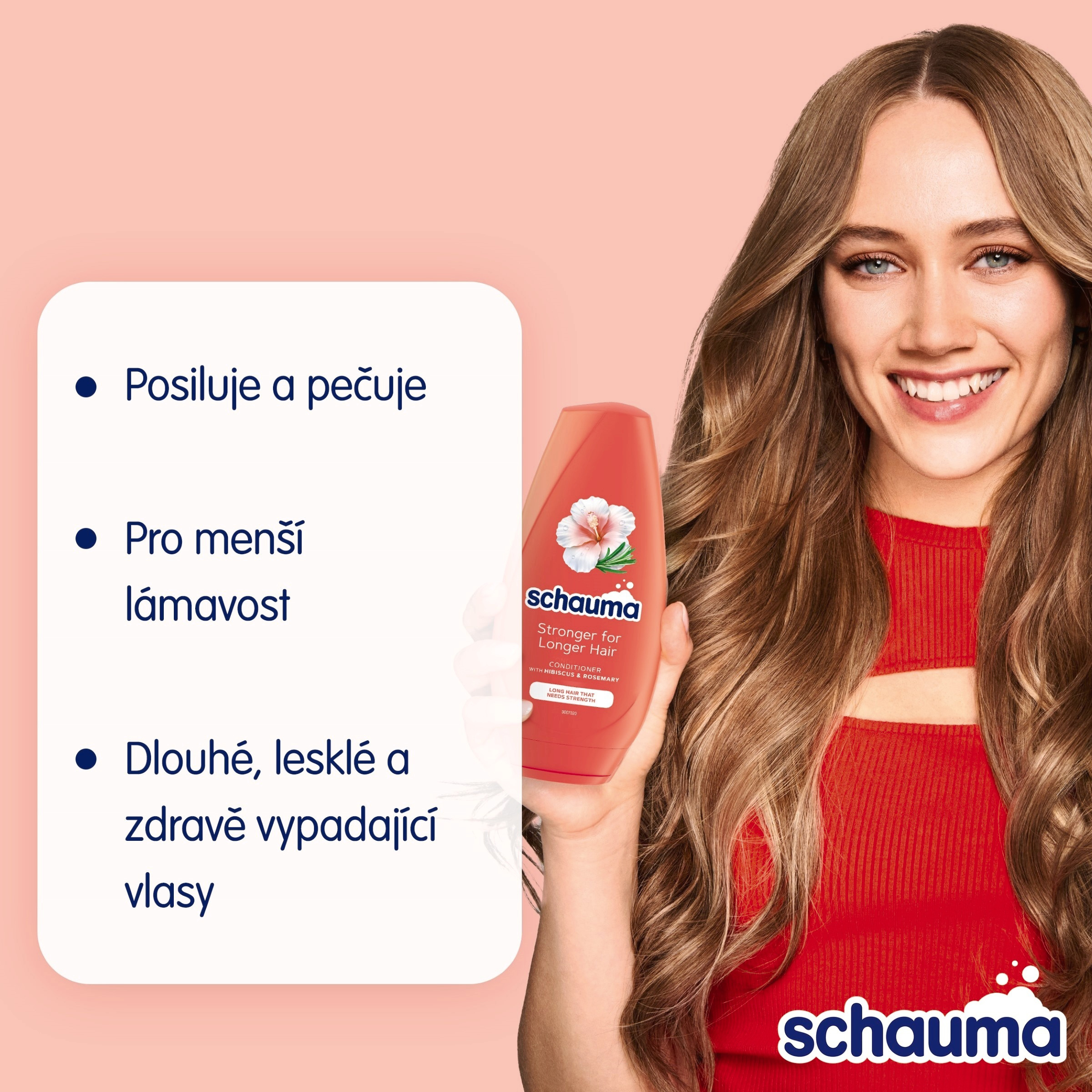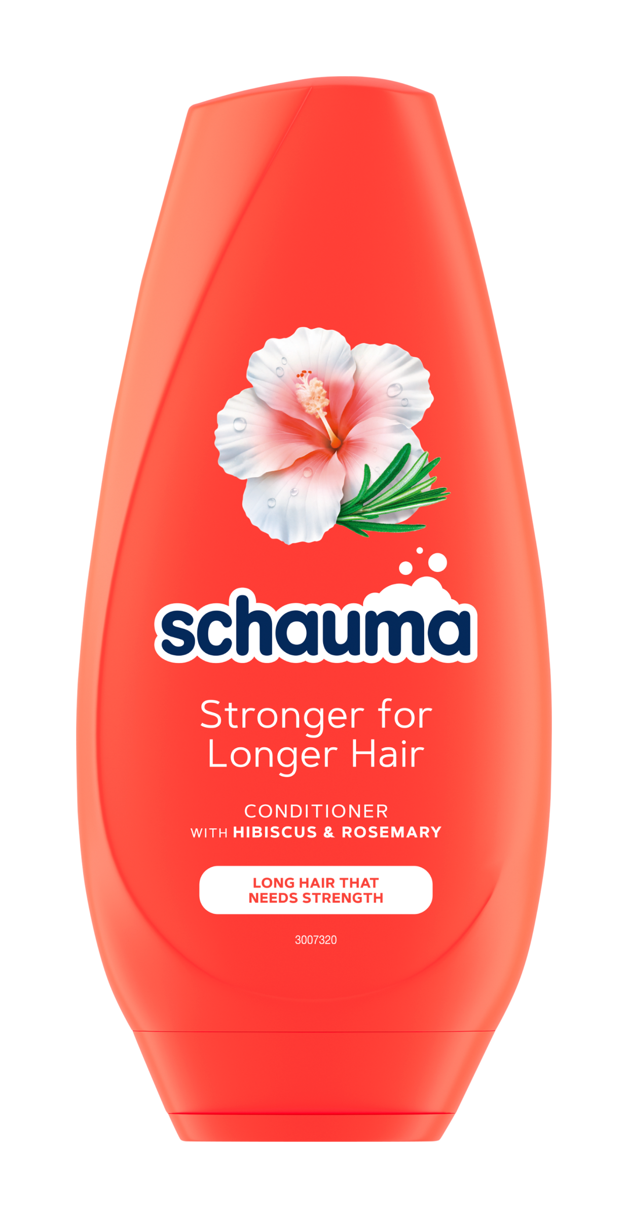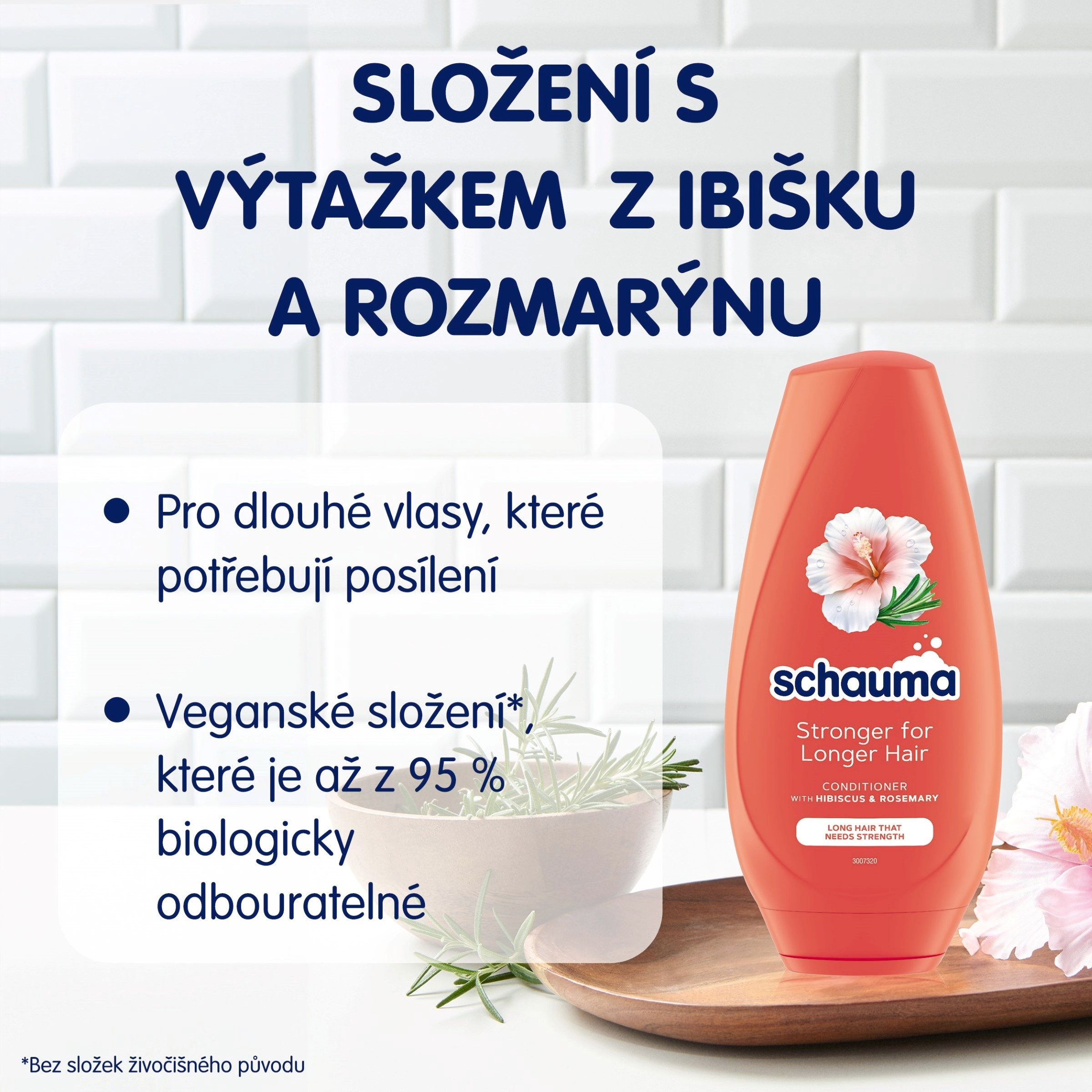 Kondicionér na vlasy Schauma Stronger for Longer Hair s ibiškem a rozmarýnem pro dlouhé vlasy, které potřebují posílení. Tento Schauma kondicionér posiluje dlouhé vlasy a pečuje o ně, dodává délkám větší odolnost pro menší lámavost. Složení je veganské (bez přísad živočišného původu) a obsahuje výtažek z ibišku a rozmarýnu.