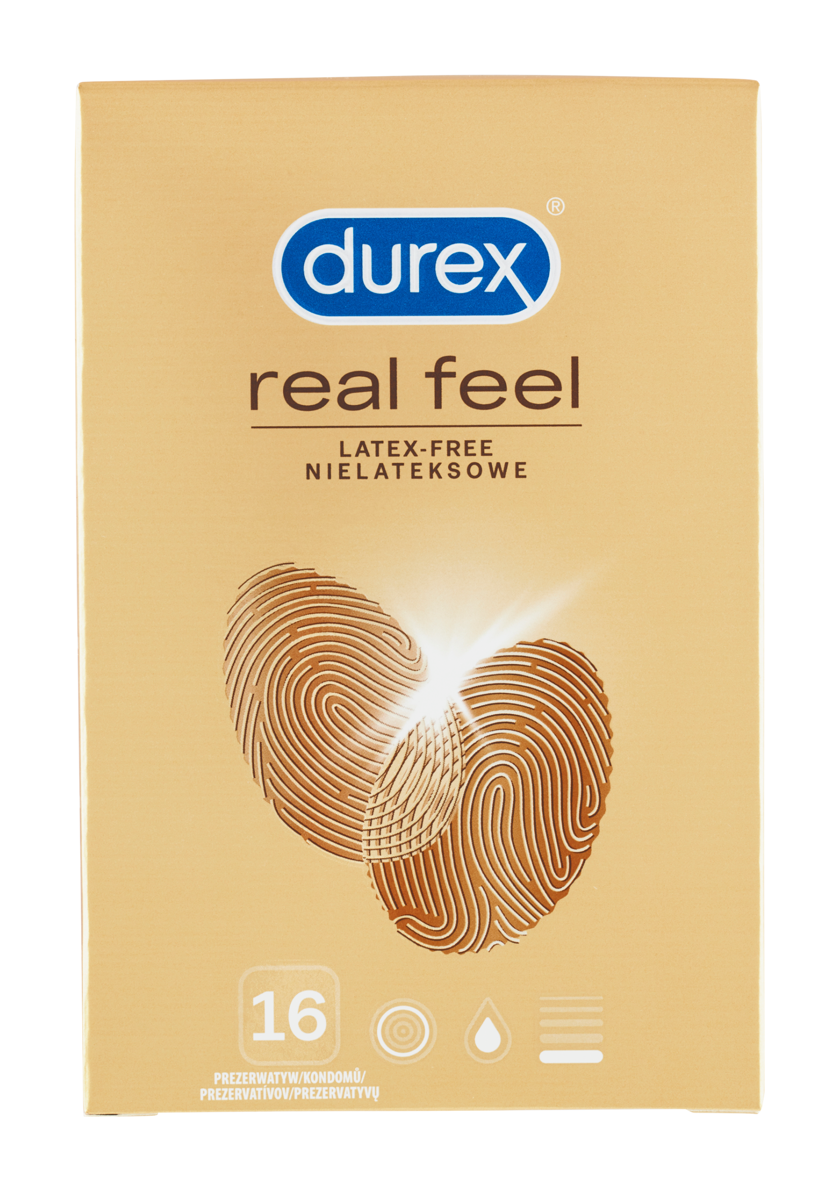 INFORMACE O KONDOMECH REAL FEEL A ALERGIÍCH NA LATEX: Kondomy Durex REAL FEEL jsou vyrobeny z polyisoprenu pro přirozený pocit kůže. Jedná se o bezlatexový materiál, který je vhodný i pro lidi, kteří mají alergii na proteiny přírodního latexu. Byly provedeny testy, které prokázaly, že při použití kondomů Durex Real Feel hrozí minimální riziko vyvolání pozdní přecitlivělosti (také označované "Alergie typu IV" a "alergické kontaktní dermatitidy”). Přesto někteří lidé mající alergii na latex mohou zaznamenat reakci i na tyto kondomy. Pokud cítíte podráždění nebo máte alergickou reakci, přestaňte je používat a kontaktujte svého lékaře. Pečlivě si přečtěte si návod na použití uvnitř krabičky, zejména pokud používáte kondomy pro anální nebo orální sex. Kondom je pouze na jedno použití. Žádná antikoncepční metoda Vám nemůže poskytnout 100% ochranu proti otěhotnění, HIV či jiným pohlavně přenosným chorobám. Uchovávejte mimo dosah dětí.