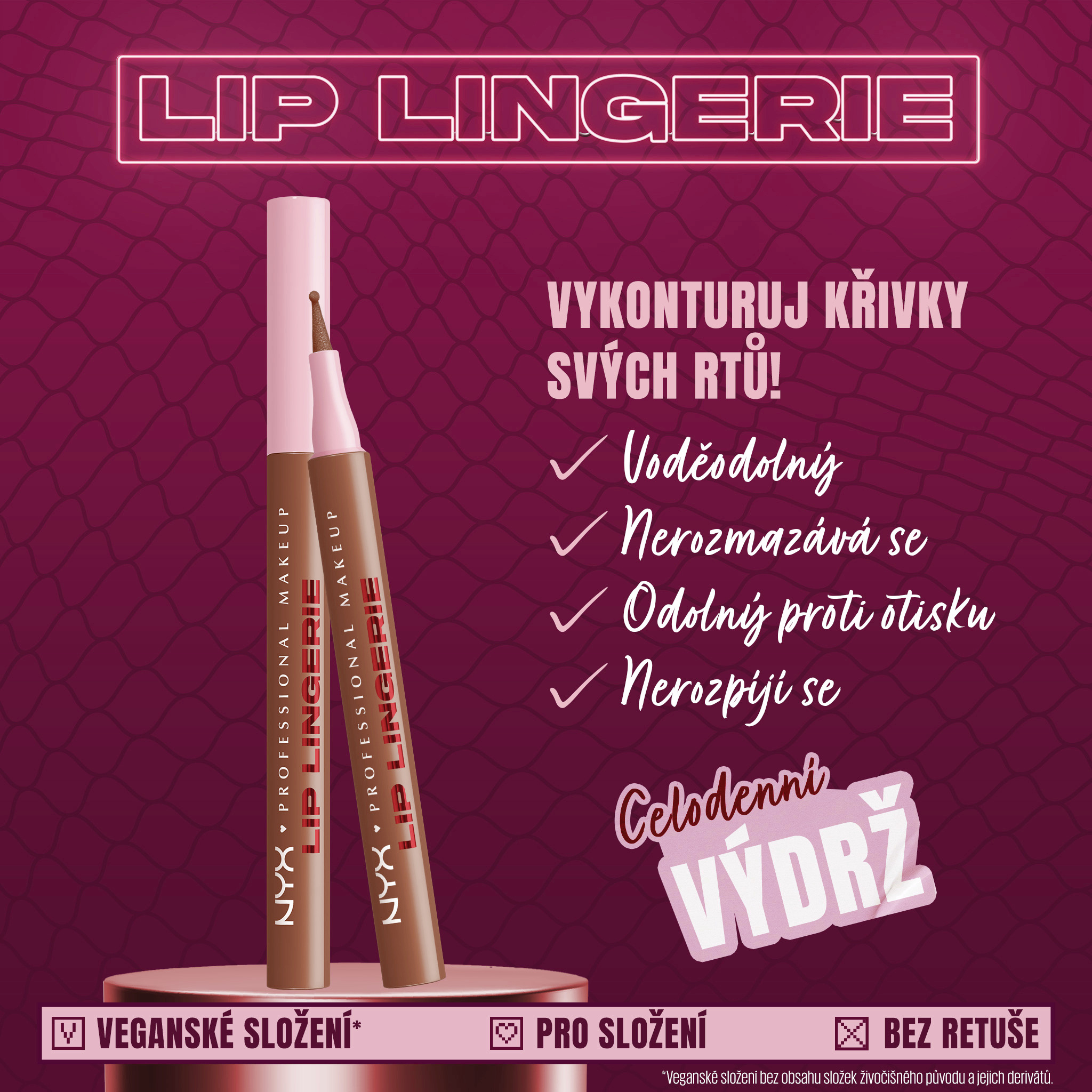 Tvarujte. Modelujte. Barvěte! Představujeme zcela nový konturovací fix na rty Lip Lingerie, který rty tvaruje, barví a vytváří nude odstín! Pusťte se do celodenního, nerozmazávajícího se, otěru-odolného a voděodolného zbarvení. Vykreslete rty s precizností krajky, konturujte pro vzhled plnějších rtů, nebo vyplňte křivky svých rtů pomocí všestranného plstěného hrotu s kuličkou – navrženého tak, aby obepnul každou křivku. Rozmažte jakékoli ostré linky pro bezchybně vymodelované rty, bez rozmazávání! Pohodlná a lehká tekutá linka splyne s vašimi rty jako hedvábí. K dispozici v několika sexy nude odstínech, které zvýrazní rty a vytvoří "vaše, ale lepší" rty. Od sotva znatelných po hluboké a výrazné, najděte si odstín, který je pro vás ideální! Kombinujte s jakýmkoli z našich ikonických produktů na rty pro dokonalé combo. Není potřeba žádné slupování. Vklouzněte do linek, které vydrží, s konturovací tužkou na rty Lip Lingerie, která rty tvaruje a barví.