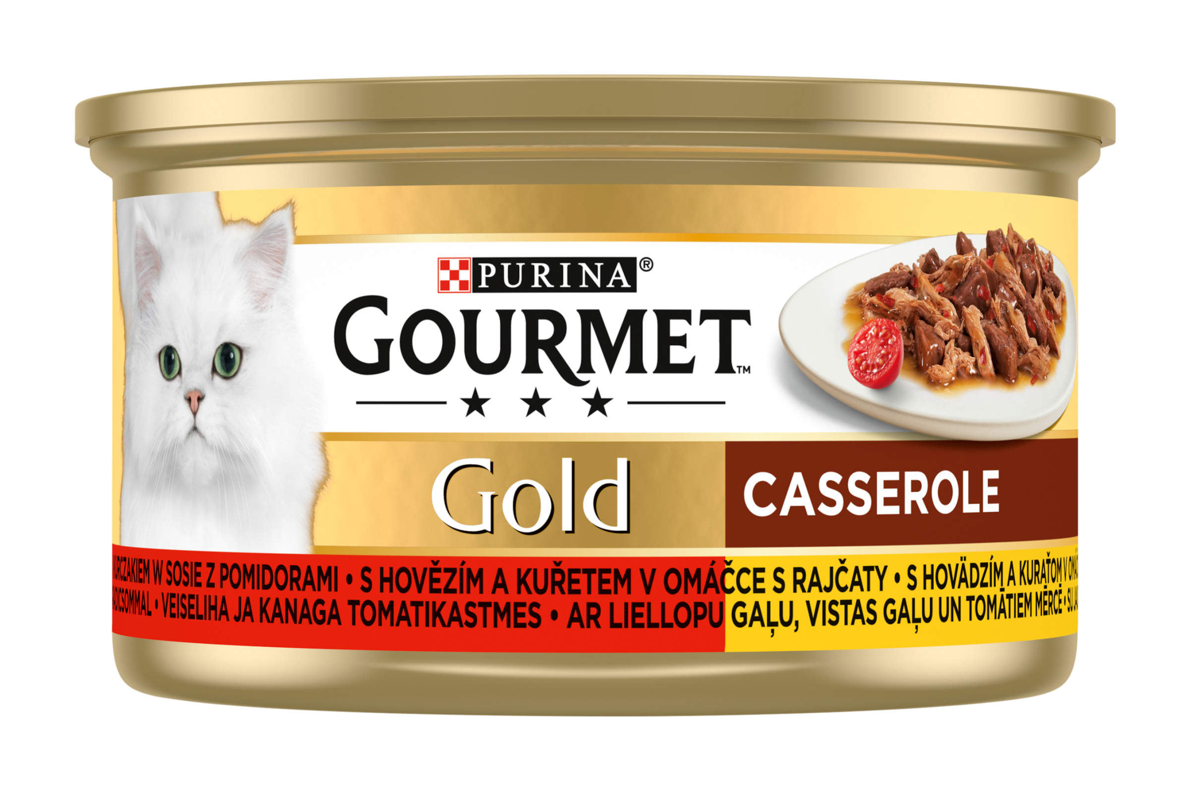 GOURMET Gold Casserole jsou lahodná krmiva s jemnými kousky s hovězím a kuřetem, nebo kachnou a krůtou, šetrně povařené v lahodné omáčce. Každá omáčka je pečlivě vybrána tak, aby spolu s danou chutí a texturou kousků vytvořila dokonalou harmonii. Všechna krmiva GOURMET Gold jsou vyrobena z vysoce kvalitních surovin a jsou bez přidaných barviv a umělých konzervantů.