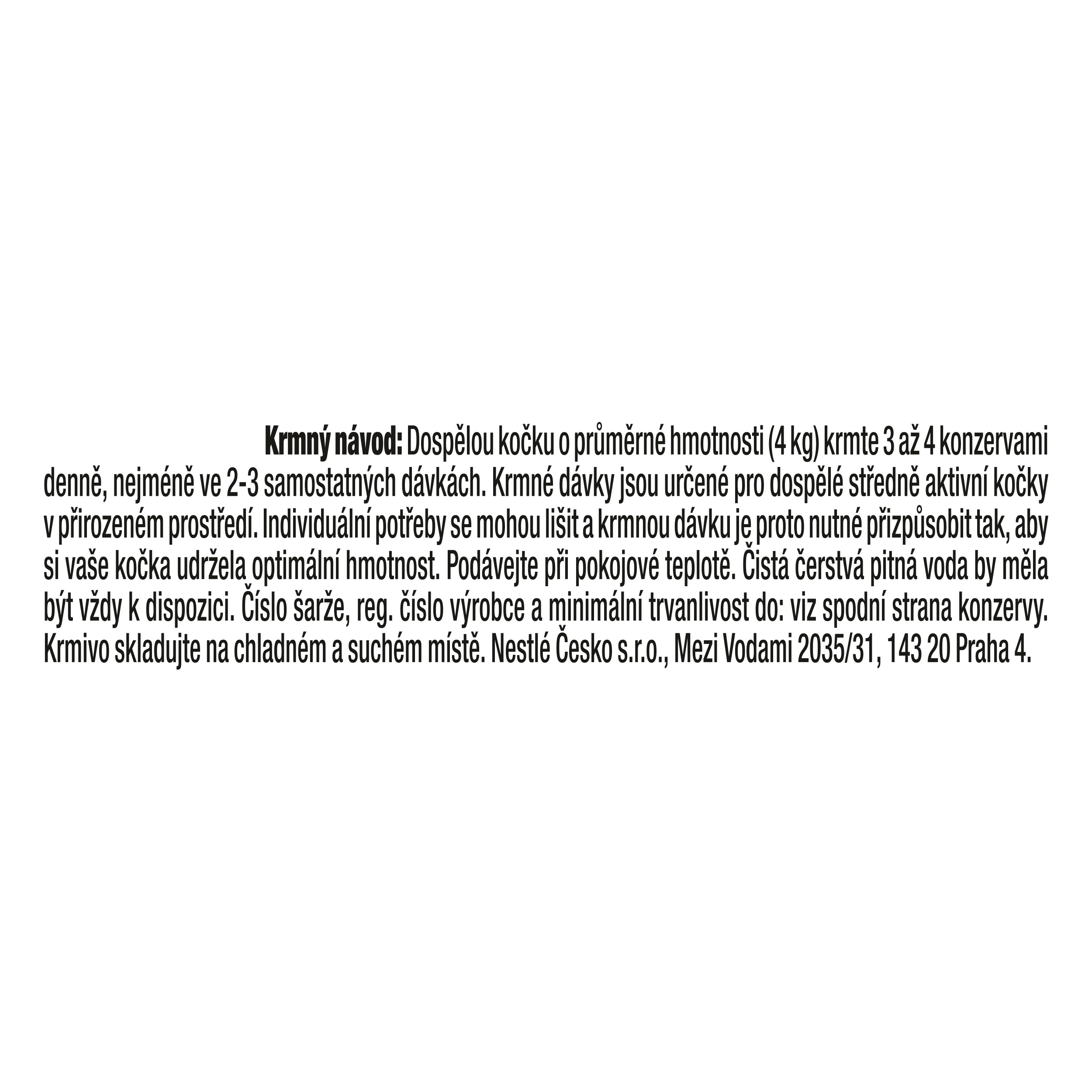 Krmný návod: Dospělou kočku o průměrné hmotnosti (4 kg) krmte 3 - 4 konzervami denně, nejméně ve 2 - 3 samostatných dávkách. Krmné dávky jsou určené pro dospělé středně aktivní kočky v přirozeném prostředí. Individuální potřeby se mohou lišit a krmnou dávku je proto nutné přizpůsobit tak, aby si vaše kočka udržela optimální hmotnost. Podávejte při pokojové teplotě. Čistá čerstvá pitná voda by měla být vždy k dispozici.