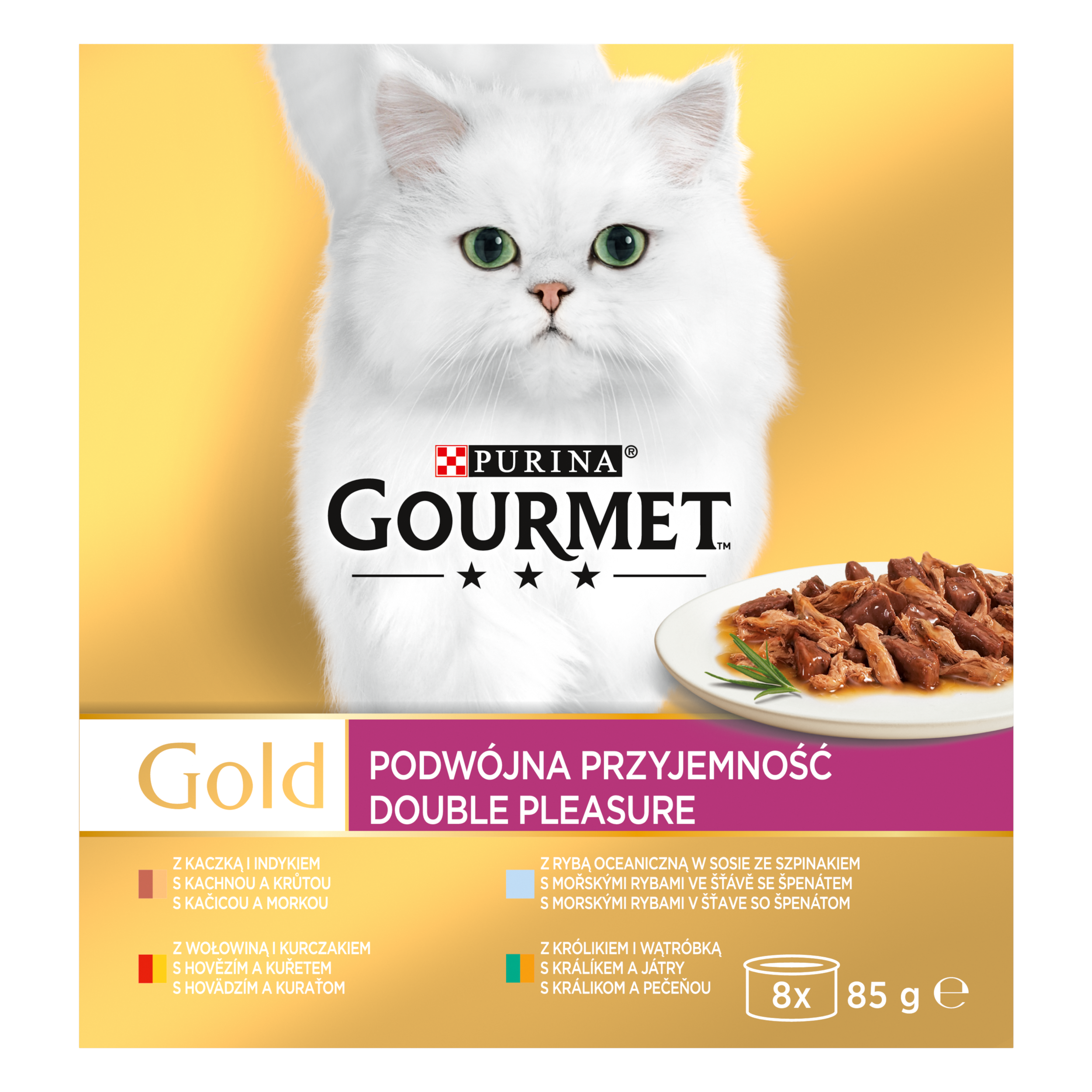 GOURMET GOLD Double Pleasure s hovězím a kuřetem, s kachnou a krůtou, s mořskými rybami ve šťávě se špenátem, s králíkem a játry