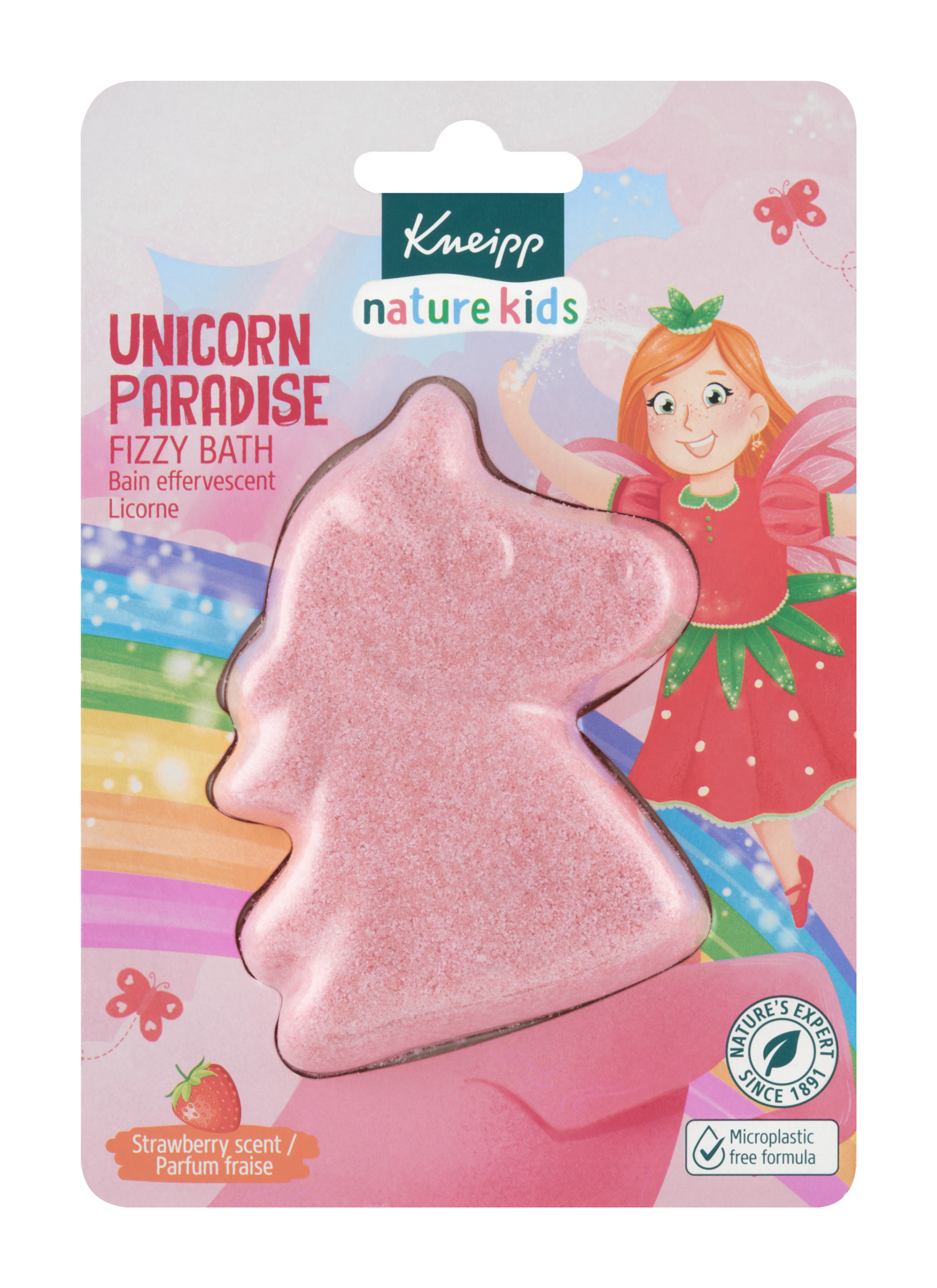 Péče o dětskou pokožku nikdy nebyla zábavnější. S růžovou Kenipp Koupelovou bombou Jednorožec z koupání uděláte rituál, na který se každá slečna bude těšit už od rána. Jako by vplula přímo do pohádky s jahodovou vůní. Koupel se navíc díky avokádovému oleji a hroznovým jádrům postará o její jemnou pokožku a zabrání nežádoucímu vysoušení. Výrobek je vhodný pro děti od 3 let.