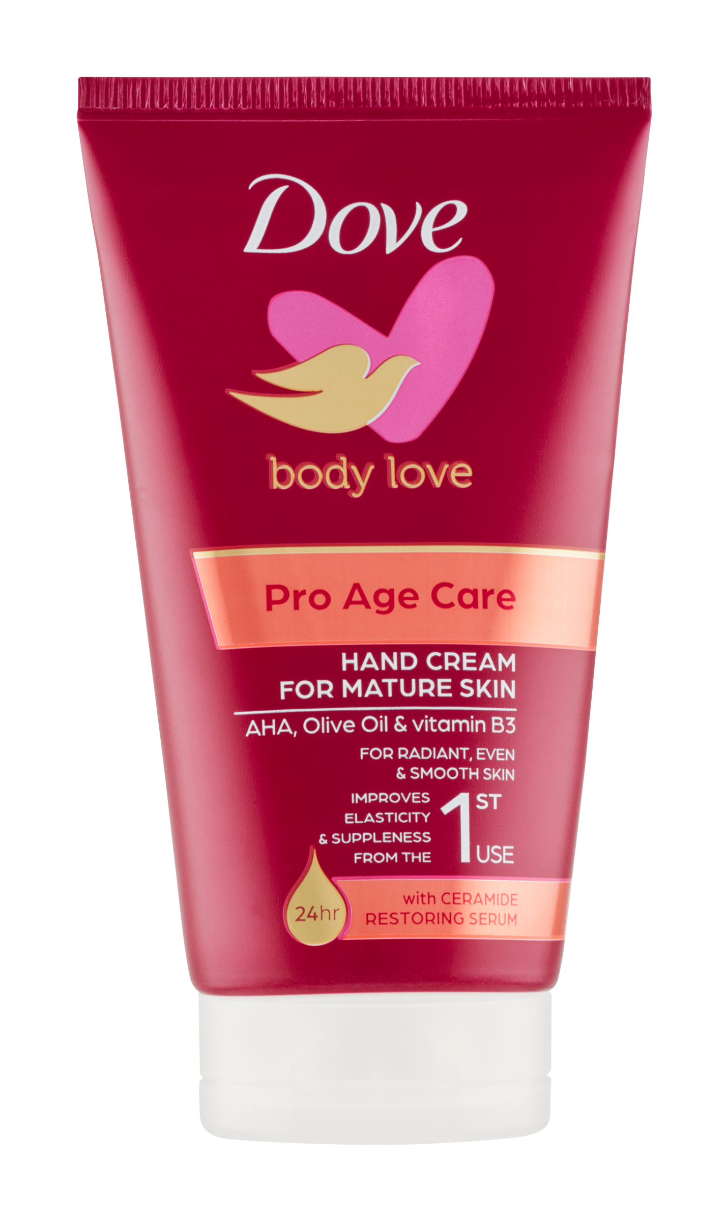 Dove Pro Age krém na ruce obsahuje AHA kyseliny, olivový olej a vitamín B3. Tato jedinečná kombinace složek napomáhá pokožce nastartovat přirozený obnovující proces. -