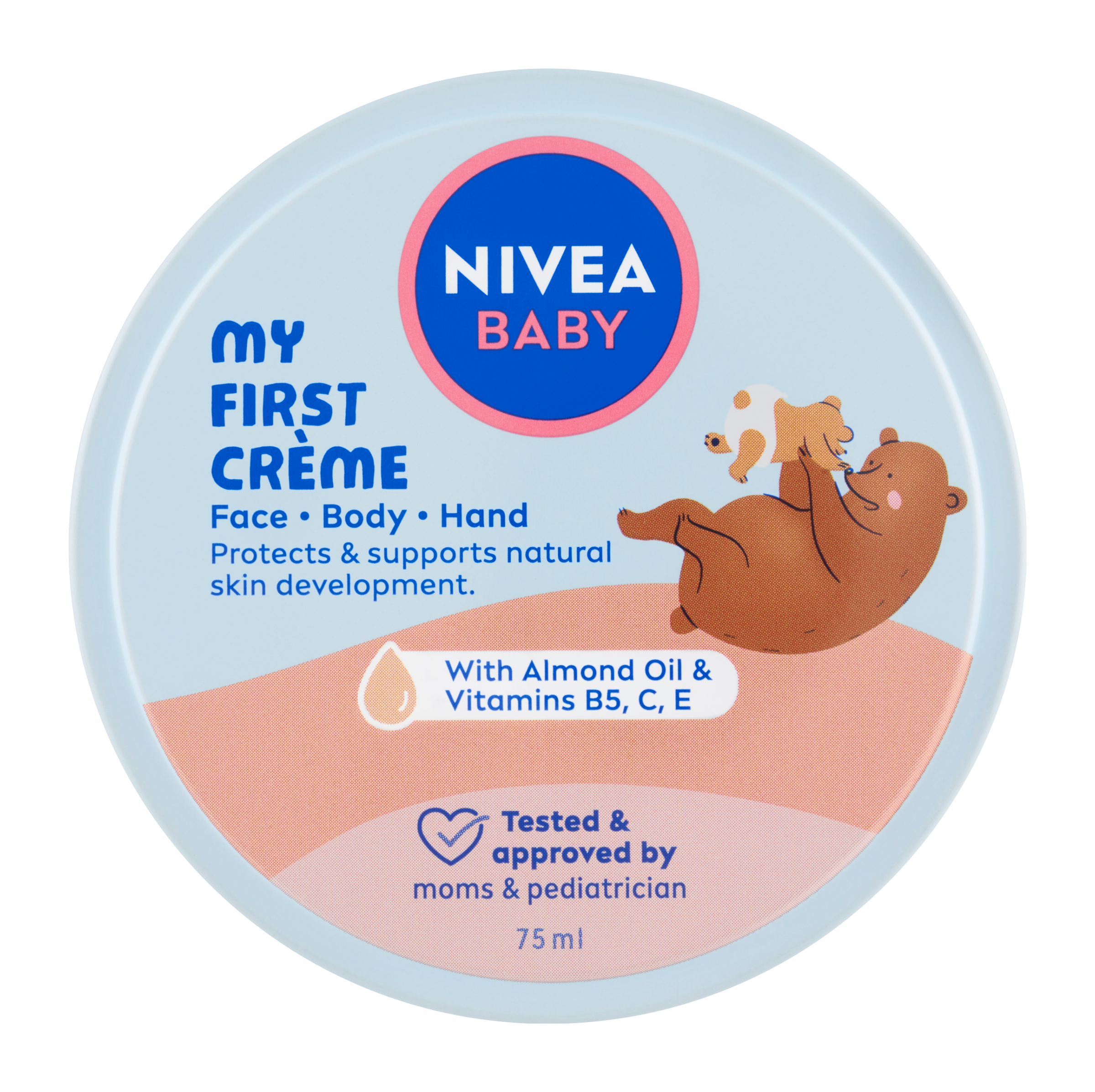 Nivea® Baby Krém na tvář, tělo a ruce se 100 % přírodním mandlovým olejem a vitamíny B5, C a E pomáhá chránit a posilovat dětskou pokožku.