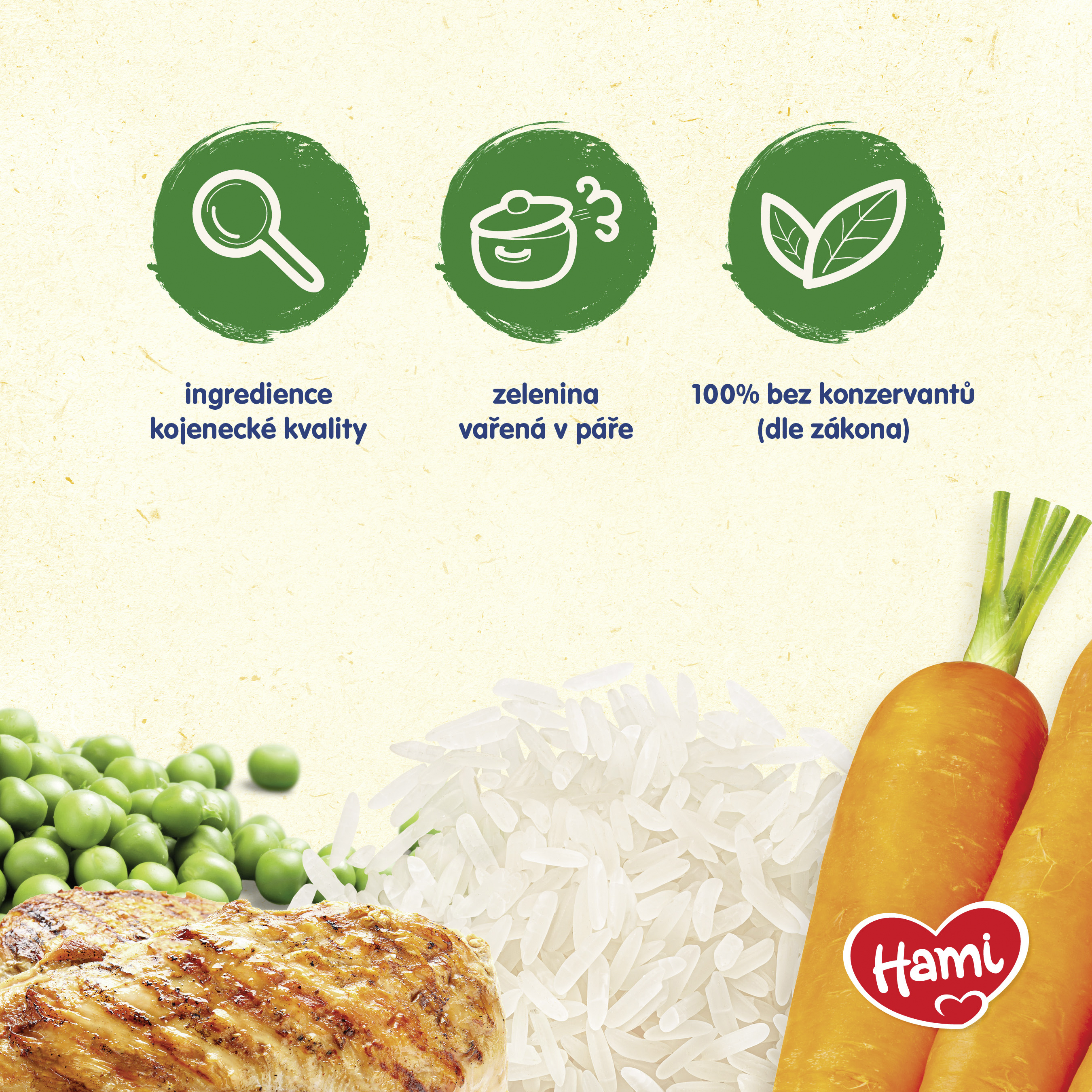 Konzistence Hami příkrmů v talířku podporuje rozvoj kousání prvními zoubky. Hami příkrm obsahuje zeleninu připravovanou na páře, čímž neztratí důležité vitamíny a zachová si vynikající chuť. Vysoká kvalita ingrediencí je v Hami příkrmech na prvním místě. Šťavnaté masíčko pochází z pečlivě kontrolovaných surovin. Proč si děti zamilují příkrm Hami v talířku? S Hami může mít každé dítko svůj mini talířek s chutným obědem či večeří a cítit se jako 'dospělák'. Navíc děťátko rozvíjí motoriku, což ocení maminky a tatínkové. Děti si Hami příkrm zamilují pro lahodnou chuť a maminky pro praktičnost produktu.
