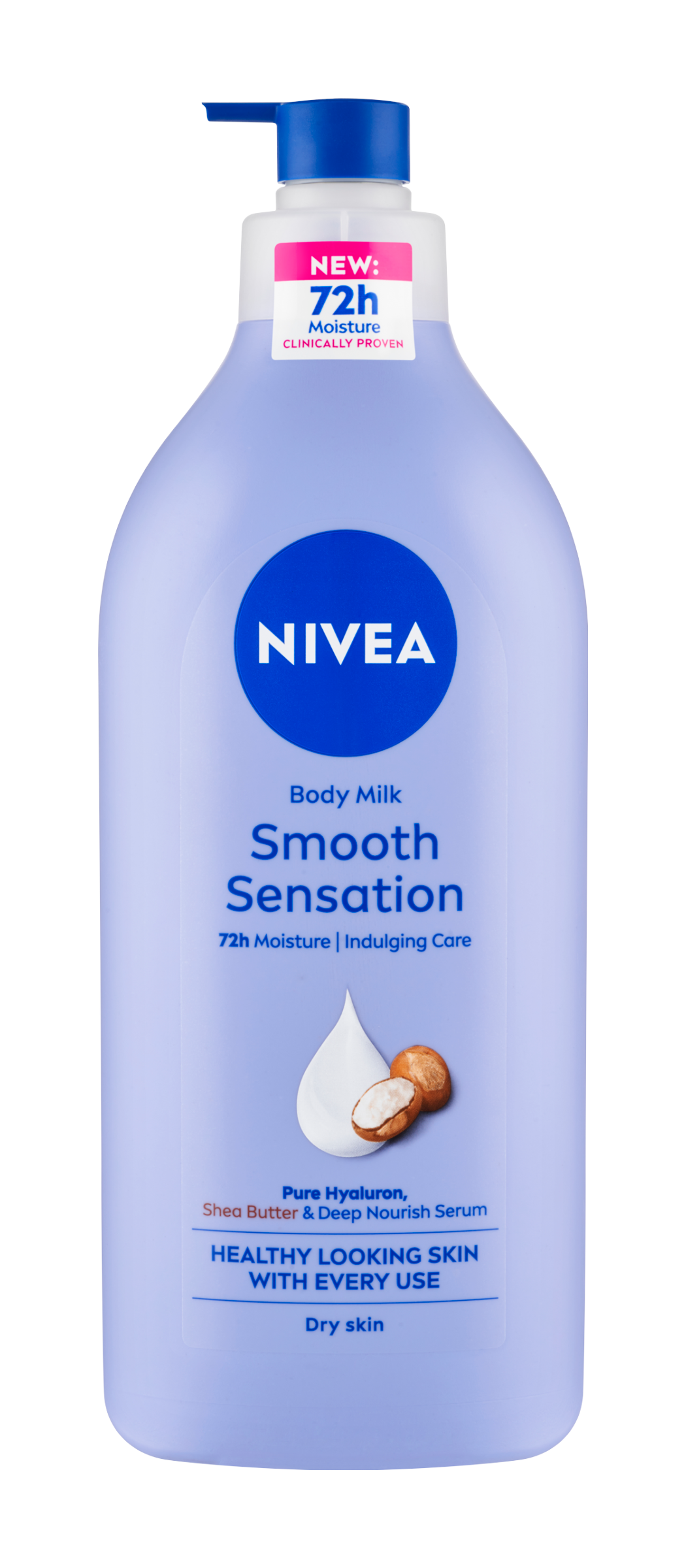 Nivea® Krémové tělové mléko Smooth Sensation hloubkově hydratuje suchou pokožku po 72 hodin. Rychle se vstřebávající a nemastné složení je obohacené o čistou kyselinu hyaluronovou, bambucké máslo a hloubkově vyživující sérum.