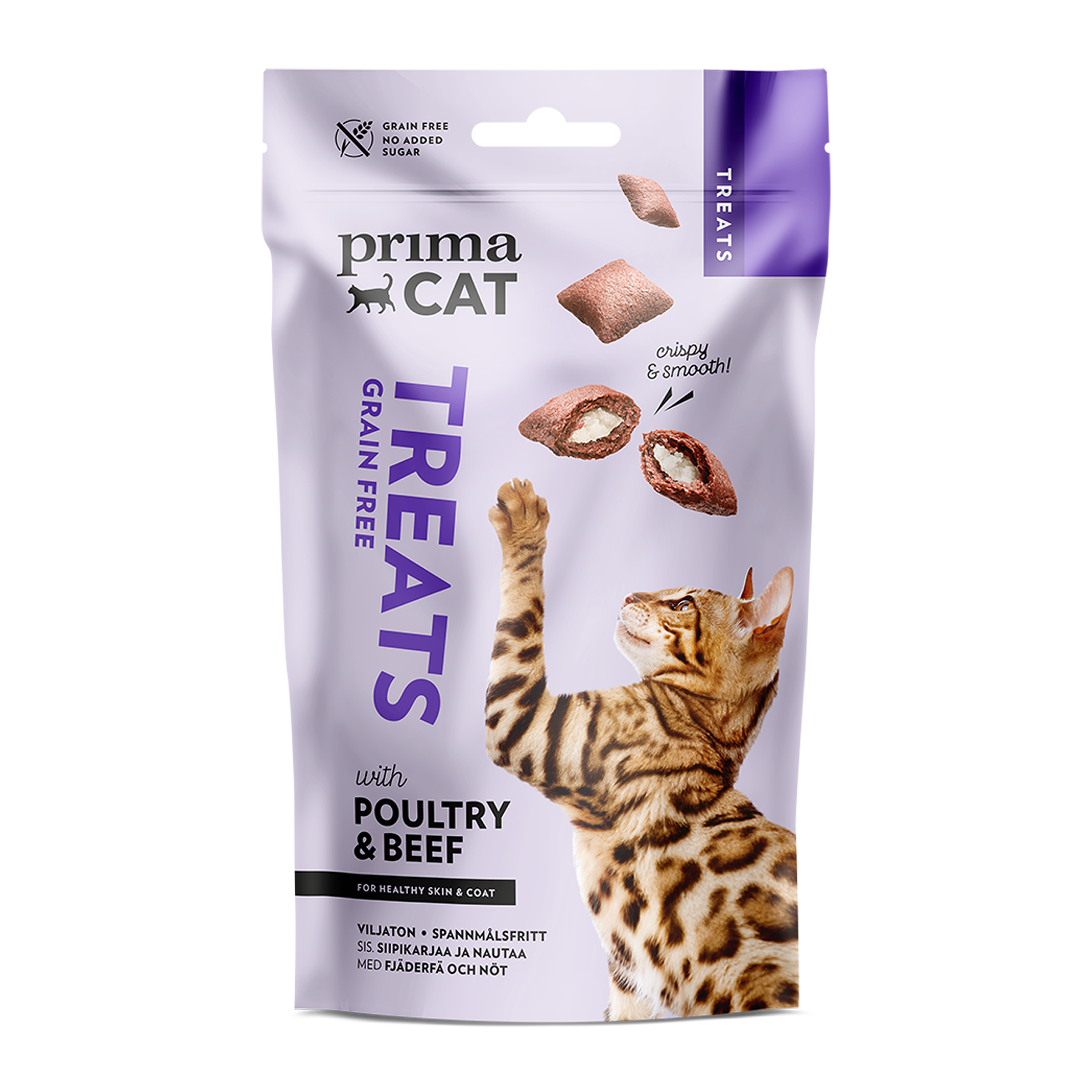 Křupavé kapsičky PrimaCat pro zdravou kůži a srst jsou výtečné drůbeží a hovězí pamlsky s křupavým povrchem a měkkou náplní, díky které jsou neodolatelně lahodné. Lososový olej v kapsičce podporuje zdravou kůži a srst koček a přidané vitamíny a nezbytný taurin podporují celkové zdraví kočky. Tyto výtečné kousky zbožňované kočkami nikdy neobsahují obiloviny, jsou tedy vhodné i pro kočky alergické na obiloviny. Výrobky PrimaCat nikdy neobsahují přidaný cukr. Vyrobeno v Evropě.