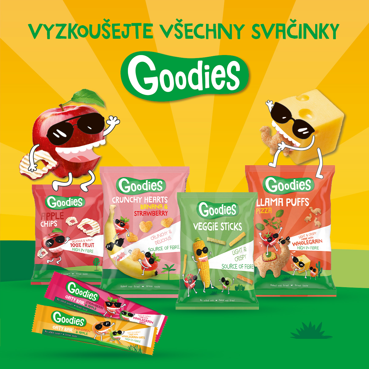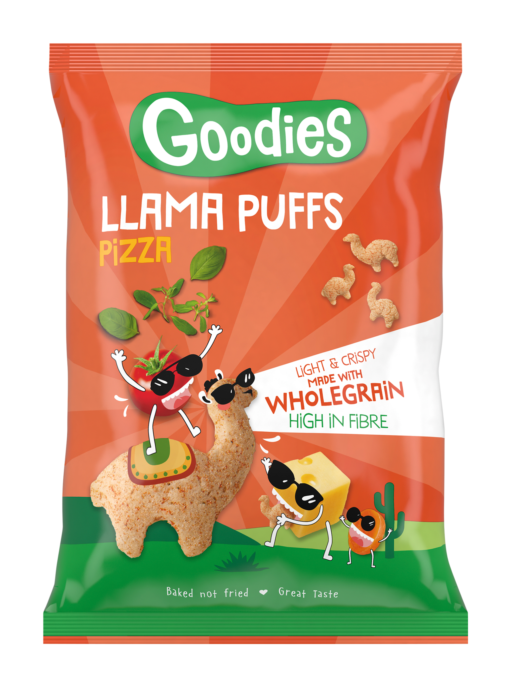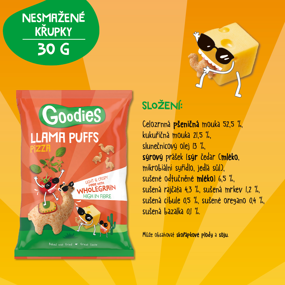 Goodies Llama křupky pizza z celozrnné mouky a s vysokým obsahem vlákniny. NEsmažené a plné skvělé chuti. Křupavá svačinka ideální na cesty nebo do svačinkových boxíků. Goodies Llama křupky pizza obsahují samé dobré ingredience. NEsmažené křupky s vysokým obsahem vlákniny a celozrnnou moukou. Zábavné tvary zvířátek a skvělá chuť, která bude děti bavit. Proč si vybrat Goodies křupky: