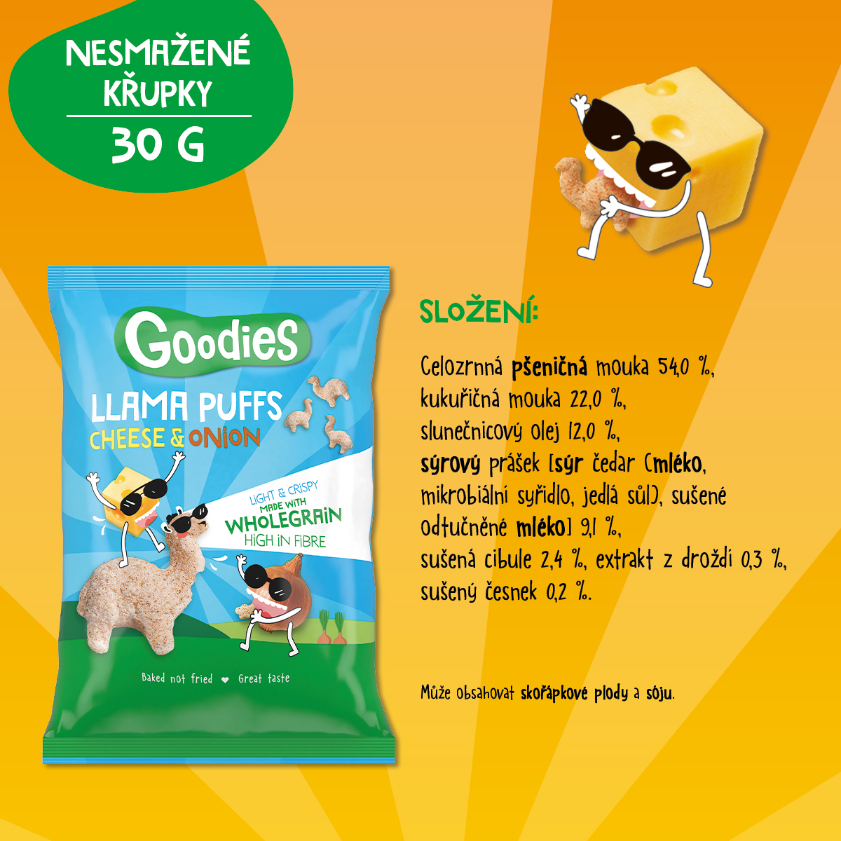 Celozrnná pšeničná mouka 54,0 %, Kukuřičná mouka 22,0 %, Slunečnicový olej 12,0 %, Sýrový prášek [sýr čedar (mléko, mikrobiální syřidlo, jedlá sůl), sušené odtučněné mléko] 9,1 %, Sušená cibule 2,4 %, Extrakt z droždí 0,3 %, Sušený česnek 0,2 %
