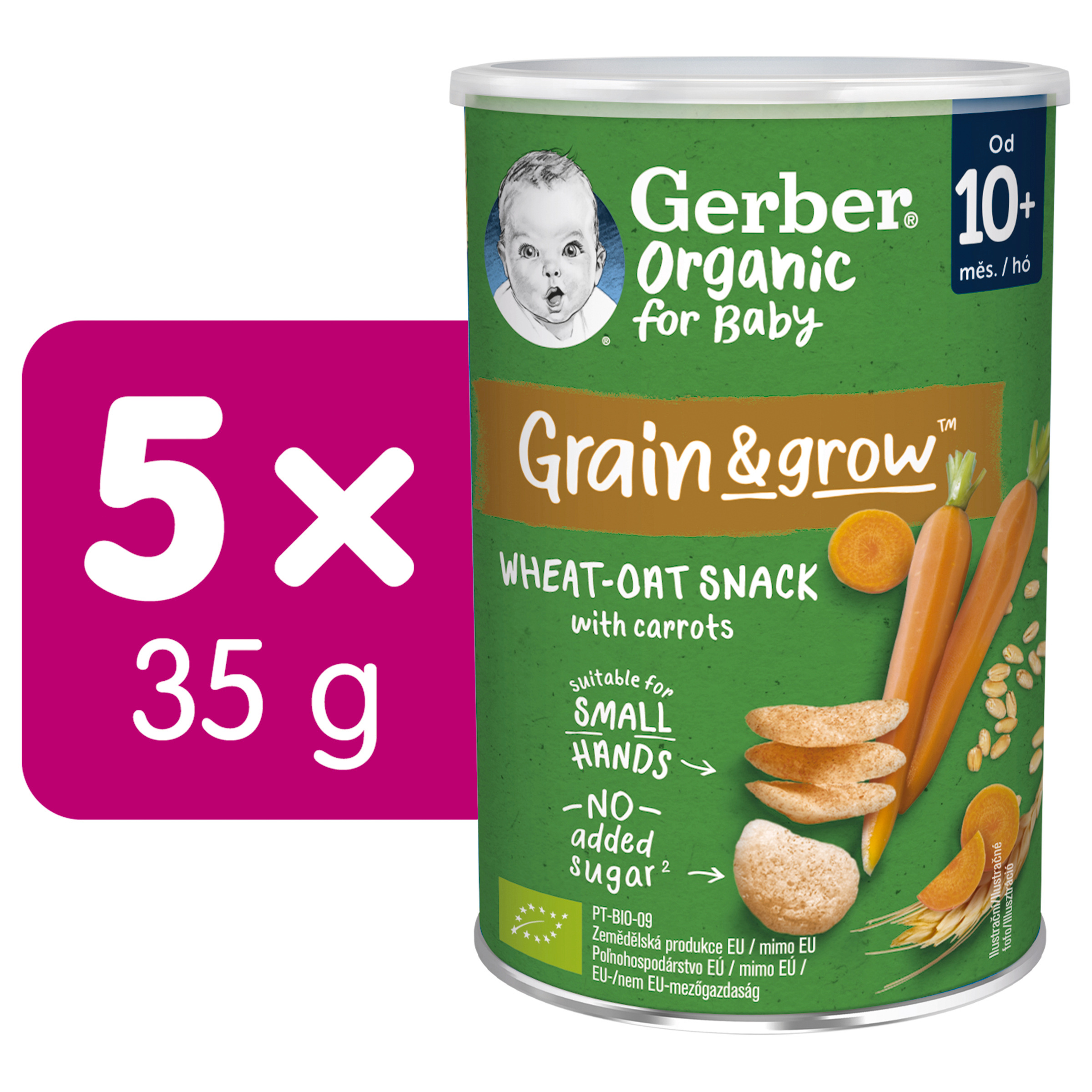 Gerber Organic křupky s mrkví jsou křehké a nadýchané křupky pro malé děti vhodné od ukončeného 10. měsíce. Křupky jsou speciálně navrženy tak, aby odpovídaly potřebám vašich ratolestí. Skvěle padnou do ruček malých strávníků a pobízí i ty nejmenší k samostatnosti při jídle. Hravý tvar skvěle padnoucí do malých ruček vede k rozvoji jemné motoriky. Každá křupka obsahuje kombinaci obilovin a mrkve pěstovaných na certifikovaných organických farmách, kde se bere ohled na přirozený způsob pěstování a dozrávání všech plodin. Grain&Grow přináší do ručky vašeho děťátka to nejlepší ze světa obilovin a výživy. Vaše ratolesti si užijí přirozeně lahodnou chuť křupek, které jsou bez přidaných cukrů*, konzervantů a barviv**. Křupky jsou extrudované. Díky tomu mají křehkou texturu, která se snadno rozplývá v ústech. Jsou skvělým řešením i jako chutná svačinka pro první zoubky.