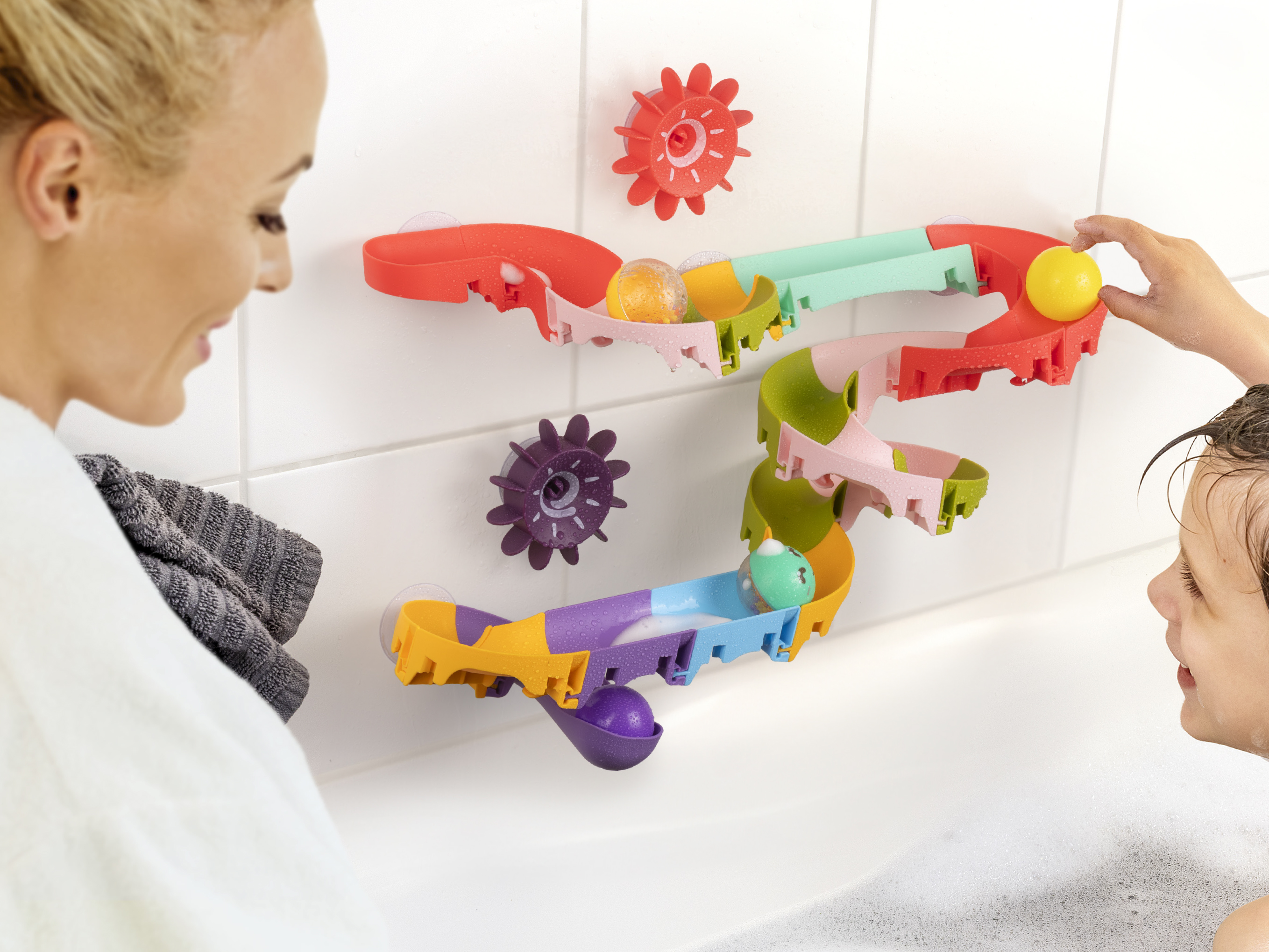Proměňte koupelnu v zábavný vodní svět. Tato 35dílná vodní dráha přináší dětem nekonečné možnosti hry a objevování. Flexibilní díly se pomocí přísavek snadno připevní na koupelnové dlaždice, takže si mohou malí stavitelé vytvořit vlastní trasu vždy podle nálady.