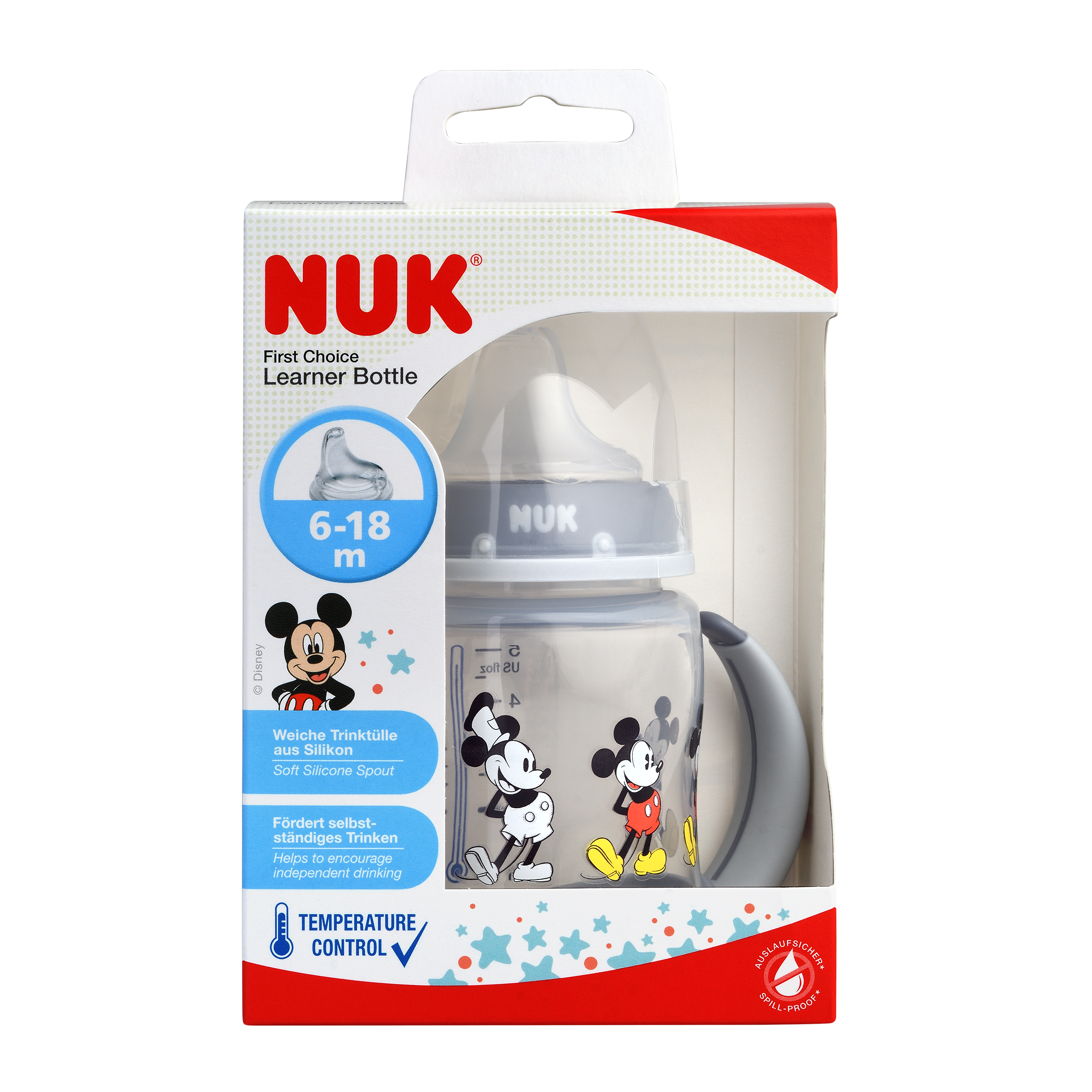 Řada NUK s oblíbenými Disney postavičkami Mickey Mouse a Minnie Naše dětské lahvičky na učení s Mickey Mousem a Minnie pomáhají dětem naučit se samostatně pít. Klasické moderní vzory zdobí dětské lahvičky na učení NUK a potěší malé i velké fanoušky Disneyho pohádek. Ponořte se do jedinečného světa Mickeyho a Minnie! Dětská lahvička na učení NUK First Choice s kontrolou teploty To je dobrý pocit! Když nastane shon a zmatek, je dobré vědět, že nejste na všechno sama. Když se z miminka stane batole, dětská lahvička NUK First Choice s kontrolou teploty pomůže bezproblémovému přechodu k samostatnému pití. Dětská lahvička na učení NUK First Choice s kontrolou teploty ukáže, kdy má obsah láhve tu správnou teplotu – máte tak jistotu, že nápoj vašeho dítěte není příliš horký. Pokud je nápoj příliš horký, modrá barva indikátoru se změní na bílou. Tekutina by měla mít ideálně tělesnou teplotu (37 °C = středně modrý odstín). Pozor: NUK kontrola teploty je určena pro dodatečnou kontrolu. Proto před podáním nápoje dítěti teplotu znovu zkontrolujte. S vysoce kvalitním silikonovým pítkem Dětská lahvička na učení NUK First Choice má měkké silikonové pítko, které je příjemně měkké a nekapající. Integrovaný antikolikový systém NUK vyrovnává tlak v lahvičce a tím, že dítě spolyká méně vzduchu, pomáhá snižovat riziko koliky. Průhledný silikon se snadno čistí a je obzvláště odolný vůči teplu. Neobsahuje škodlivé látky, je možné ho vyvařit, je bez zápachu, průhledný a má hladký povrch – všechny vlastnosti, které jsou pro pítko důležité. Jednoduché čištění a ideální pro přípravu výživy.
