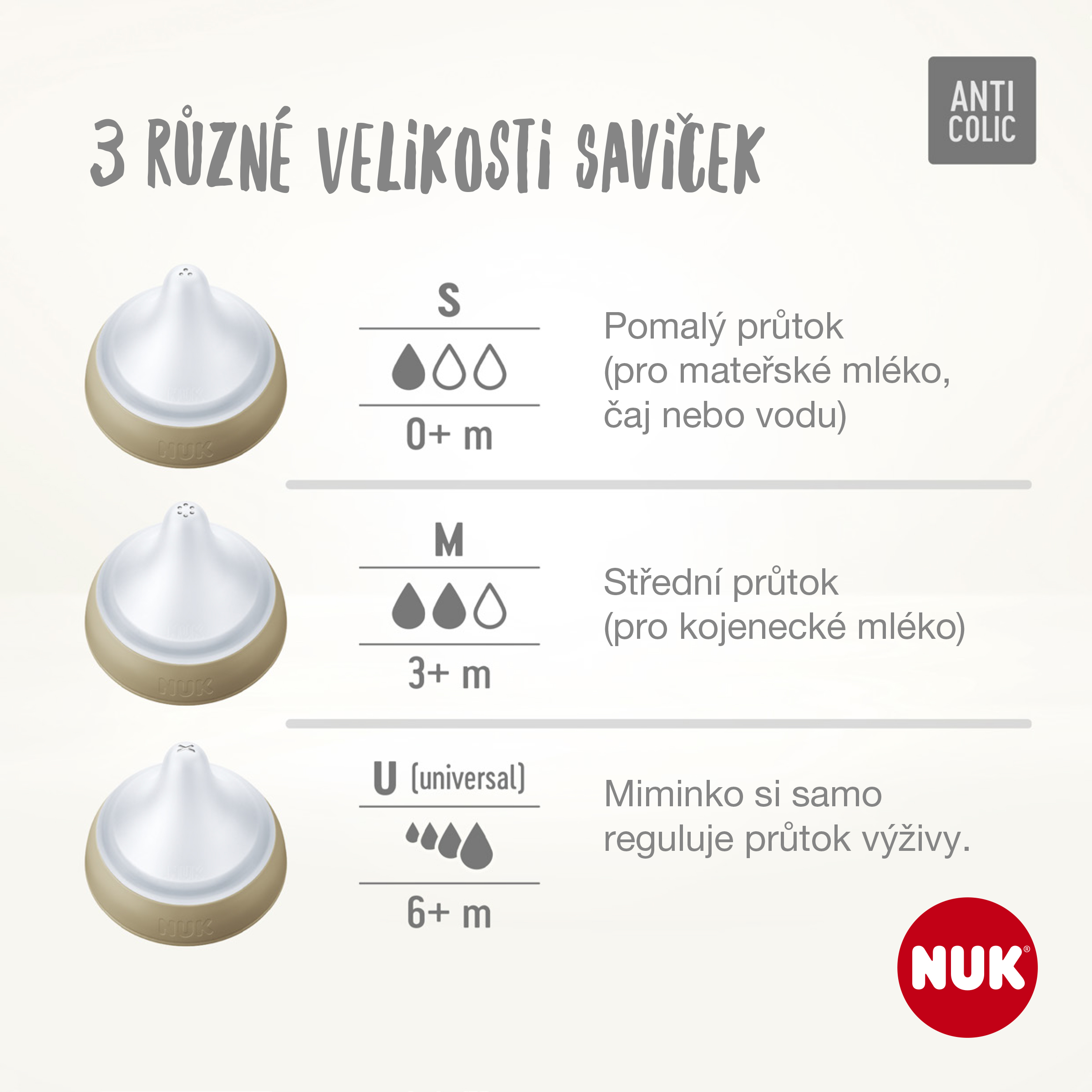 Důležité upozornění: Kojení je to nejlepší pro kojence. Příprava: Při přípravě jídla nebo čaje vždy dbejte na teplotní doporučení jejich výrobce. Aby byly zachovány vitamíny a živiny, teplota by neměla přesáhnout 60 °C. Láhve naplněné jídlem nebo vodou nedávejte do mikrovlnky (riziko exploze/poškození materiálu). Nerovnoměrné ohřátí může způsobit popálení! Nikdy neohřívejte uzavřené láhve, mohly by explodovat! Nezchlazujte uzavřené PP láhve, které byly právě naplněny horkou tekutinou (> 80° C), láhev by se mohla zdeformovat. Před prvním použitím dejte na 5 minut do vařící vody, použijte dostatečné množství vody, abyste předešli poškození výrobku. Pro zajištění hygieny, před každým použitím umyjte jemným mycím prostředkem a sterilizujte. Před sterilizací varem i párou (teplota nad 80 °C) vždy láhev rozmontujte a nechte otevřenou, jinak by se mohla deformovat. Savičky a láhve nepatří do myčky na nádobí - mycí prostředky do myčky mohou poškodit materiál. Pozor: NUK láhev s kontrolou teploty je určena pro dodatečnou kontrolu. Před krmením je teplotu nutné zkontrolovat i ručně. Chcete-li zkontrolovat teplotu, doporučujeme nakapat několik kapek obsahu láhve na vnitřní zápěstí.