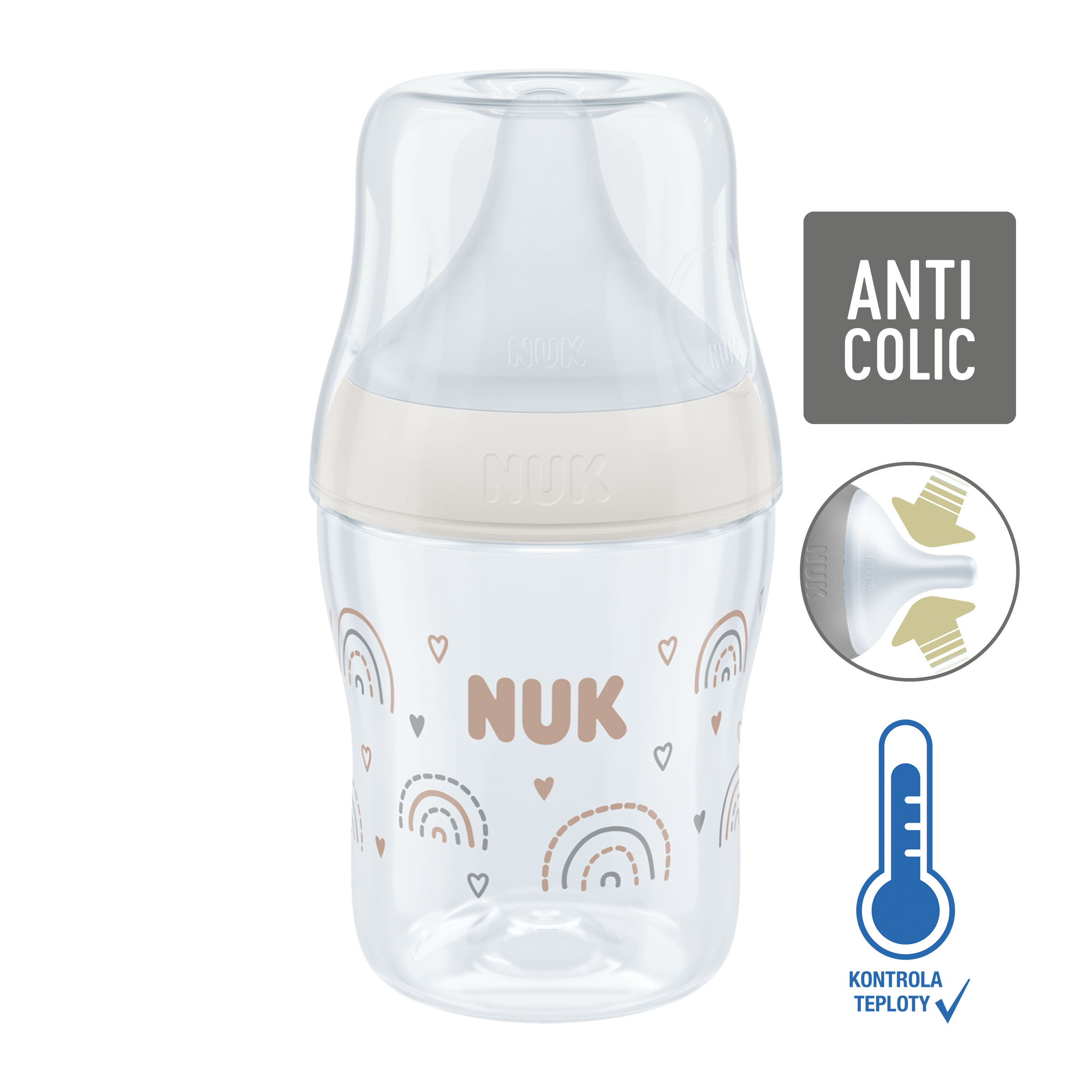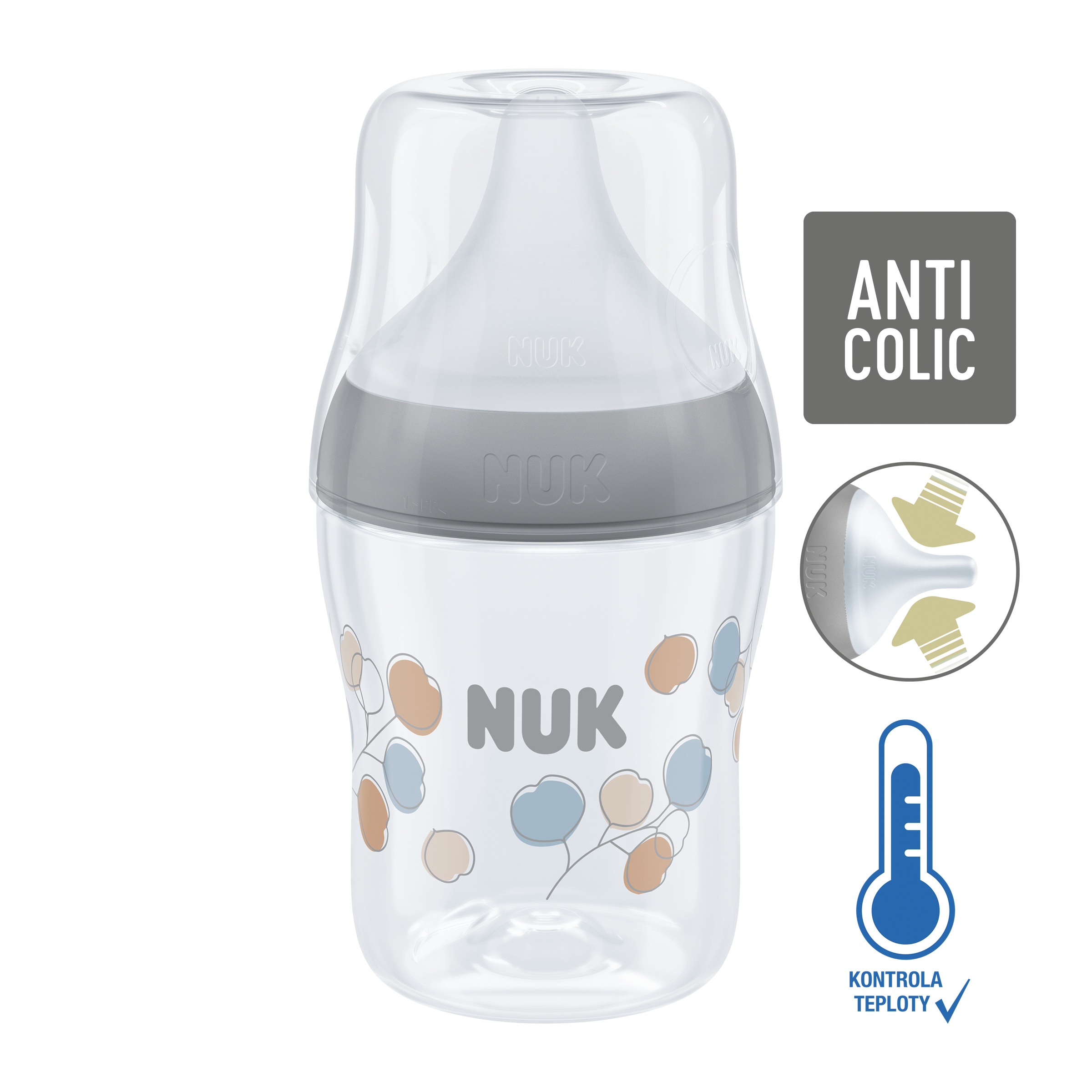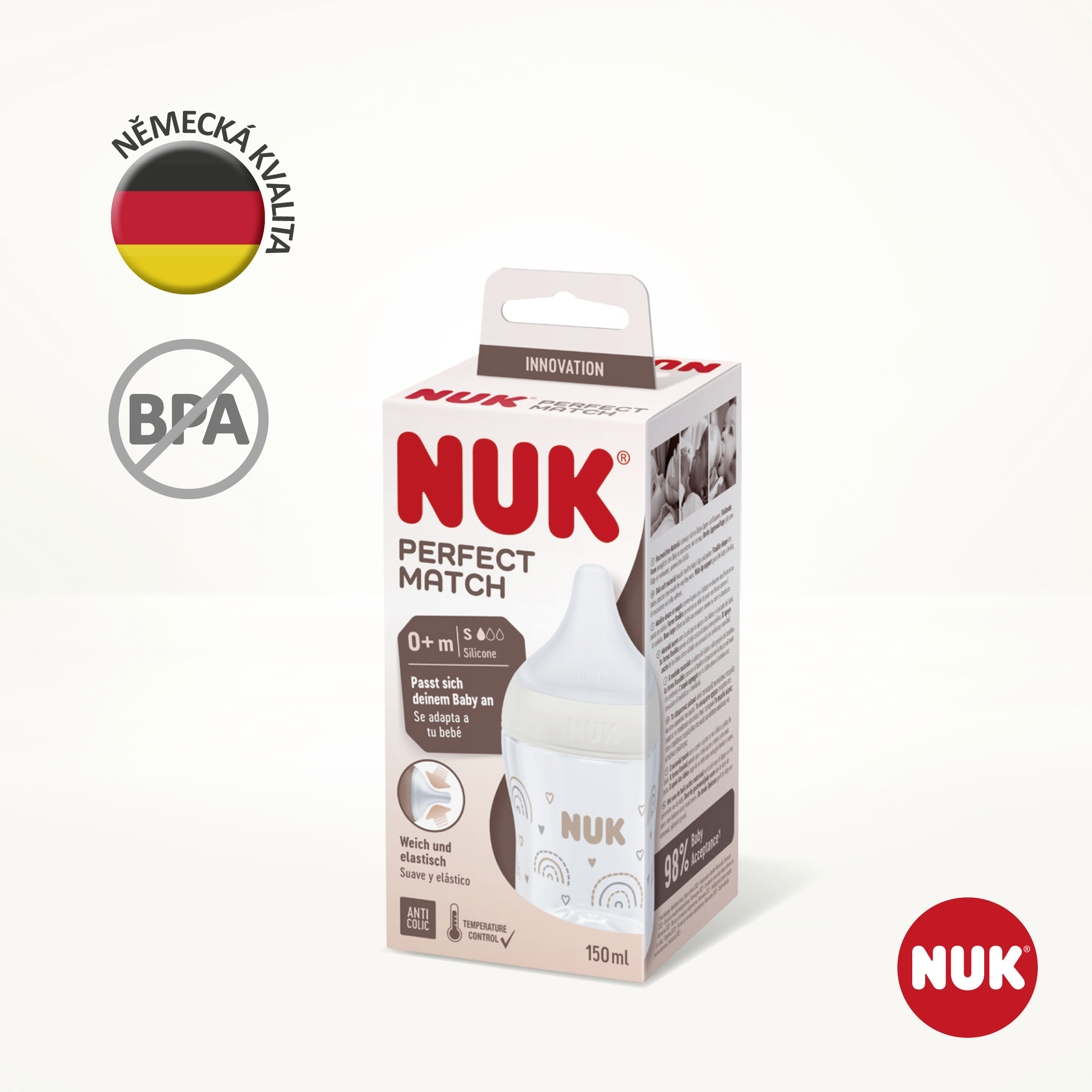 Kojenecká láhev NUK Perfect Match, s měkkou silikonovou savičkou, 150 ml, od narození, neobsahuje BPA, antikolikový systém, s kontrolou teploty.