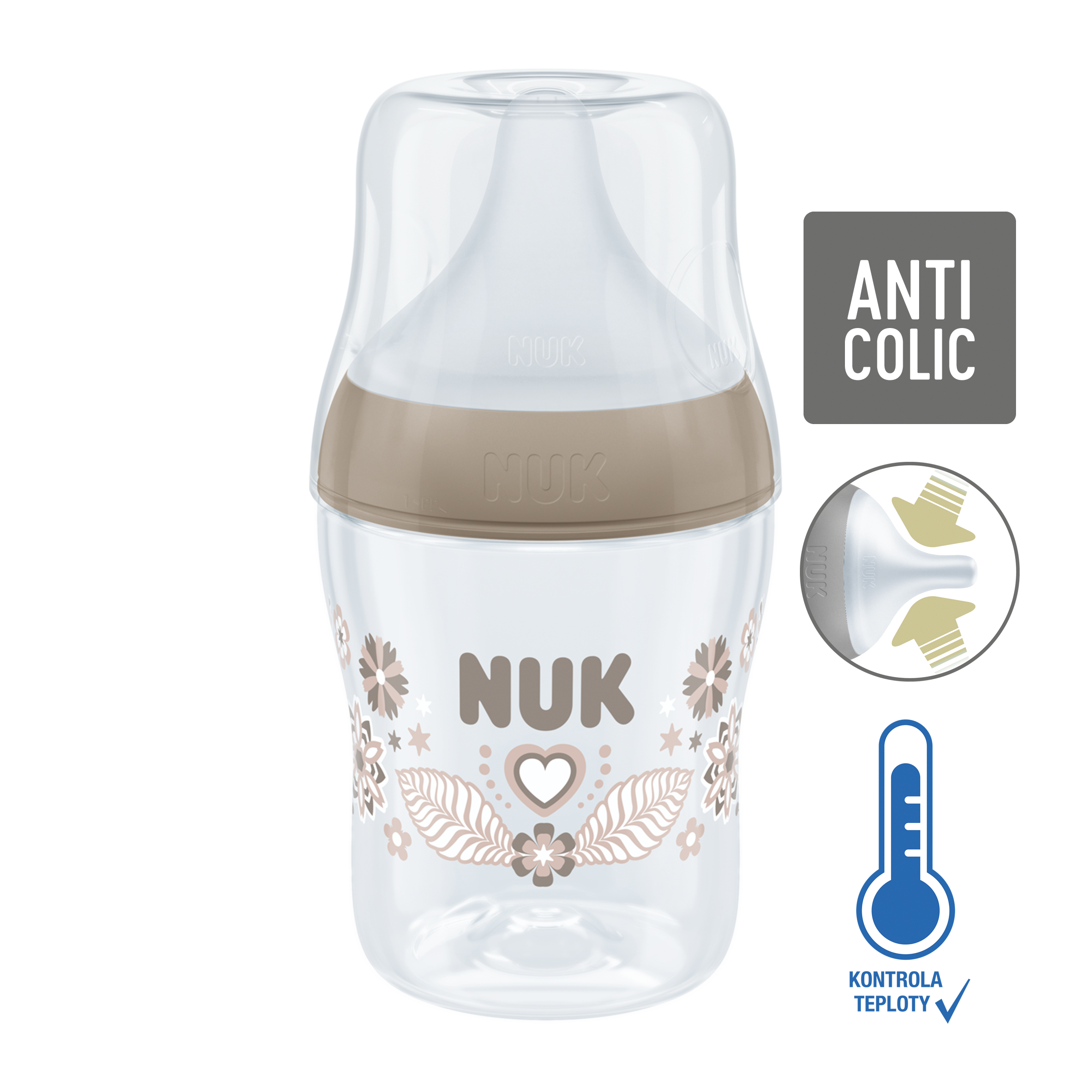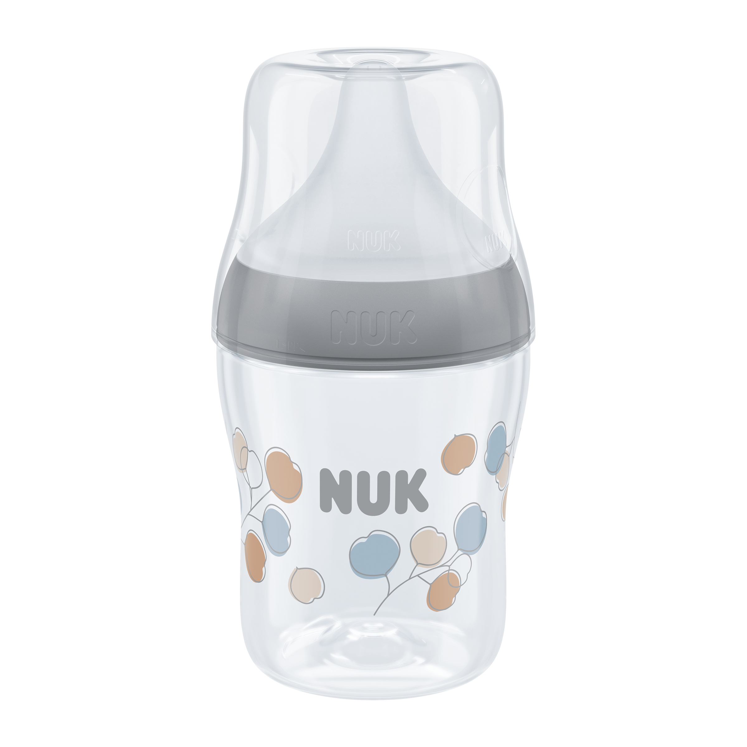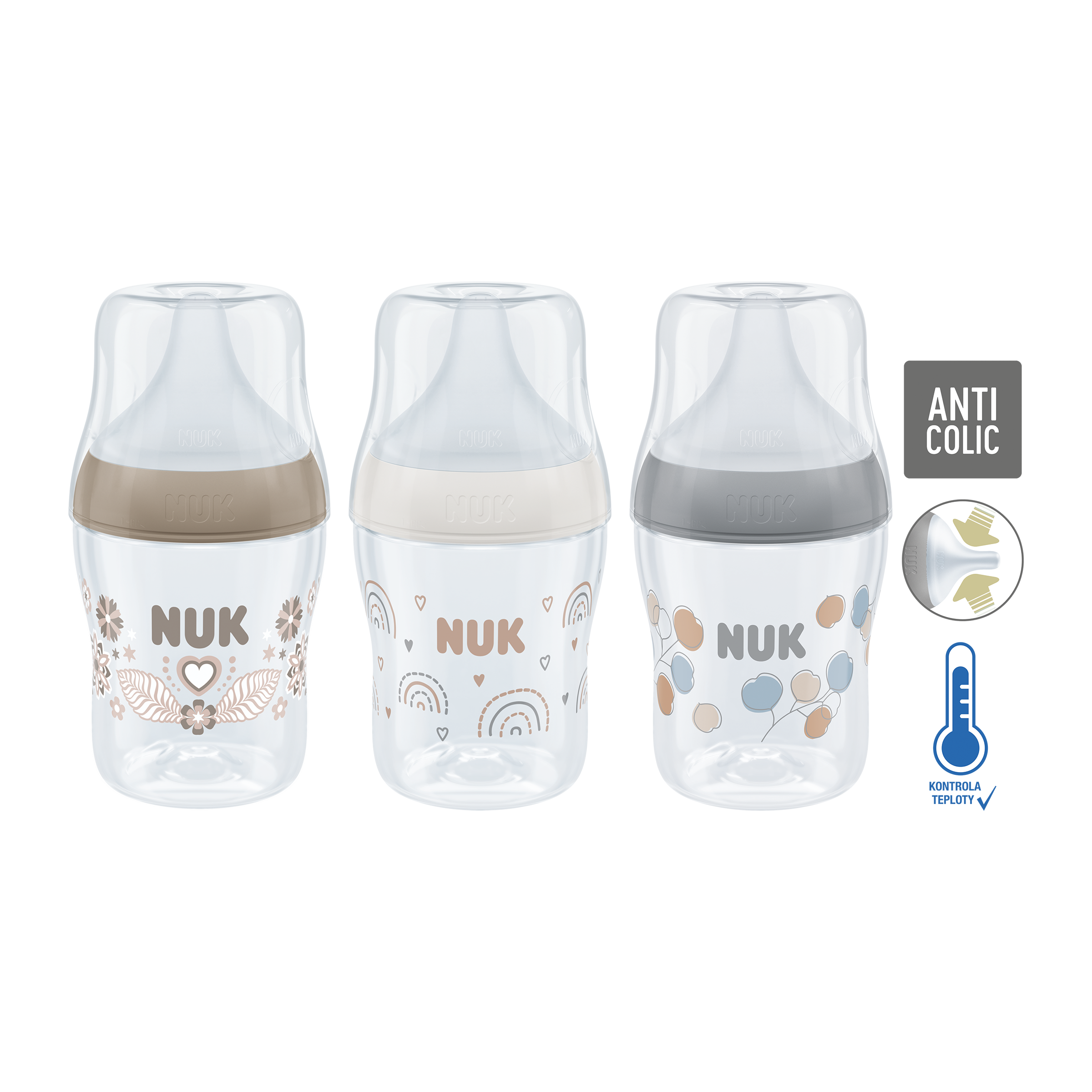 Kojenecká láhev NUK Perfect Match, s měkkou silikonovou savičkou, 150 ml, od narození, neobsahuje BPA, antikolikový systém, s kontrolou teploty.