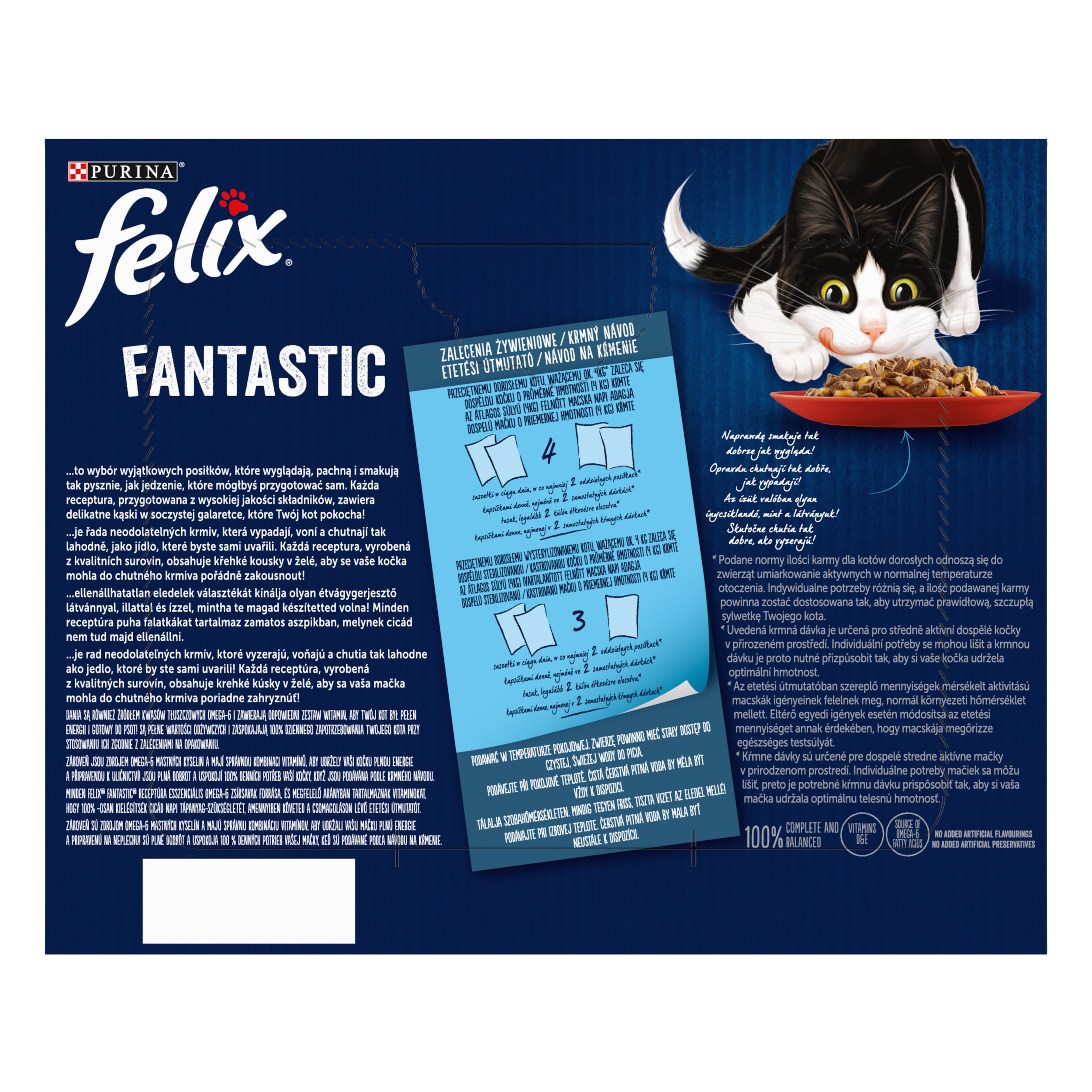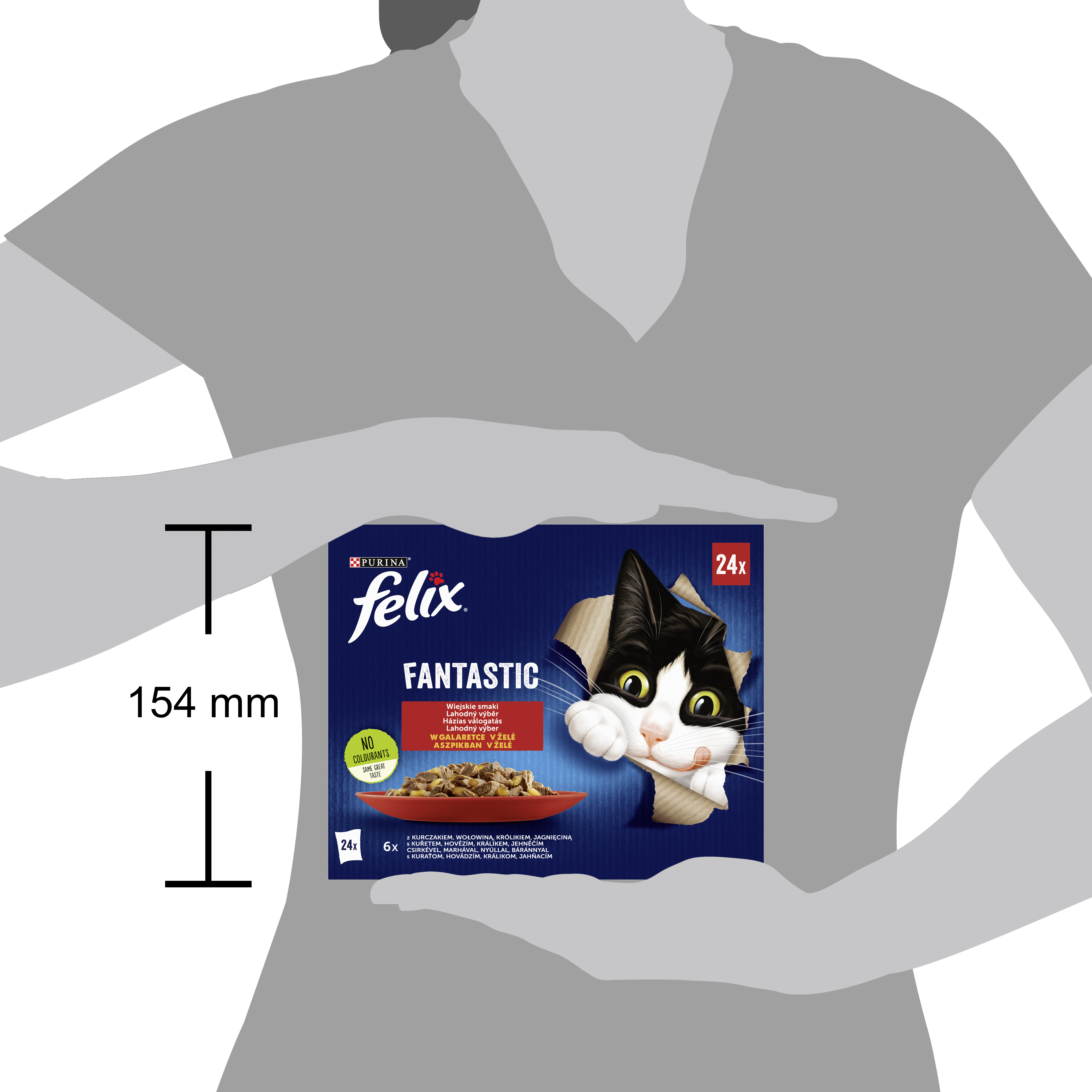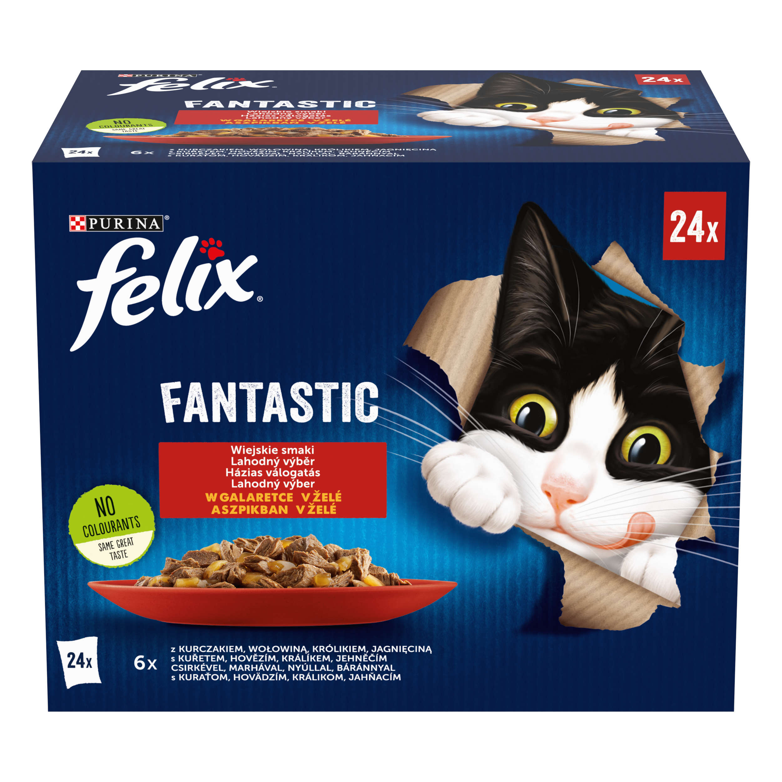 FELIX Fantastic je řada neodolatelných krmiv, která vypadají, voní a chutnají tak lahodně, jako jídlo, které byste sami uvařili. Každá receptura, vyrobená z kvalitních surovin, obsahuje křehké kousky v želé, aby se vaše kočka mohla do chutného krmiva pořádně zakousnout! Zároveň jsou zdrojem omega-6 mastných kyselin a mají správnou kombinaci vitamínů, aby udržely vaši kočku plnou energie a připravenou k uličnictví! Jsou plná dobrot a uspokojí 100 % denních potřeb vaší kočky, když jsou podávána podle krmného návodu. To není všechno! FELIX Fantastic je dostupný v široké řadě lahodných receptur ve šťavnatém želé, aby každý den uspokojil lásku vaší kočky po rozmanitosti. Opravdu chutnají tak dobře, jak vypadají! FELIX je prostě neodolatelný!