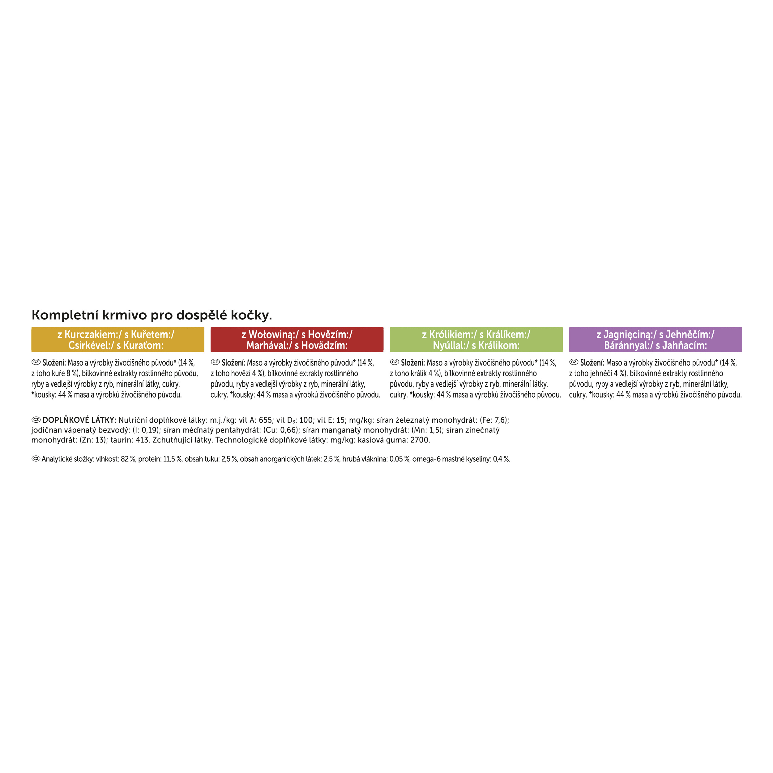 Složení: S kuřetem: maso a výrobky živočišného původu* (14 %, z toho kuře 8 %), bílkovinné extrakty rostlinného původu, ryby a vedlejší výrobky z ryb, minerální látky, cukry. *kousky: 44 % masa a výrobků živočišného původu. S hovězím: maso a výrobky živočišného původu* (14 %, z toho hovězí 4 %), bílkovinné extrakty rostlinného původu, ryby a vedlejší výrobky z ryb, minerální látky, cukry. *kousky: 44 % masa a výrobků živočišného původu. S králíkem: maso a výrobky živočišného původu* (14 %, z toho králík 4 %), bílkovinné extrakty rostlinného původu, ryby a vedlejší výrobky z ryb, minerální látky, cukry. *kousky: 44 % masa a výrobků živočišného původu. S jehněčím: maso a výrobky živočišného původu* (14 %, z toho jehněčí 4 %), bílkovinné extrakty rostlinného původu, ryby a vedlejší výrobky z ryb, minerální látky, cukry. *kousky: 44 % masa a výrobků živočišného původu.