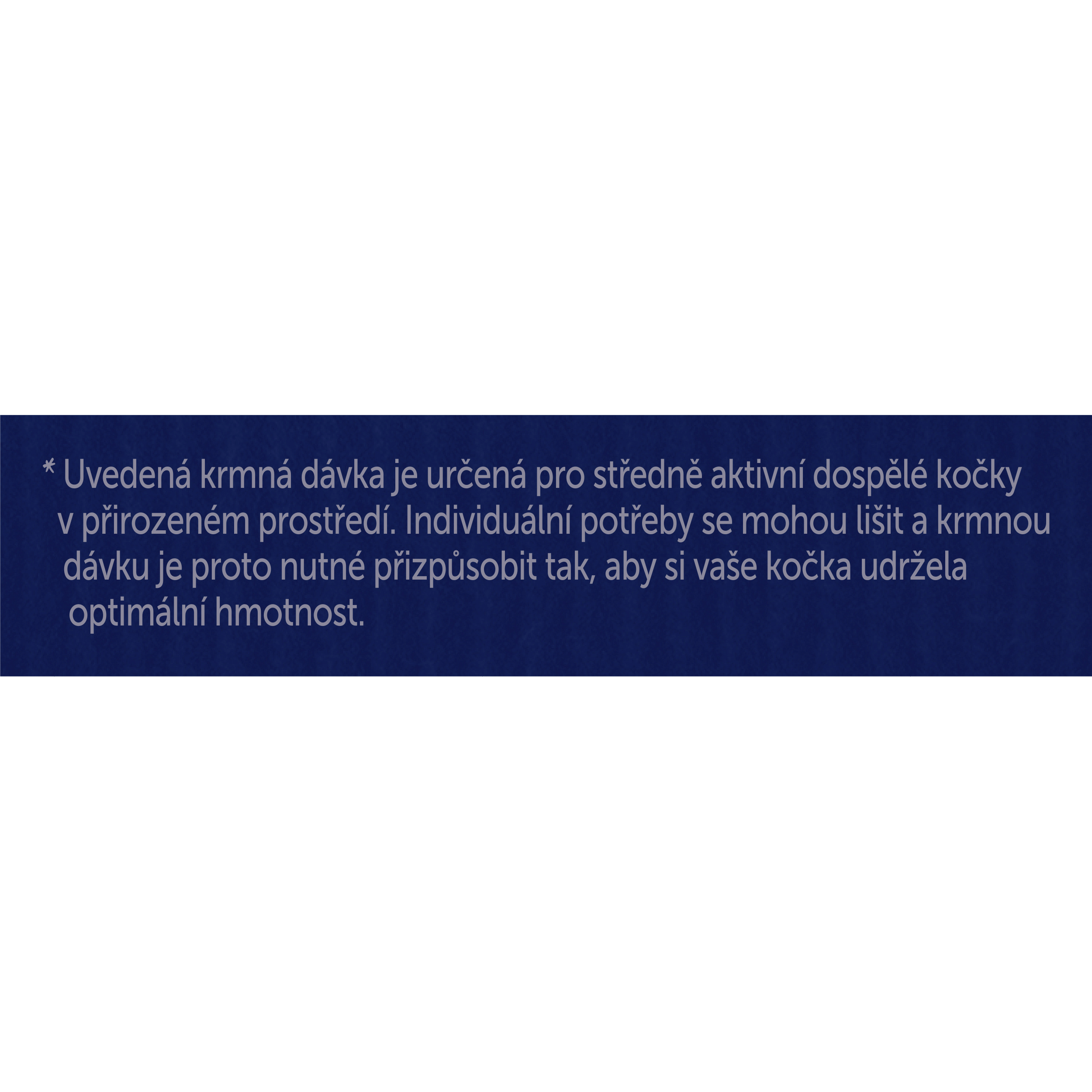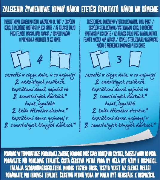 Krmný návod: Dospělou kočku o průměrné hmotnosti (4 kg) krmte 4 kapsičkami denně, nejméně ve 2 samostatných dávkách. Uvedená krmná dávka je určená pro středně aktivní dospělé kočky v přirozeném prostředí. Individuální potřeby se mohou lišit a krmnou dávku je proto nutné přizpůsobit tak, aby si vaše kočka udržela optimální hmotnost. Podávejte při pokojové teplotě. Čistá čerstvá pitná voda by měla být vždy k dispozici. Dospělou sterilizovanou/ kastrovanou kočku o průměrné hmotnosti (4 kg) krmte 3 kapsičkami denně, nejméně ve 2 samostatných dávkách.