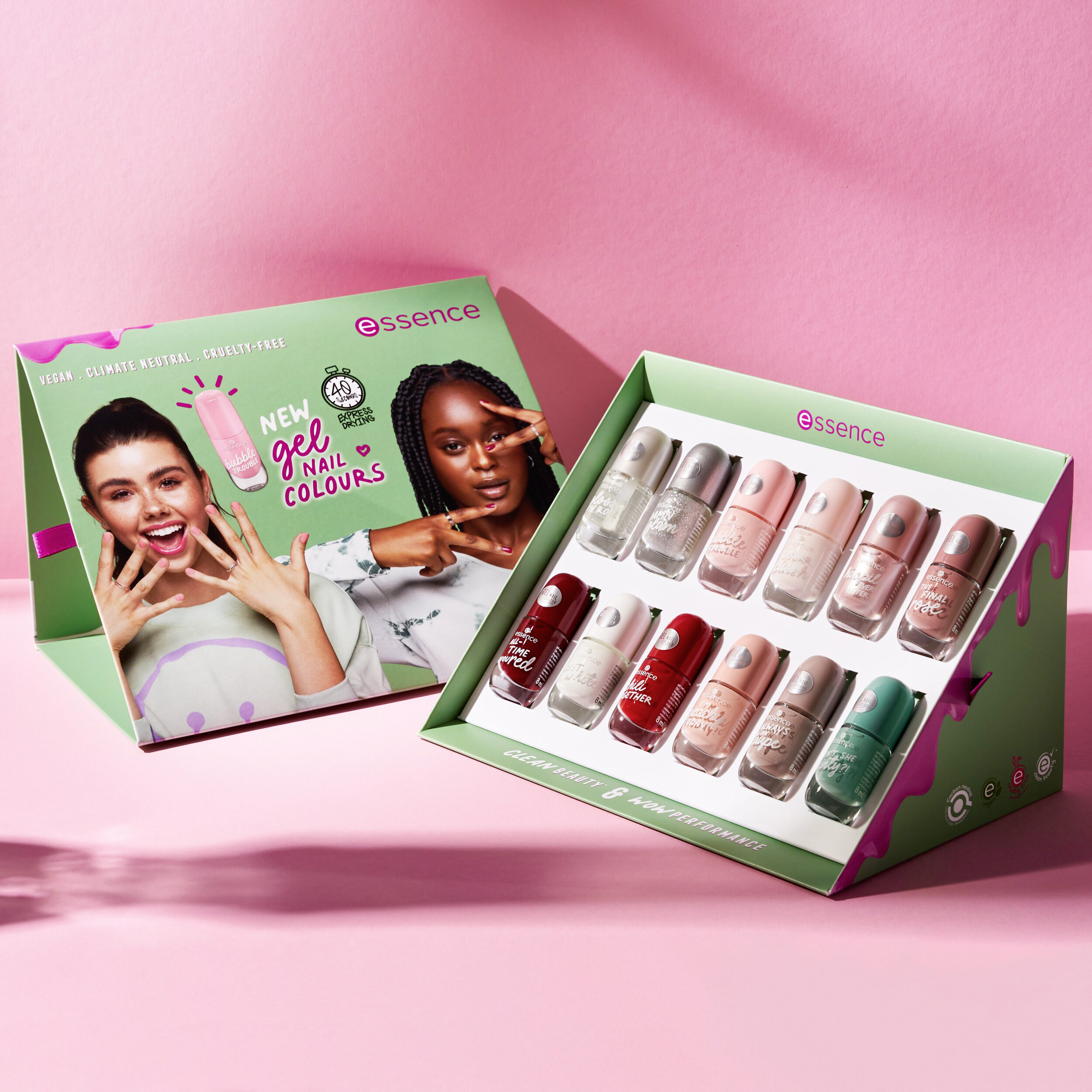 Clean beauty s WOW efektem! S laky na nehty gel nail colour neexistují žádné kompromisy: veganské se složením clean beauty: pouze krátký seznam ingrediencí a bez obsahu mikroplastů. Laky na nehty se snadno nanáší díky patentovanému širokému kartáčku „double-touch“ a navíc rychle schnou. První vrstva klimaticky neutrálního* laku na nehty je připravena zazářit za pouhých 40 sekund. Dobré vědět: pokud nanesete několik vrstev, doba sušení se odpovídajícím způsobem prodlouží, ale samozřejmě ji lze zkrátit pomocí rychleschnoucích kapek nebo spreje.