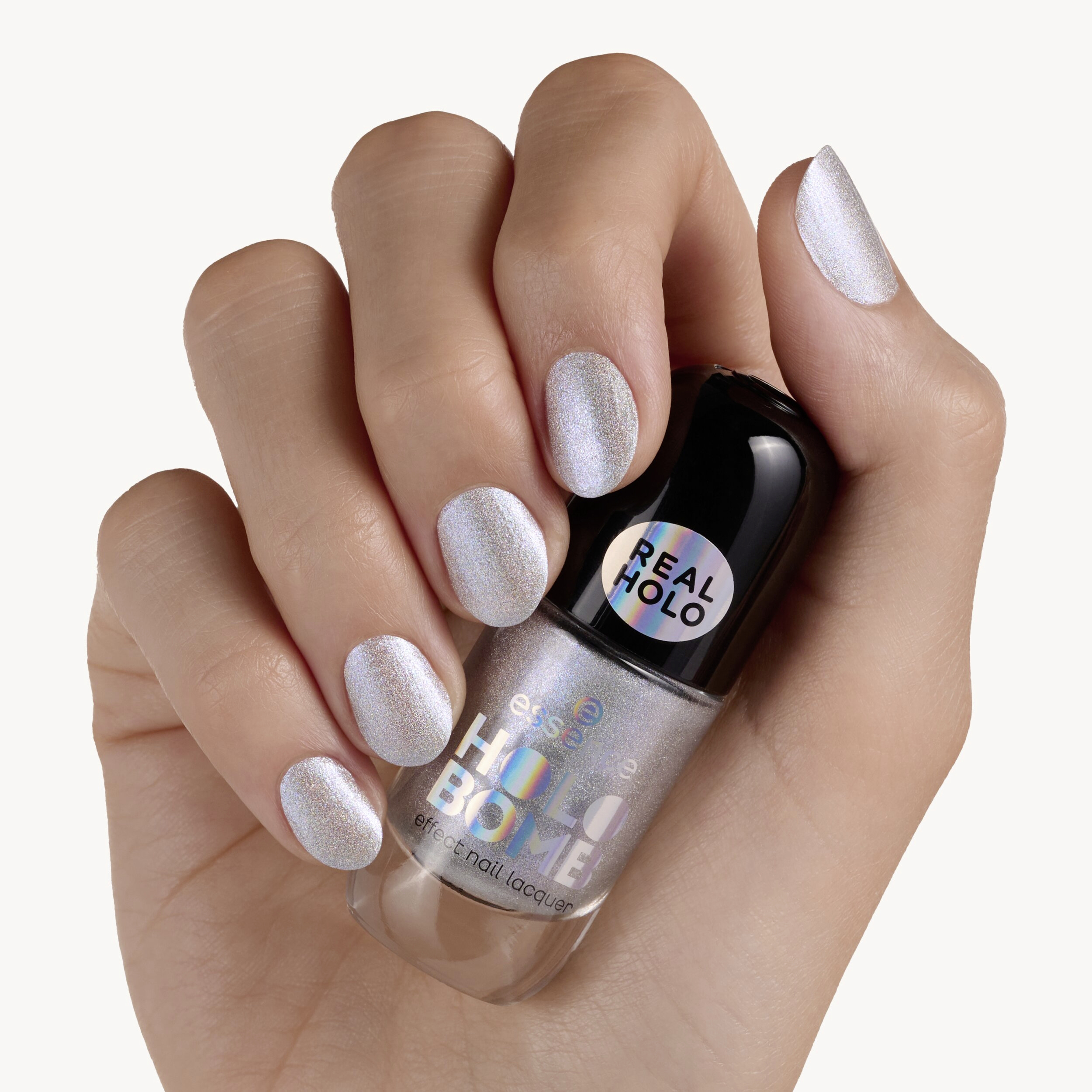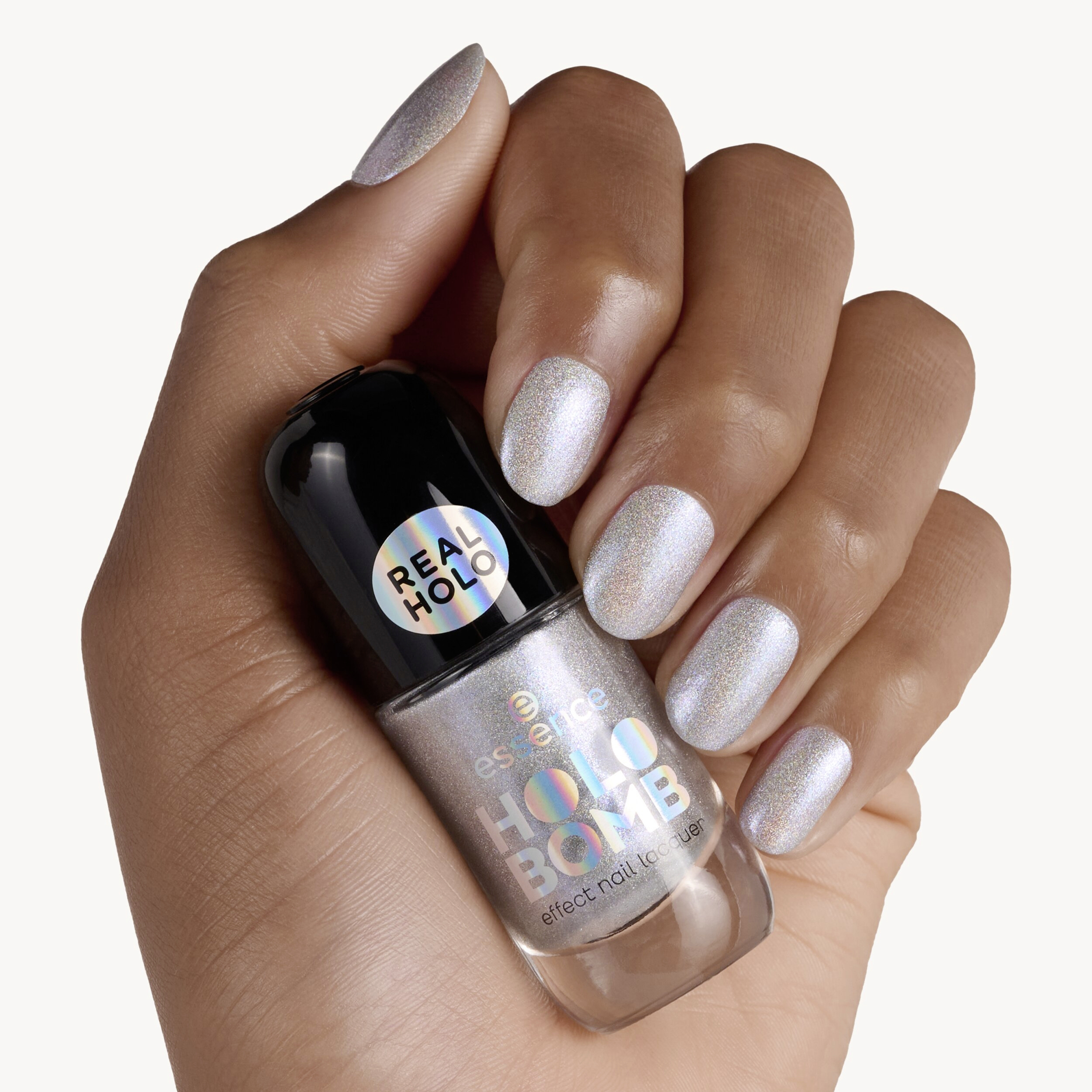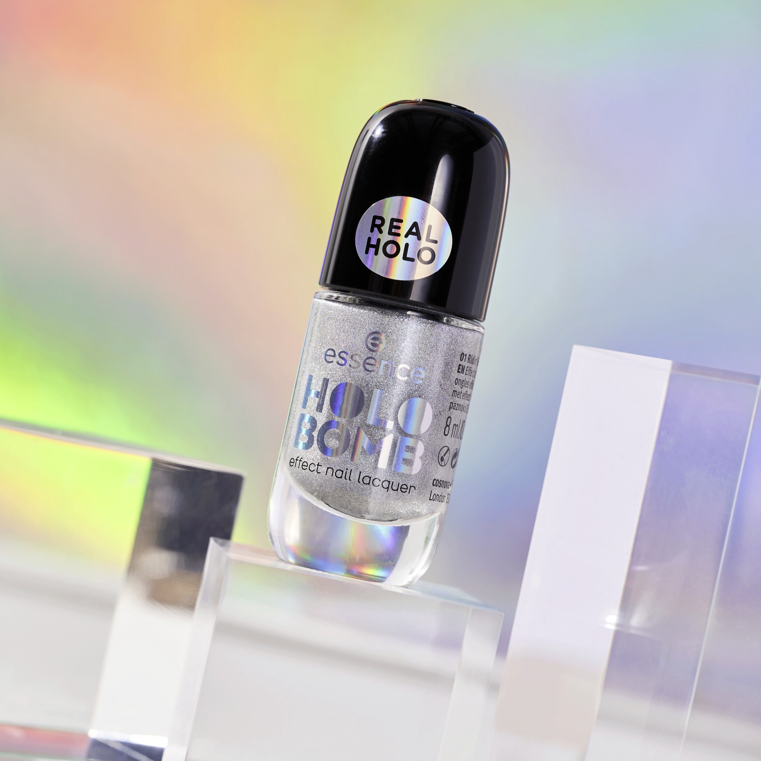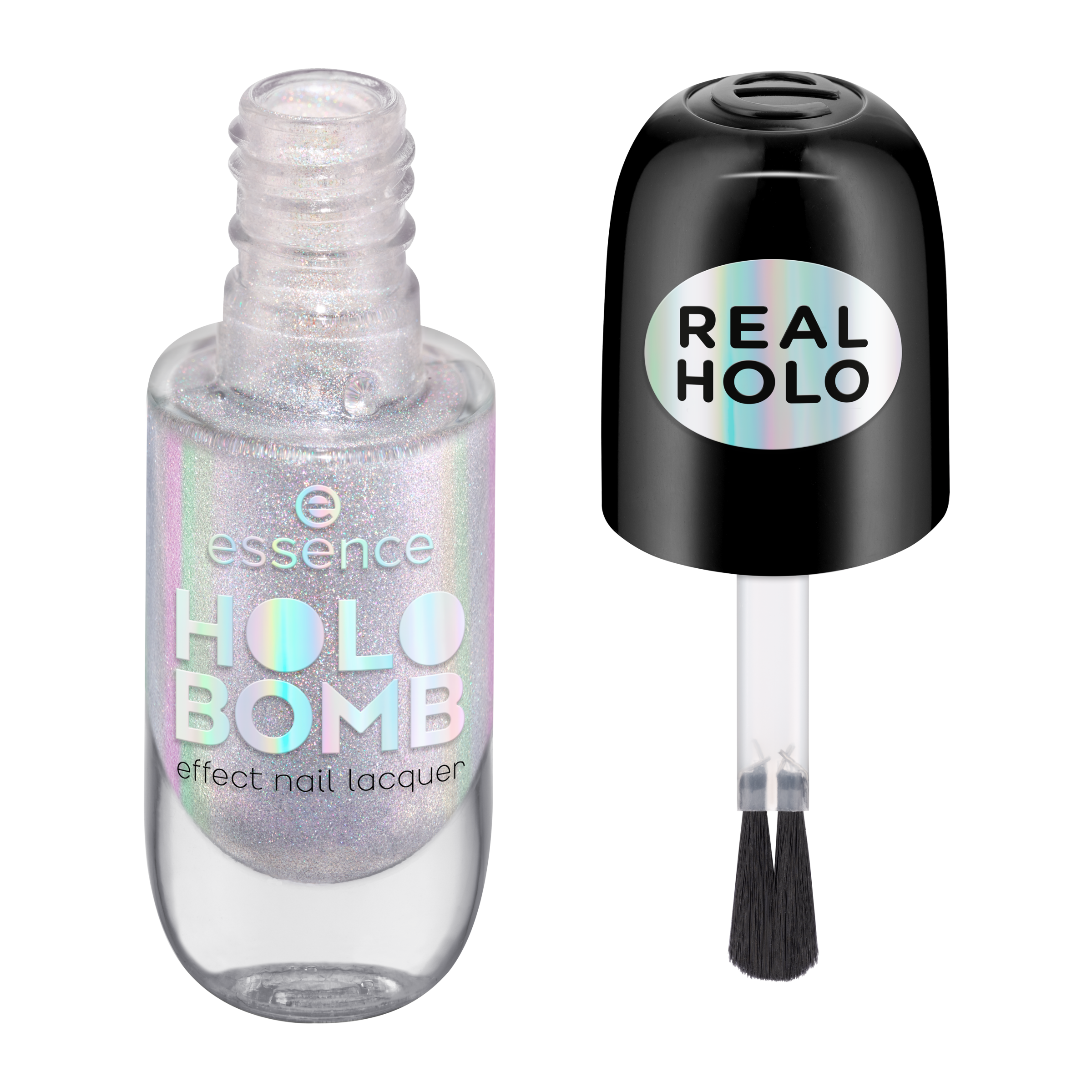 Vítejte v kolekci laků na nehty budoucnosti! Laky na nehty essence HOLO BOMB effect mají jedinečný vzhled díky holografickým pigmentům, které září ve všech barvách duhy. Ideální pro každého, kdo rád vyniká a miluje trendy vzhled. Trendy efektový lak lze snadno a rychle aplikovat pomocí dvojitého štětce.