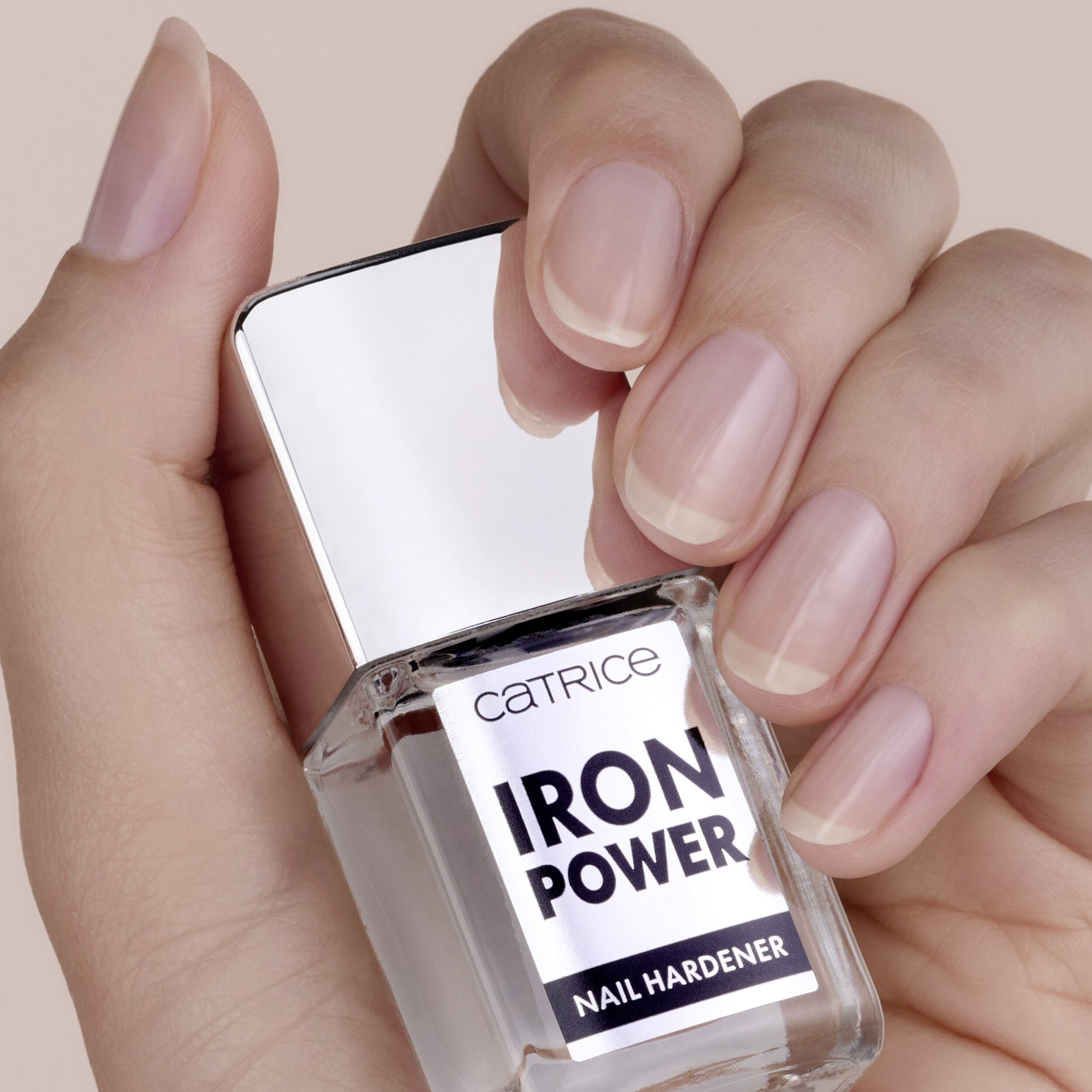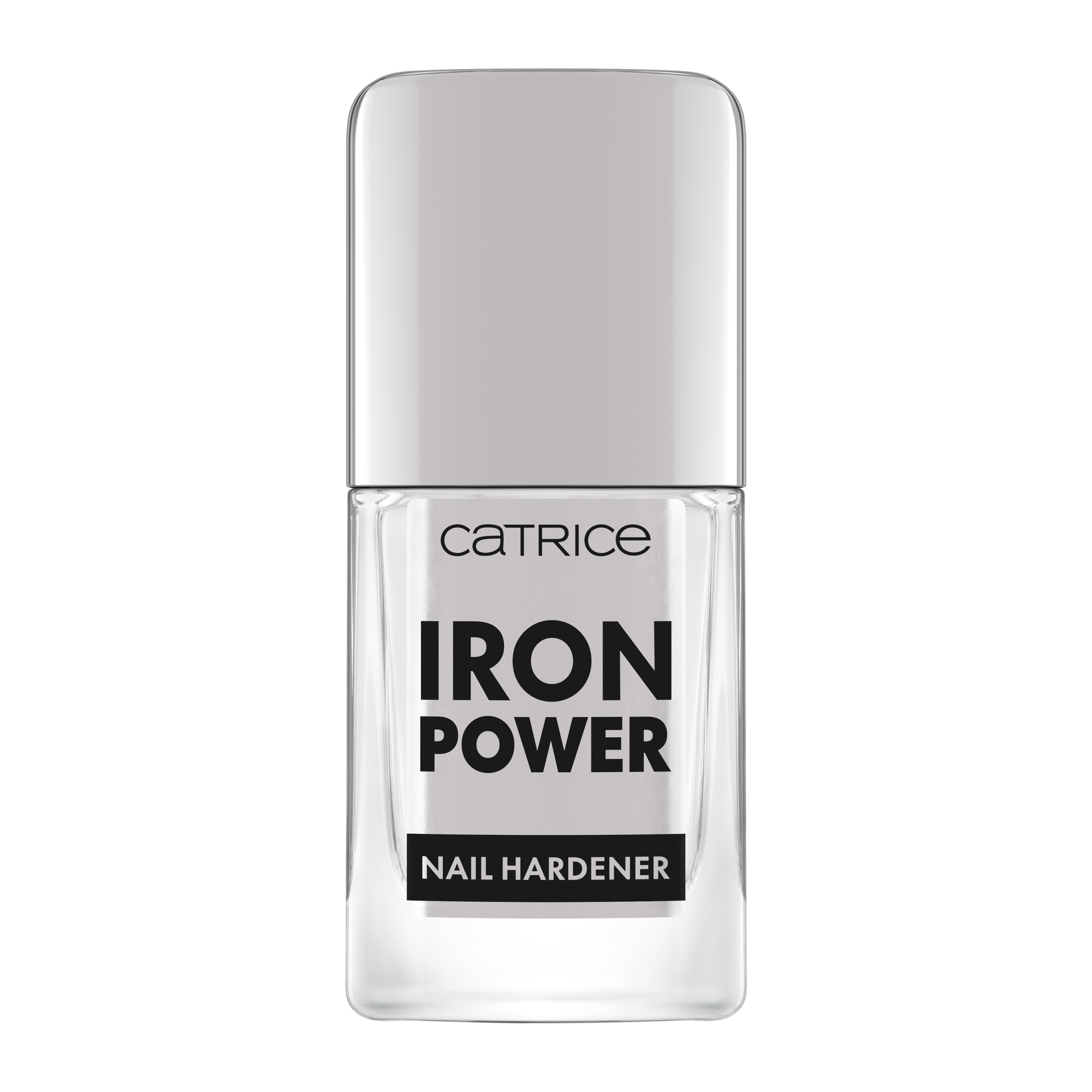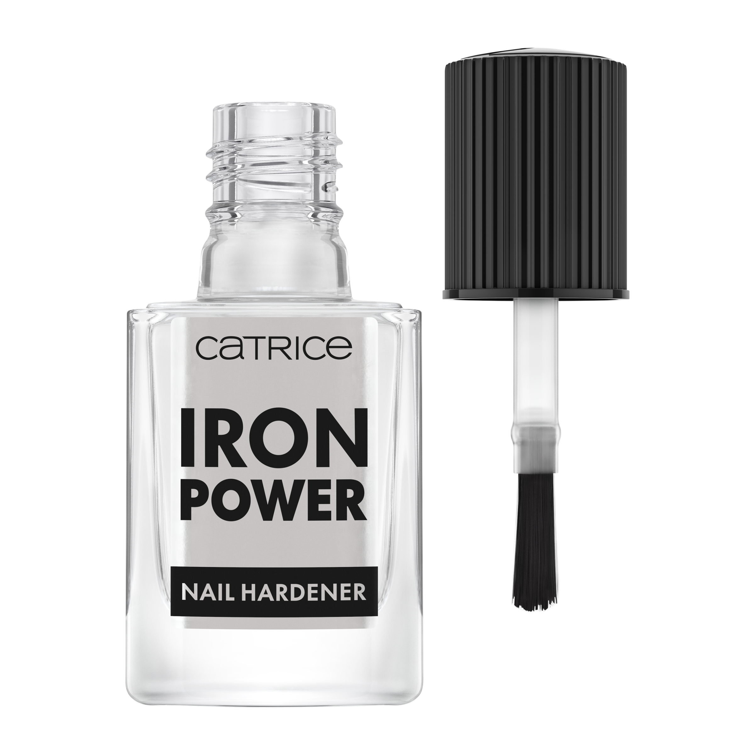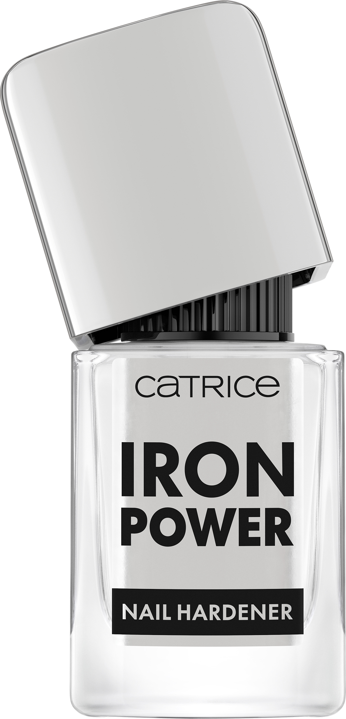 CATRICE Zpevňující lak na nehty Iron Power posiluje a chrání nehty, dodává jim větší odolnost a lesk. Průhledná textura je obohacena olejem z meruňkových jader a hexananalem rychle schne a lze ji také použít jako podkladový lak pod barevný lak na nehty.