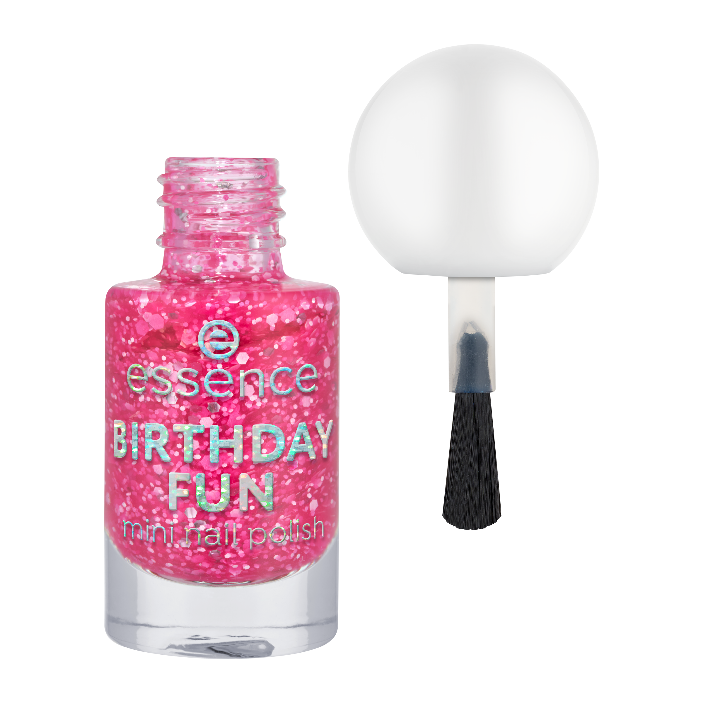 Velká zábava v malé lahvičce – esence mini lak na nehty Birthday Fun 05. Hravý obal s kulatým víčkem obsahuje lak na nehty s jemným třpytivým efektem s růžovými nuancemi. Ať už slavíte svůj speciální den nebo chcete překvapit kamaráda, s praktickým lakem na nehty se budete každý den cítit jako na oslavě. Můžete jej buď aplikovat samostatně, nebo použít jako krycí lak na vaši oblíbenou barvu pro extra třpyt.