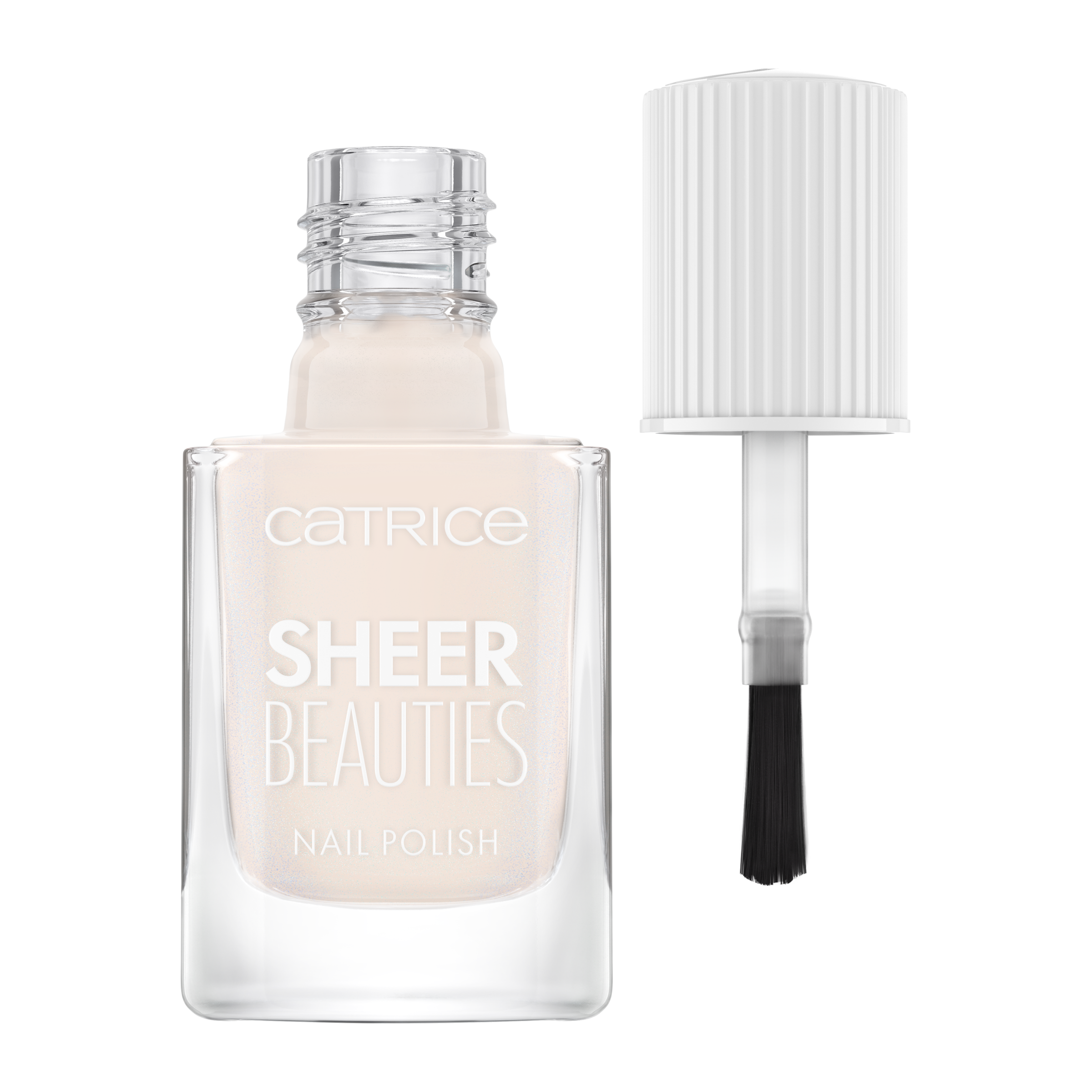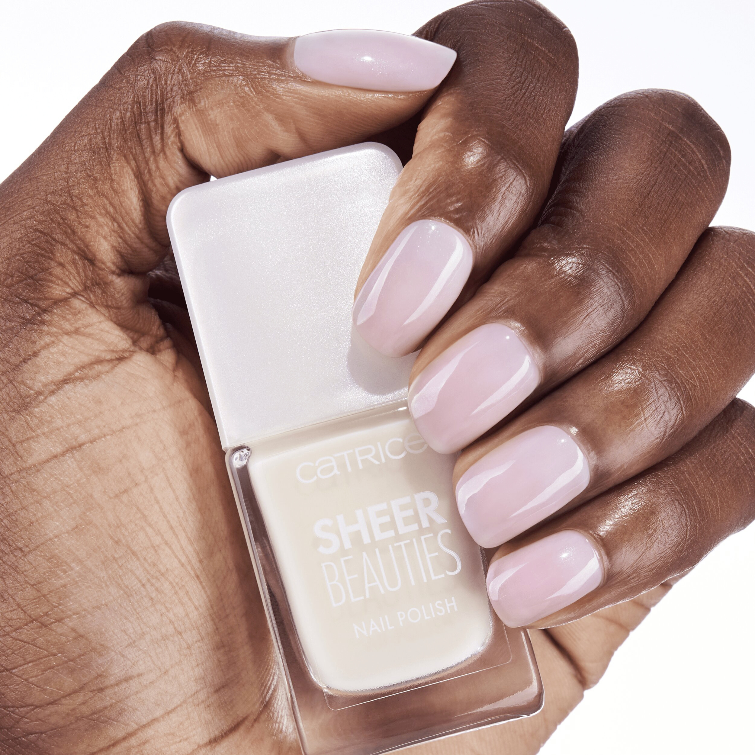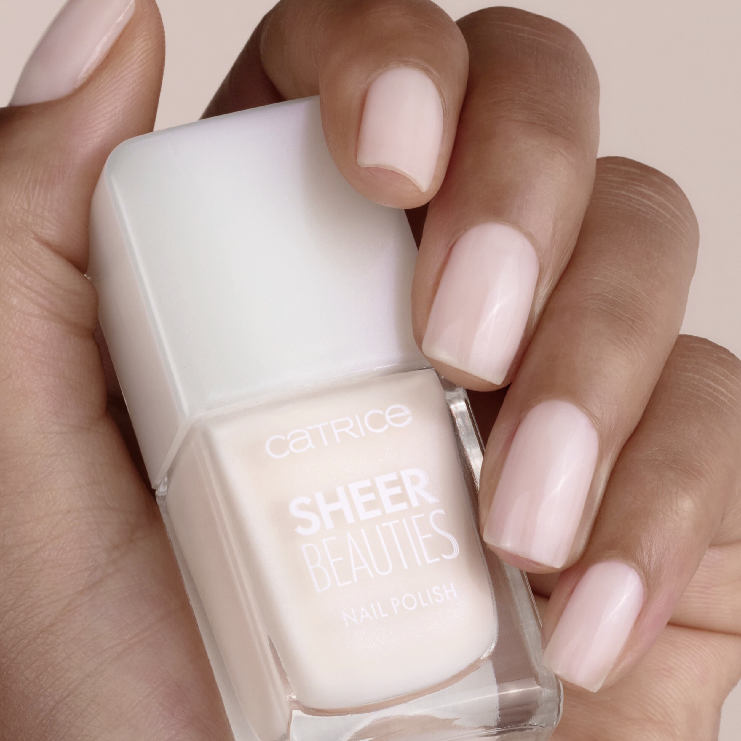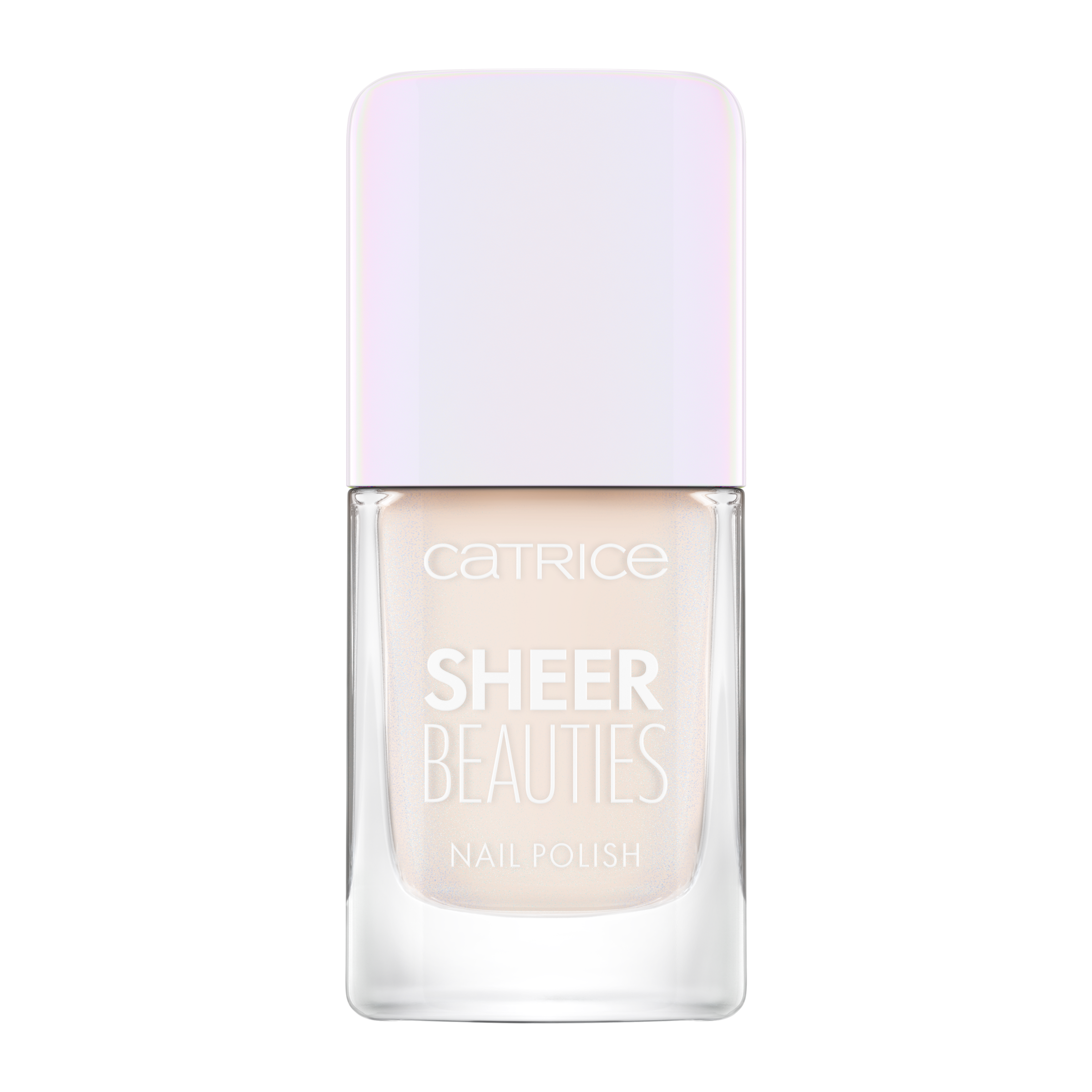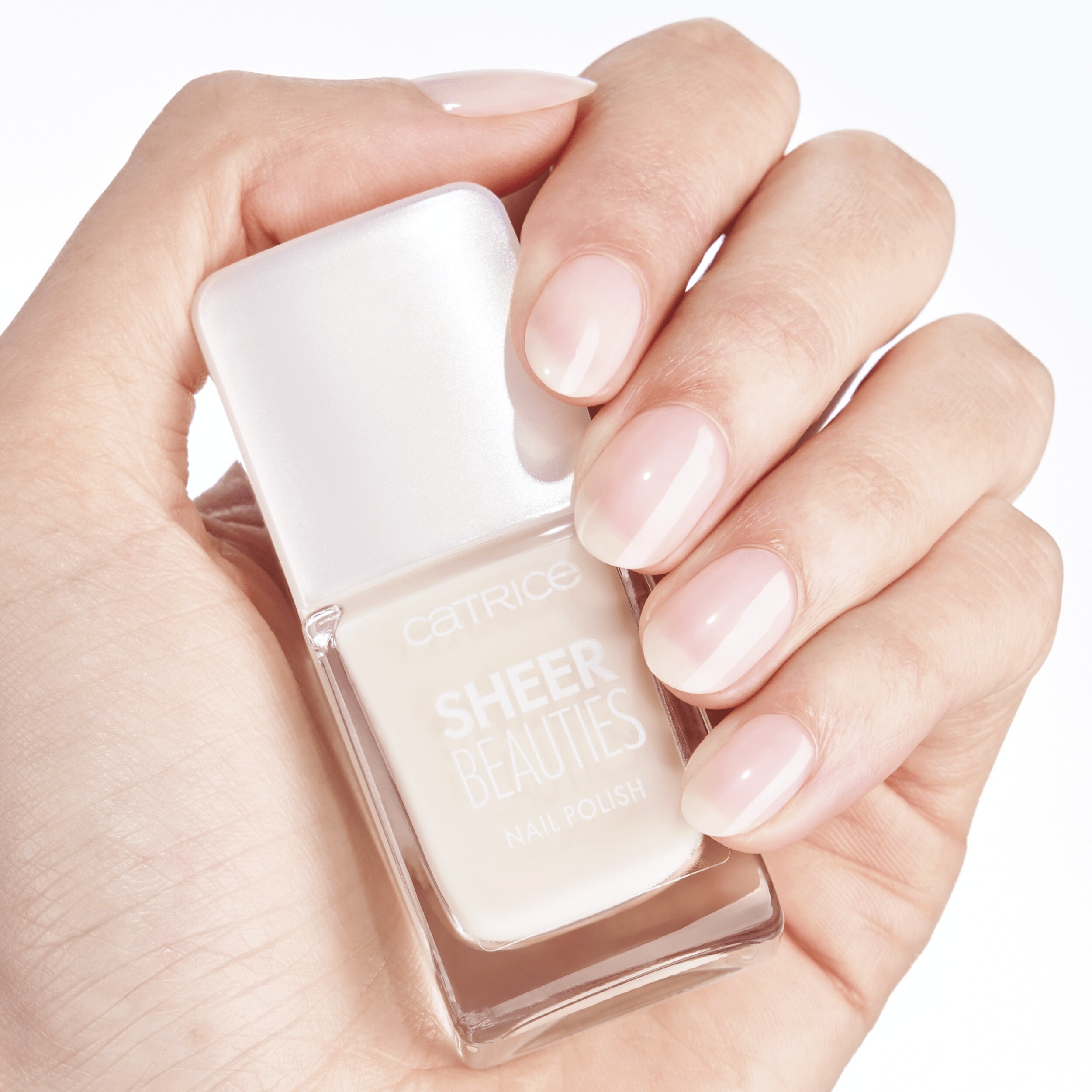 CATRICE Lak na nehty Sheer Beauties v jemných tělových odstínech funguje jako filtr na nehty. Nehty jsou viditelně rozjasněny namodralým třpytem a jemně průhledný efekt umožňuje přirozené barvě nehtů prosvítat.