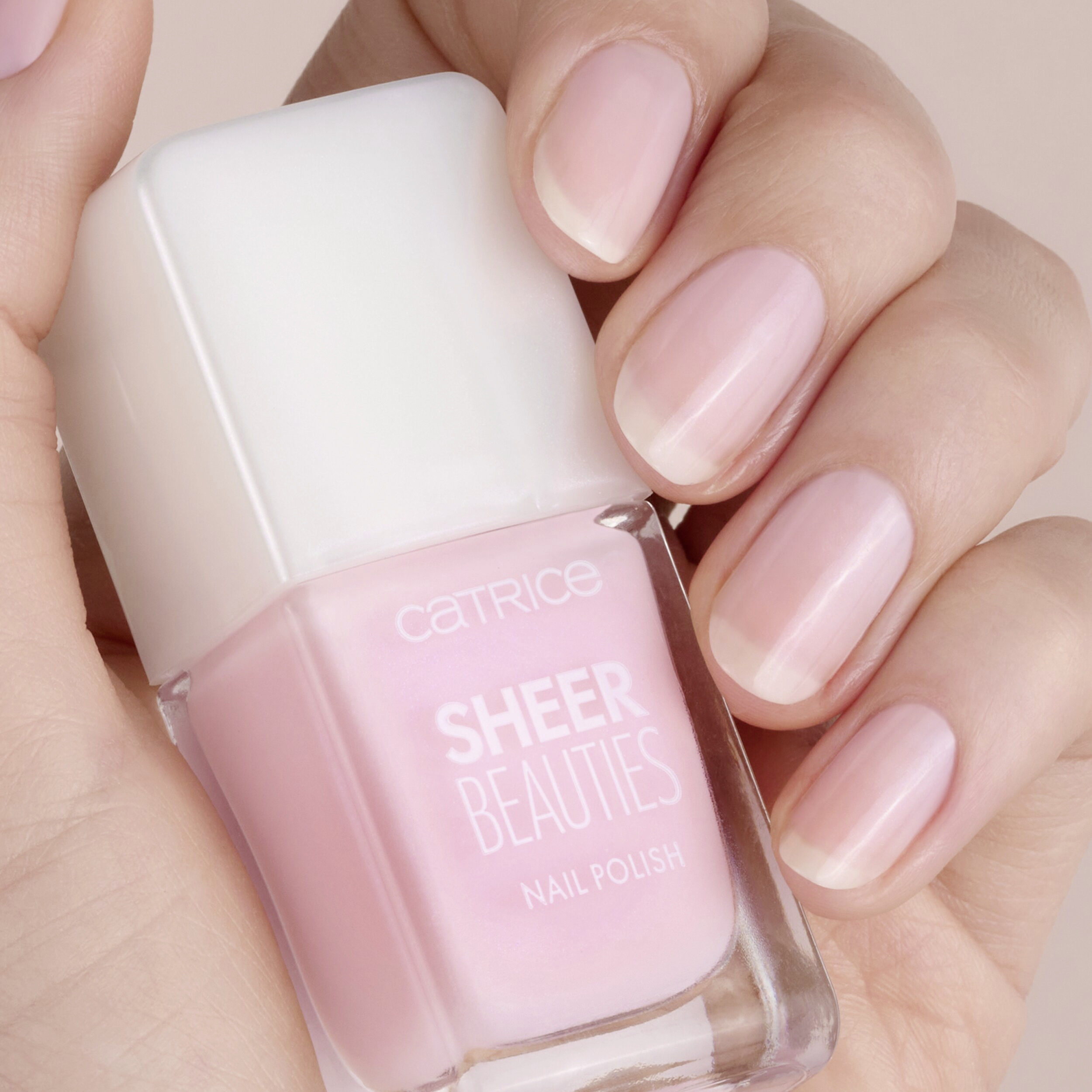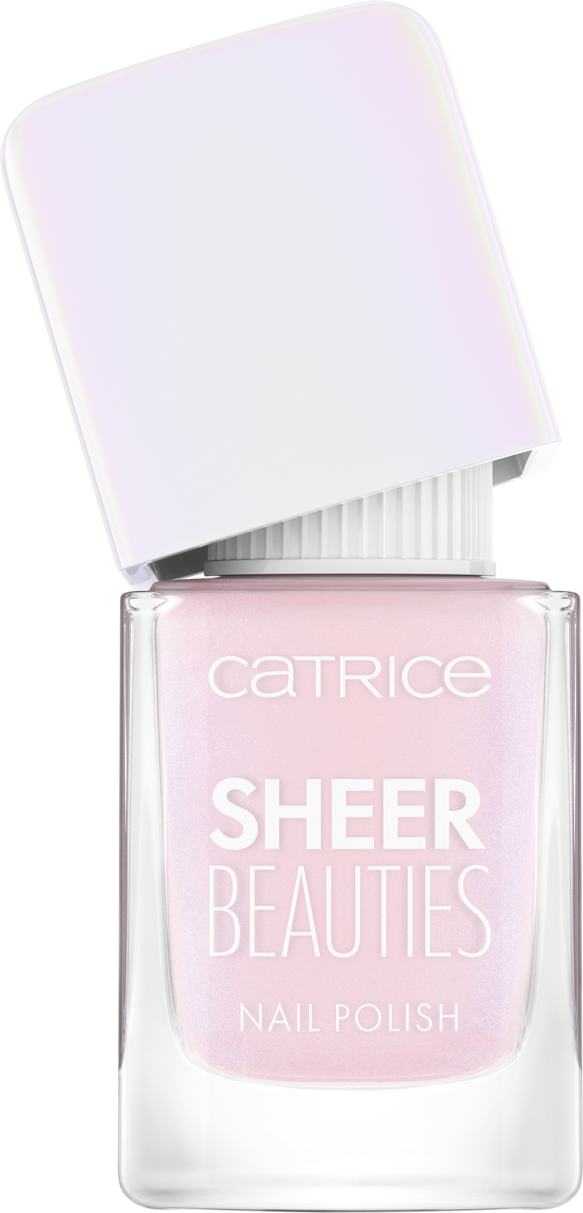 CATRICE Lak na nehty Sheer Beauties v jemných tělových odstínech funguje jako filtr na nehty. Nehty jsou viditelně rozjasněny namodralým třpytem a jemně průhledný efekt umožňuje přirozené barvě nehtů prosvítat.