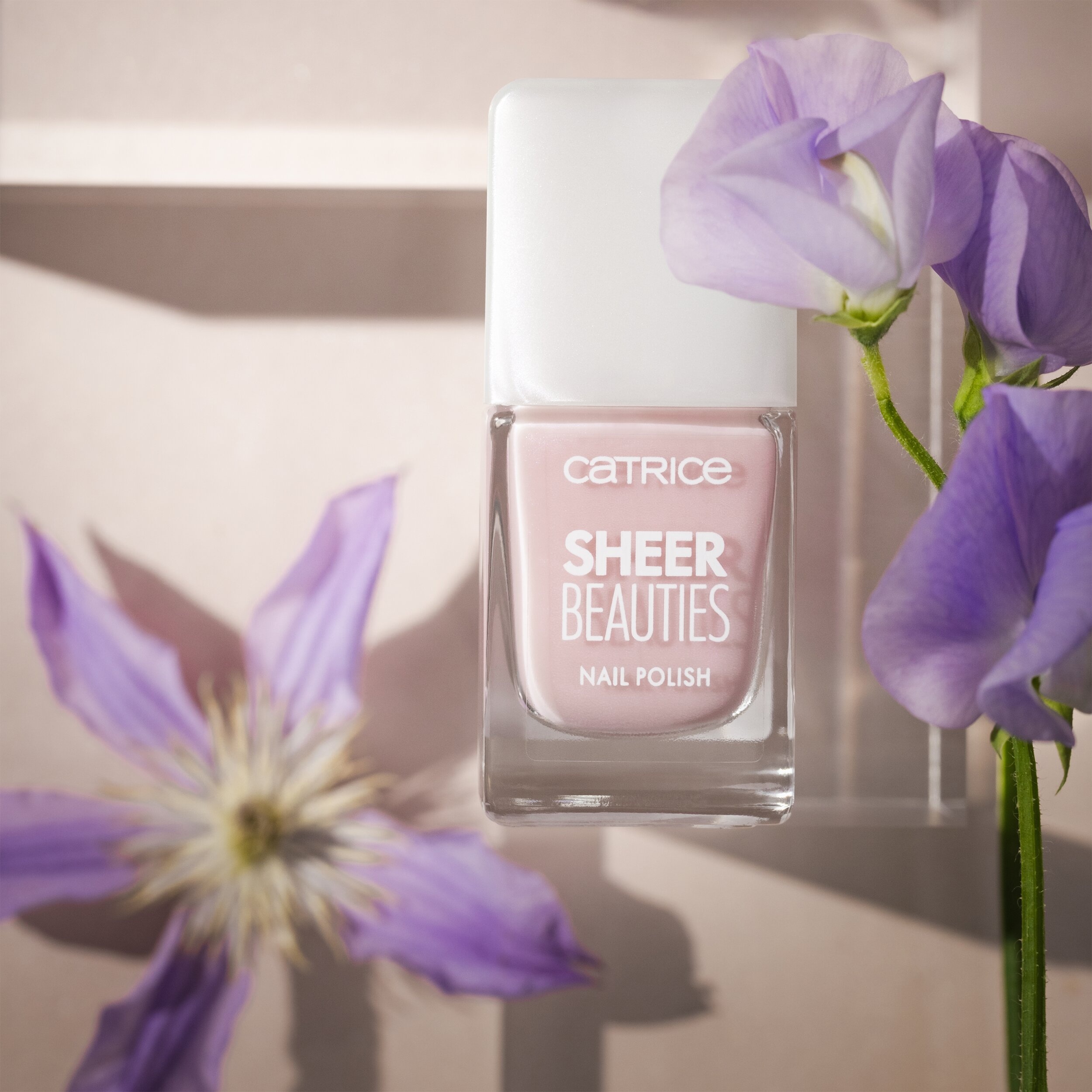 CATRICE Lak na nehty Sheer Beauties v jemných tělových odstínech funguje jako filtr na nehty. Nehty jsou viditelně rozjasněny namodralým třpytem a jemně průhledný efekt umožňuje přirozené barvě nehtů prosvítat.