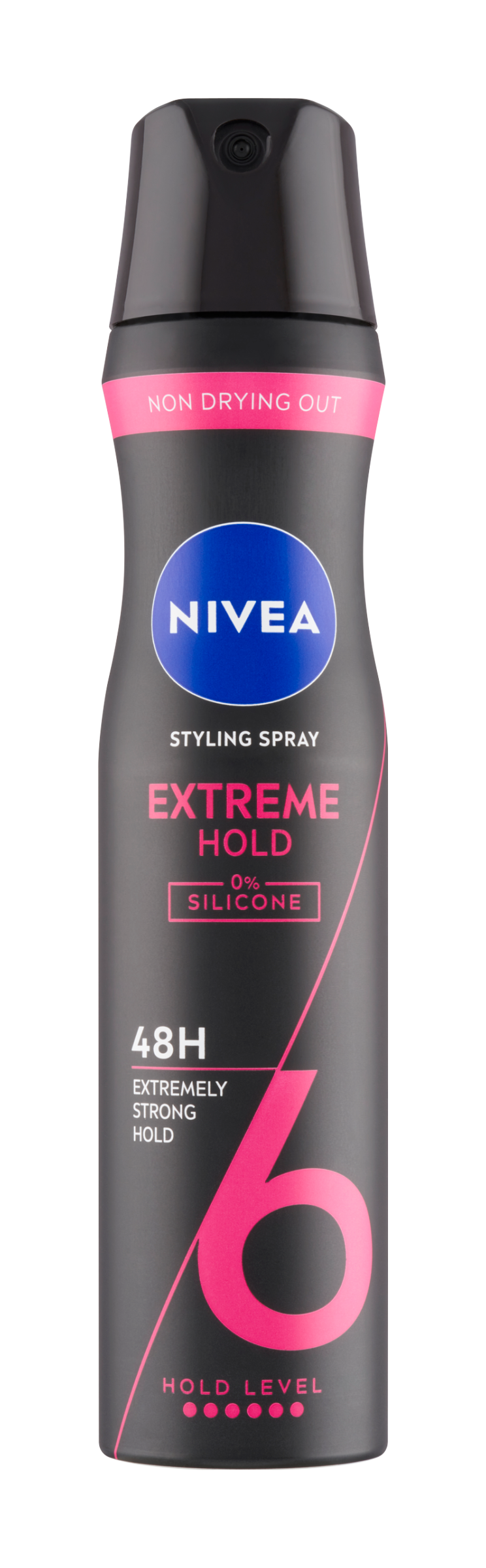Nivea® Lak na vlasy Extreme Hold posiluje vlasy až po 48 hodin a poskytuje spolehlivou, extrémně silnou a flexibilní fixaci bez lepivého pocitu. Snadno se vyčesává.