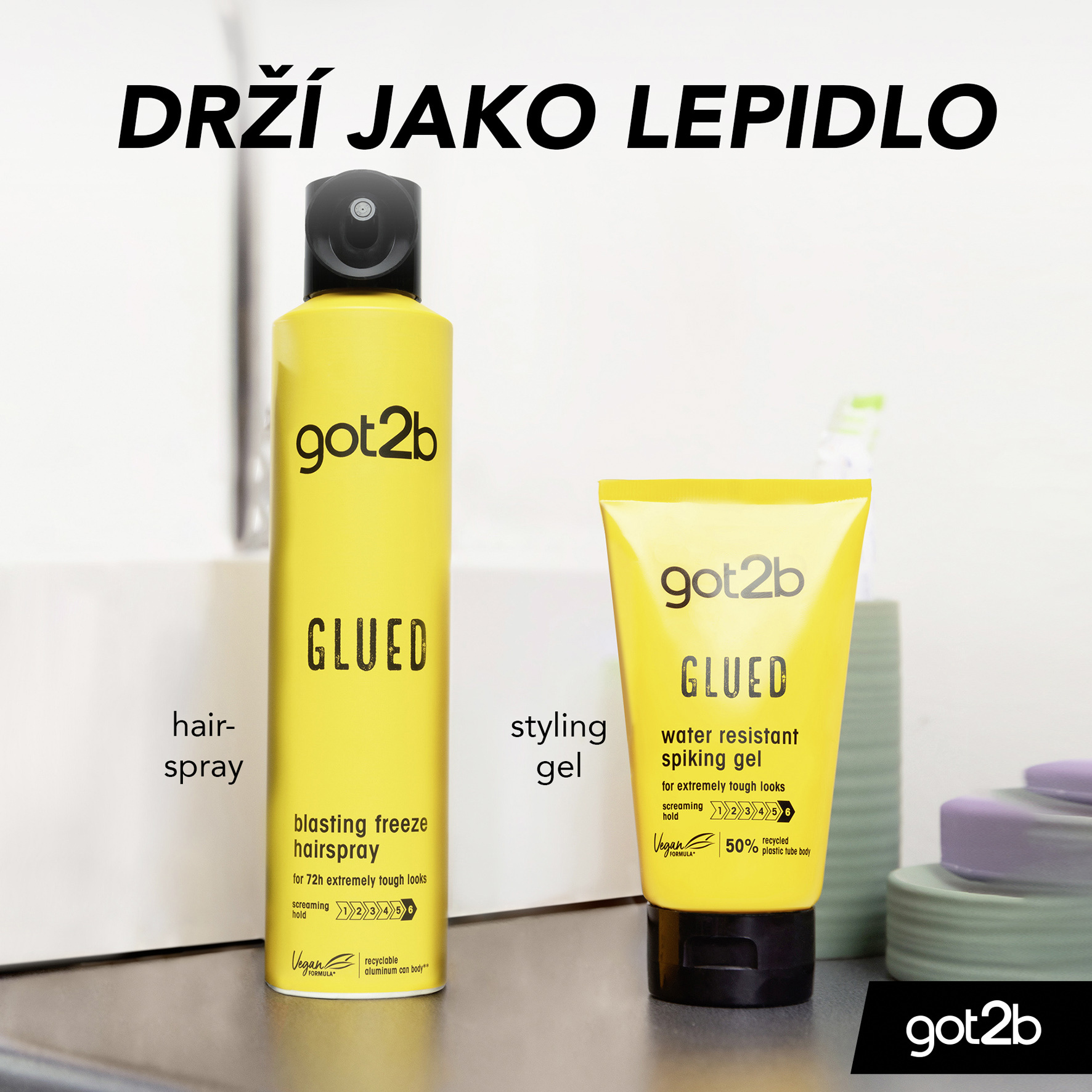 - Glued Blastin Freeze lak na vlasy: Používá se jako sprej, drží jako lepidlo! Lak na vlasy got2b Glued Blasting Freeze zafixuje odvážné účesy až do dalšího mytí