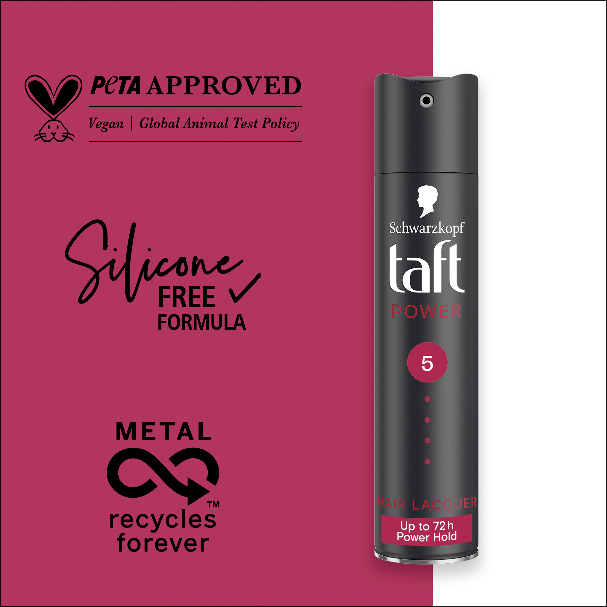- Veganské složení: tento lak na vlasy Taft neobsahuje silikony, má veganske složení* a je schválený organizací PETA**, stejně jako ostatní produkty na vlasy Taft.