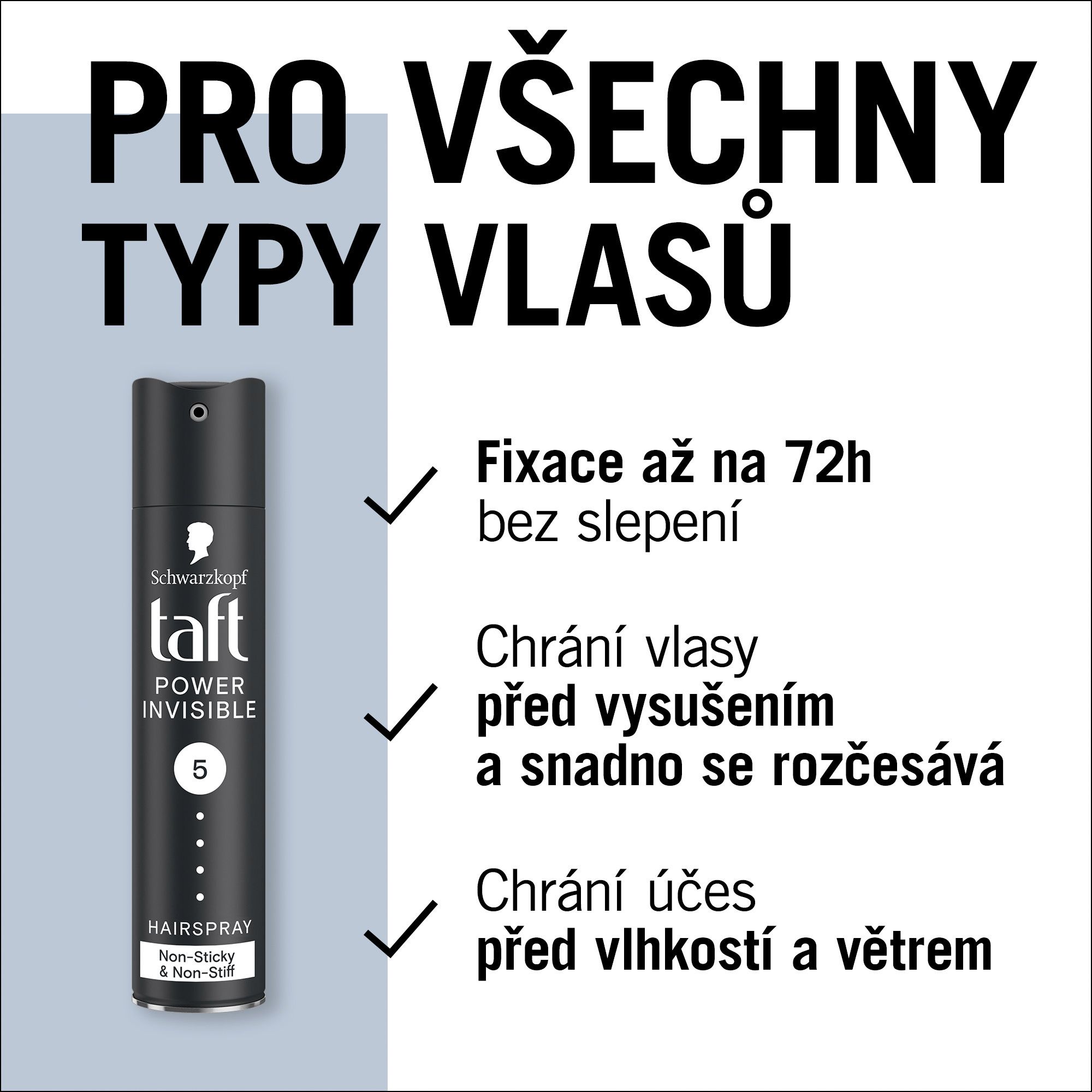 - Lak na vlasy Taft Power Invisible: Tento lak na vlasy Taft je nelepivý, nezatěžuje, netuhne a je vhodný pro všechny typy vlasů. Pomáhá chránit před pocitem suchých vlasů.