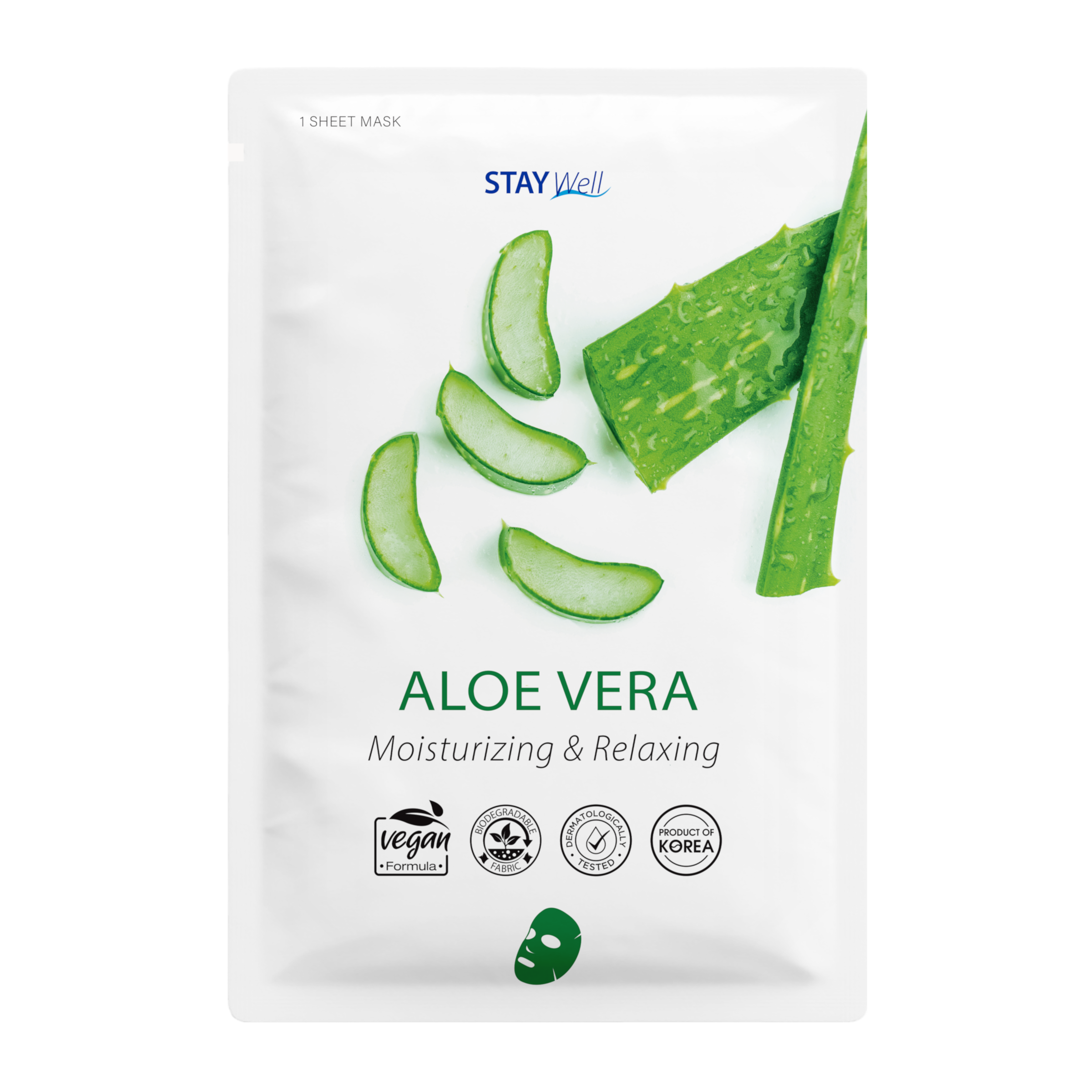 Maska STAY WELL Vegan Aloe Vera Sheet Mask s výtažky z aloe a pupečníku asijského poskytuje vlhkost a relaxaci pro mladší a svěžejší pokožku. Látka je přírodní a biologicky odbouratelná. Zajišťuje výjimečnou hebkost a jemnou péči o pokožku.
