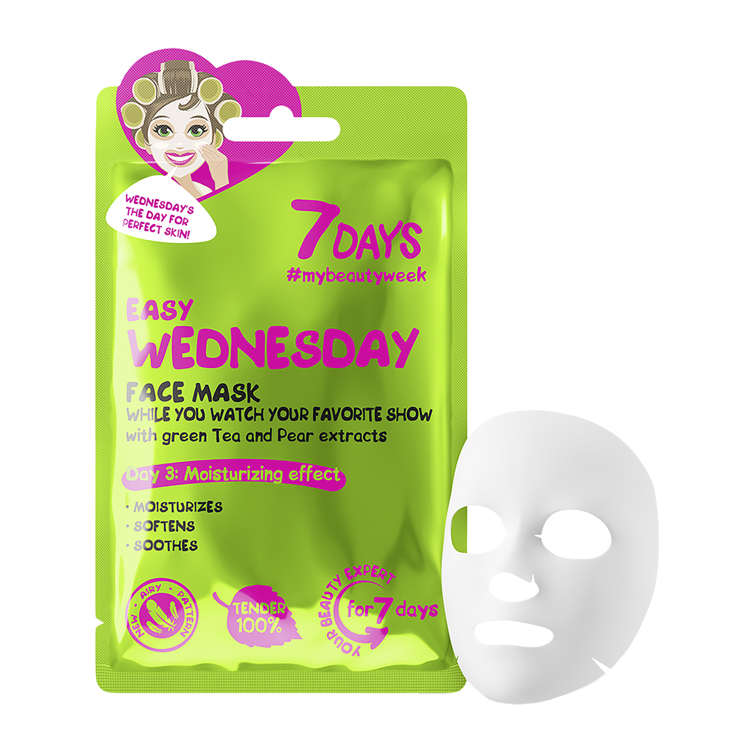 7days - látková maska EASY WEDNESDAY. Lehká středa s extraktem zeleného čaje a hrušky. Středeční maska je třetím krokem na vaší cestě k pleti vašich snů! Extrakt ze zeleného čaje poskytuje intenzivní hydrataci, zlepšuje pružnost a naplňuje vaši pokožku mladistvou energií. Bambucké, makadamové a jojobové oleje revitalizují vaši pokožku výživnými sloučeninami, aby byla jemná a hladká. Hruška změkčuje horní vrstvy epidermis, urychluje regeneraci a osvěžuje pokožku. Kyselina hyaluronová a jedinečný hydratační komplex dodávají vaší pokožce pružnost.