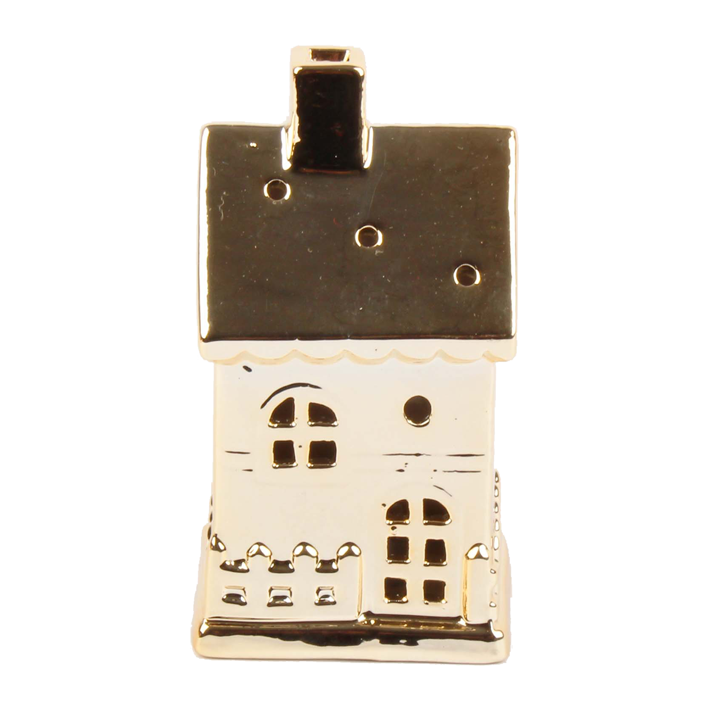 Stylový domeček se zlatou povrchovou úpravou a jemnými detaily jako okna, dveře a komín. Po rozsvícení LED světla vytváří příjemnou atmosféru, ideální pro zimní a vánoční výzdobu. Elegantní doplněk na poličku, stůl nebo parapet. Výška: 12 cm.