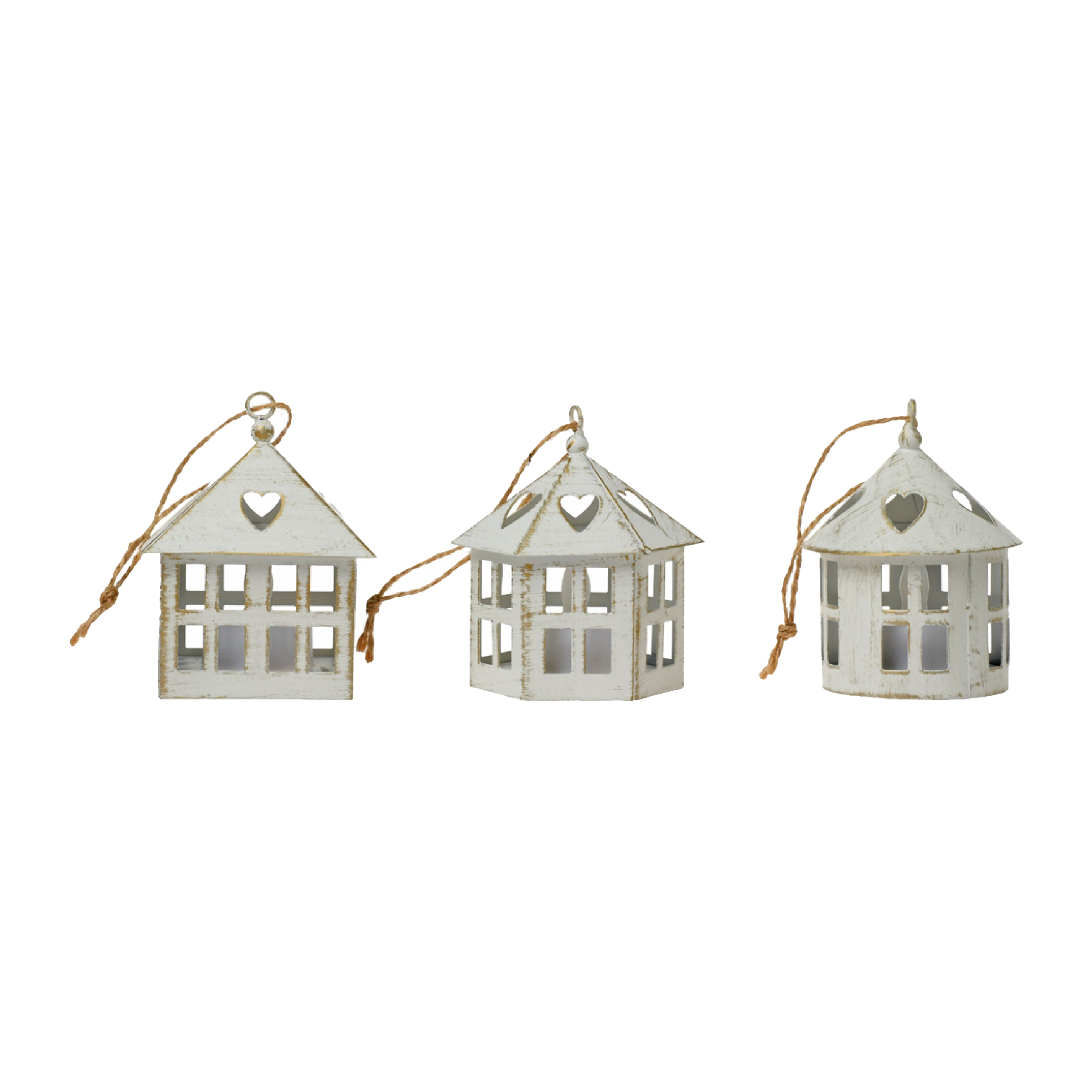 Dekorativní LED lucerna ve tvaru malého domečku rozzáří váš interiér jemným světlem. Bílý povrch s rustikálním vzhledem a výřezy ve tvaru srdce dodává lucerně romantický nádech. Ideální k zavěšení nebo postavení jako součást vánoční či zimní výzdoby. Výška 9 cm.