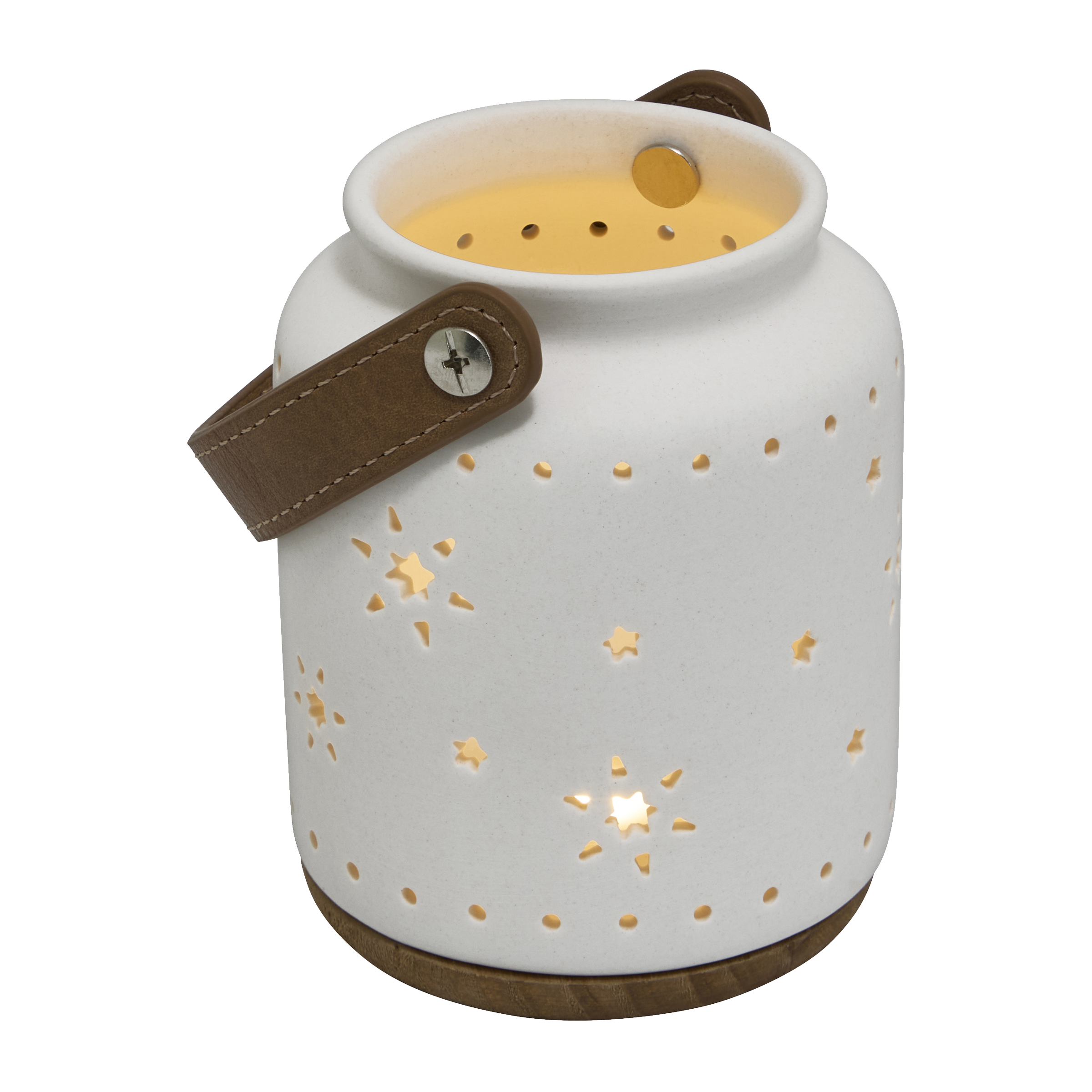 Lucerna s LED osvětlením a výřezy ve tvaru hvězd, které krásně propouštějí teplé světlo. Stylový doplněk s dřevěným podstavcem a koženým poutkem pro snadné zavěšení. Ideální pro zimní a vánoční dekoraci interiéru.