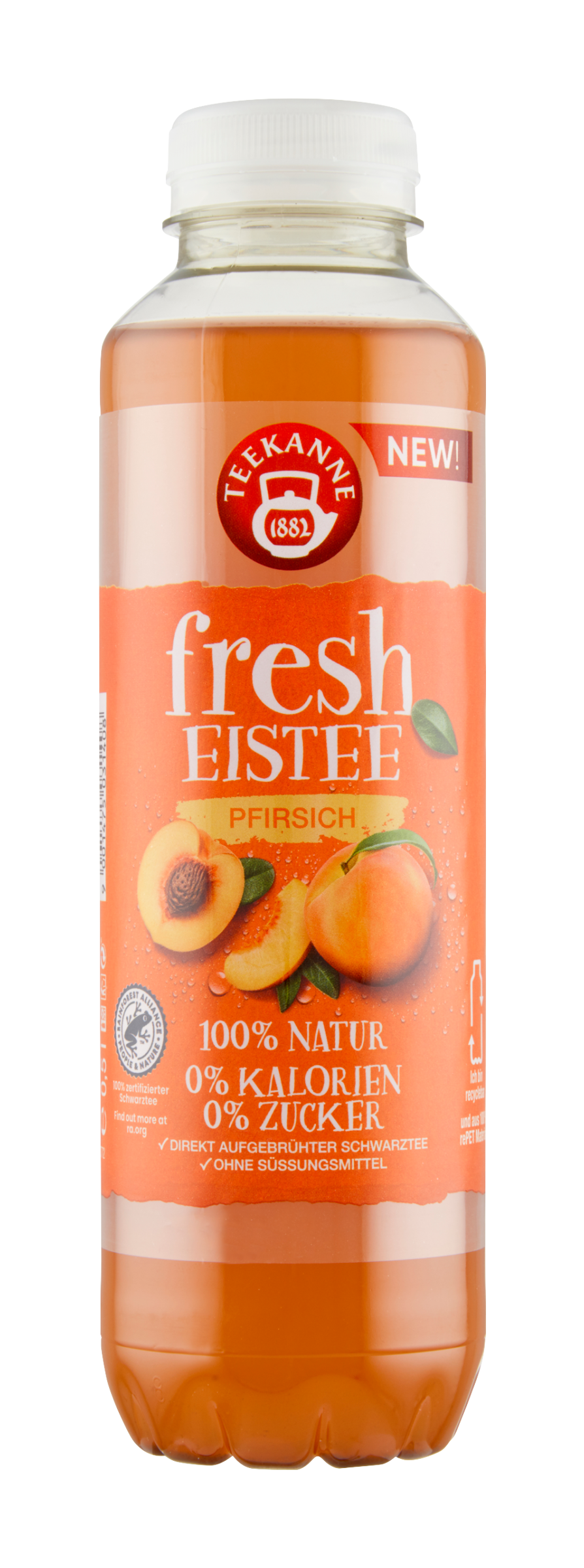 Osvěžující ledový čaj Teekanne Fresh Ice Tea vyrobený z nálevu černého a bylinného čaje s příchutí broskve. Nealkoholický nápoj s nízkou energetickou hodnotou, nesycený, aromatizovaný. Se sladidlem (list stévie). Tento skutečný extrakt černého a bylinného čaje je bez umělých barviv. 100% přírodní, 0 % cukru, 0 % kalorií.