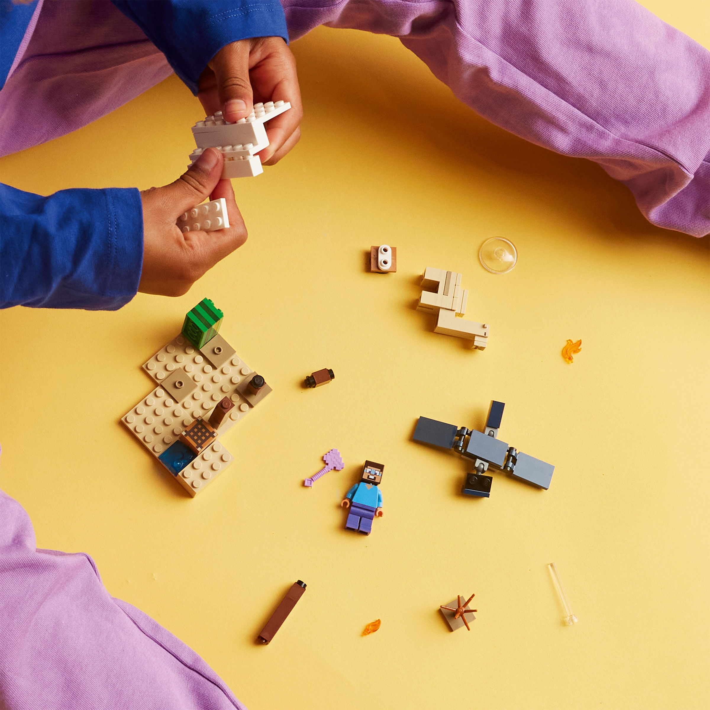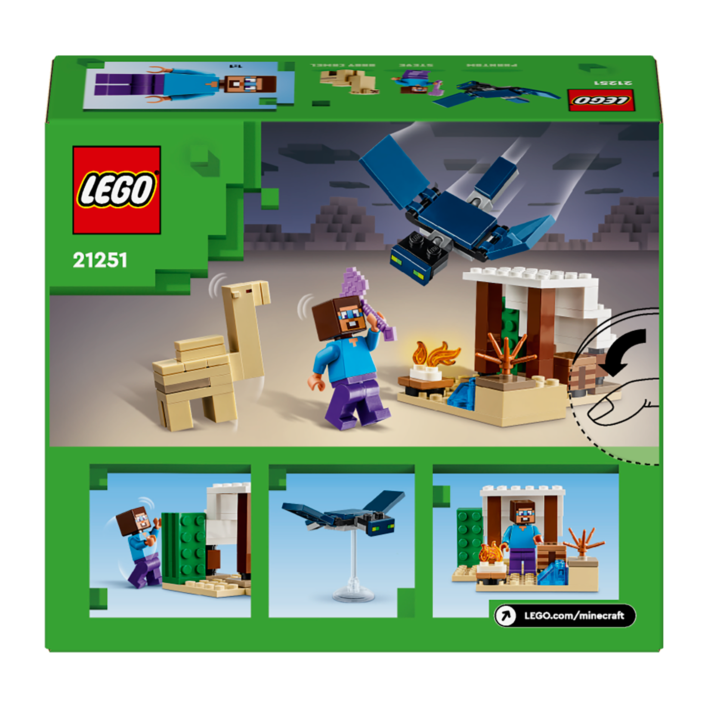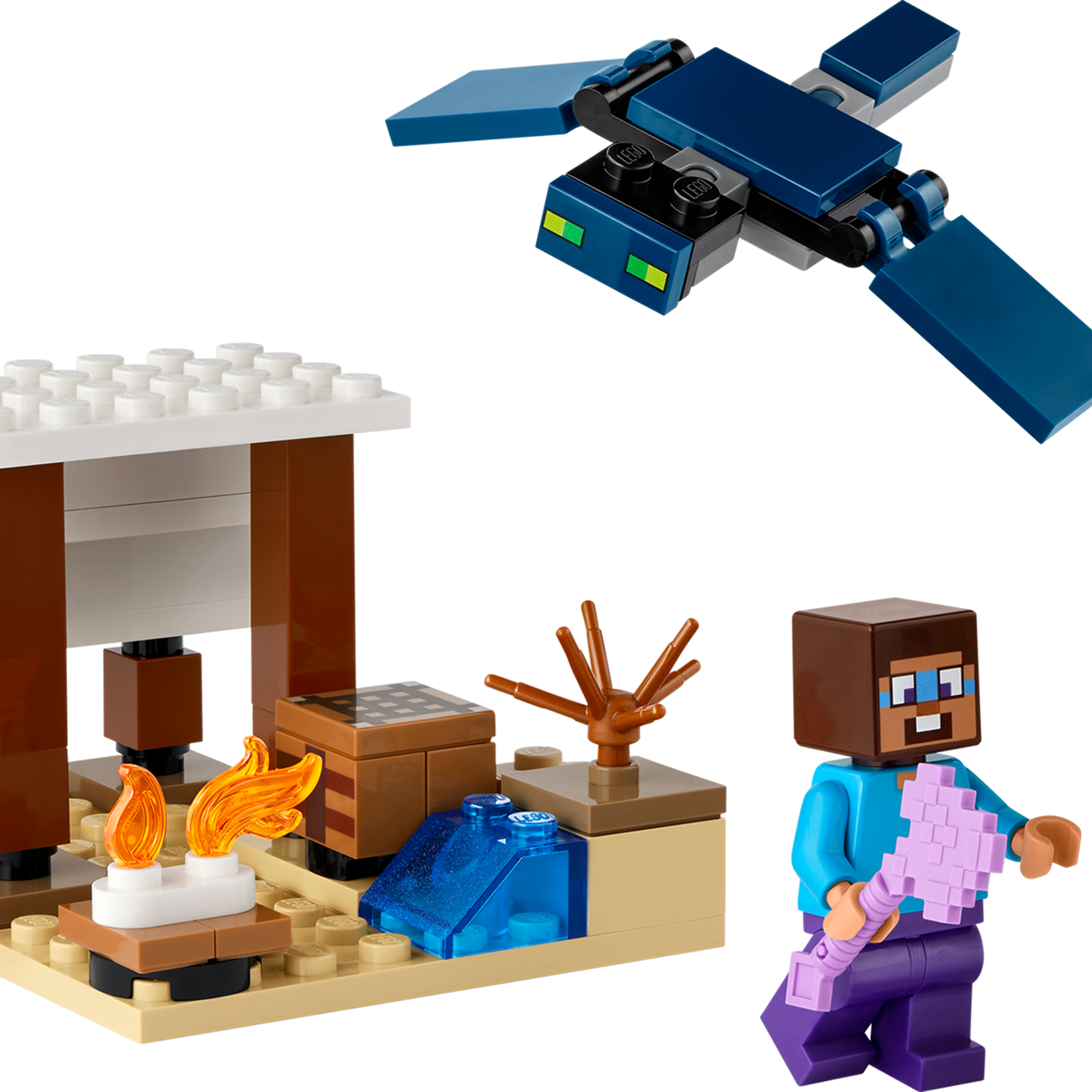V této přestavitelné herní stavebnici pro děti od 6 let najdete 3 figurky LEGO Minecraft, včetně Stevea, a domek v poušti. Součástí sady jsou také proslulé prvky ze hry Minecraft, jako je pracovní stůl, táborák a řada dílků pro sestavení pouště. Jedná se o skvělý dárek pro fanoušky Minecraftu, který přímo vyzývá k tvořivým dobrodružstvím a akčním bitvám, když základnu napadne létající Přízrak s pohyblivými křídly. Zcela poprvé se ve stavebnici LEGO Minecraft objevuje mládě velblouda a nechybí ani nová verze Steveovy tváře. Sadu lze kombinovat s dalšími stavebnicemi z řady LEGO Minecraft (prodávají se samostatně) a představuje skvělý dárek pro děti i milovníky videoher.