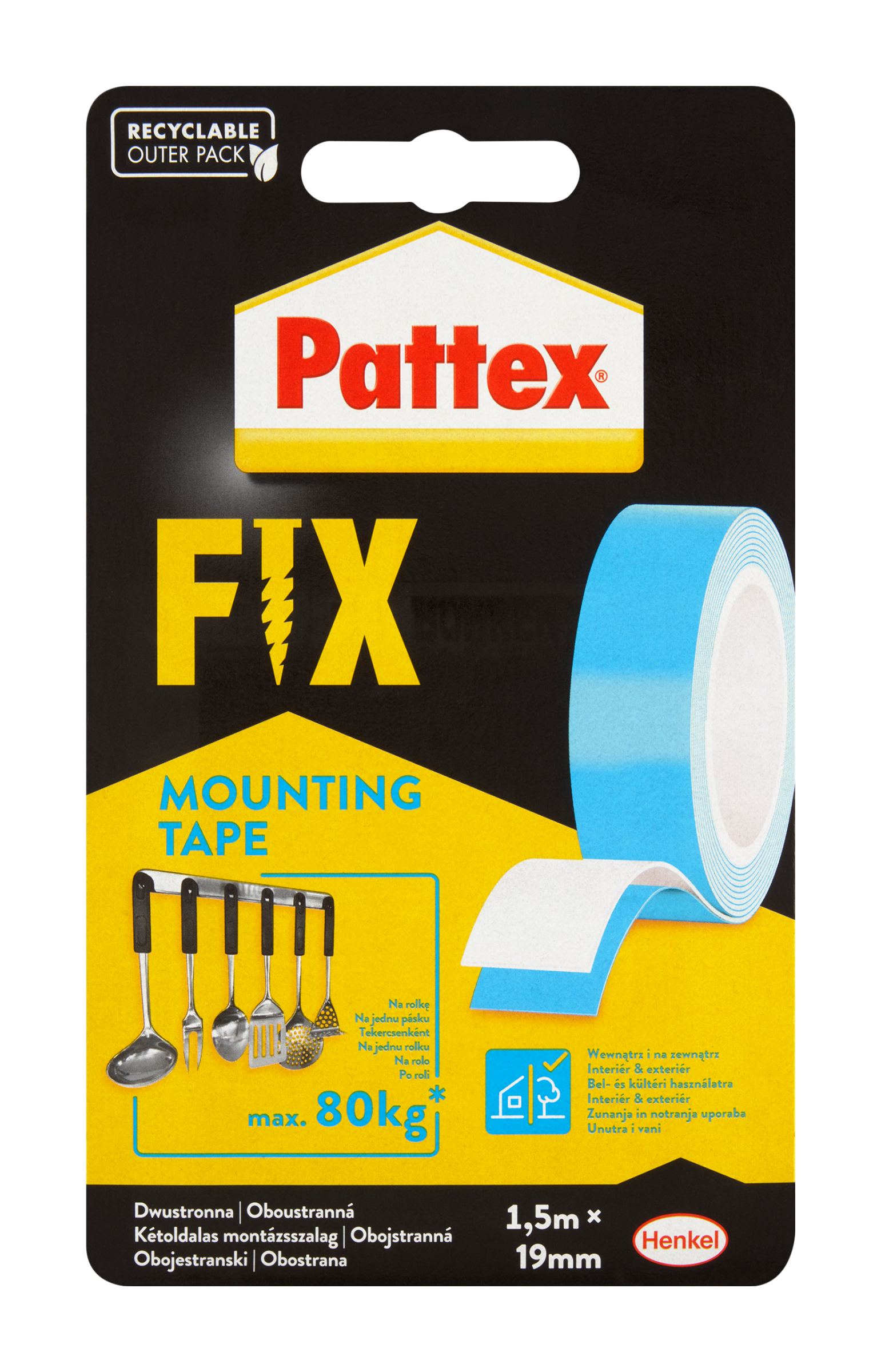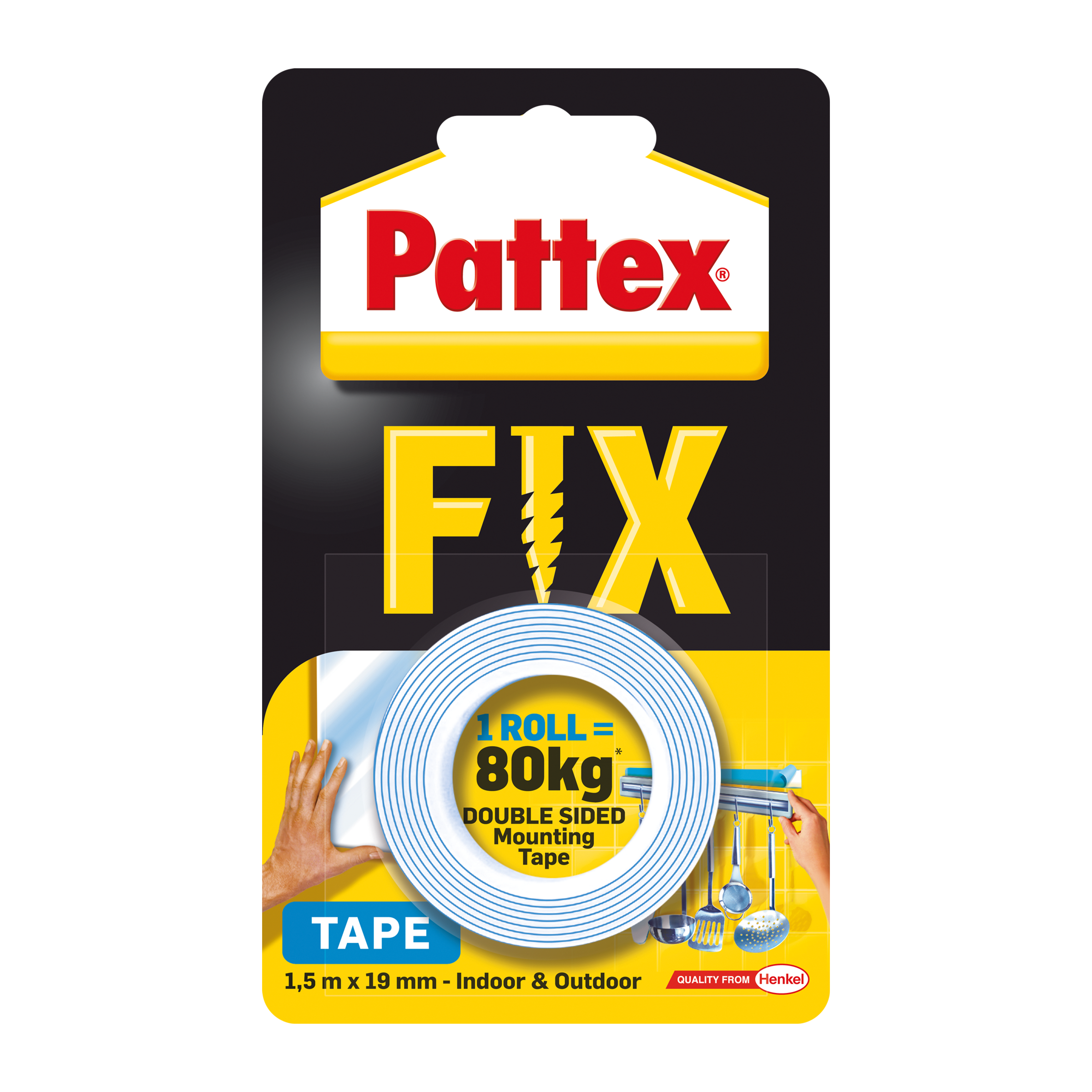 Páska Pattex je oboustranná extra silná lepicí montážní páska s vysokou přilnavostí. Ideální k připevňování háčků, cedulí, čísel, obrazů, registračních značek aut atd. Na jednu pásku max. 80 kg* Jedna páska dokáže za ideálních podmínek udržet až 80 kg.