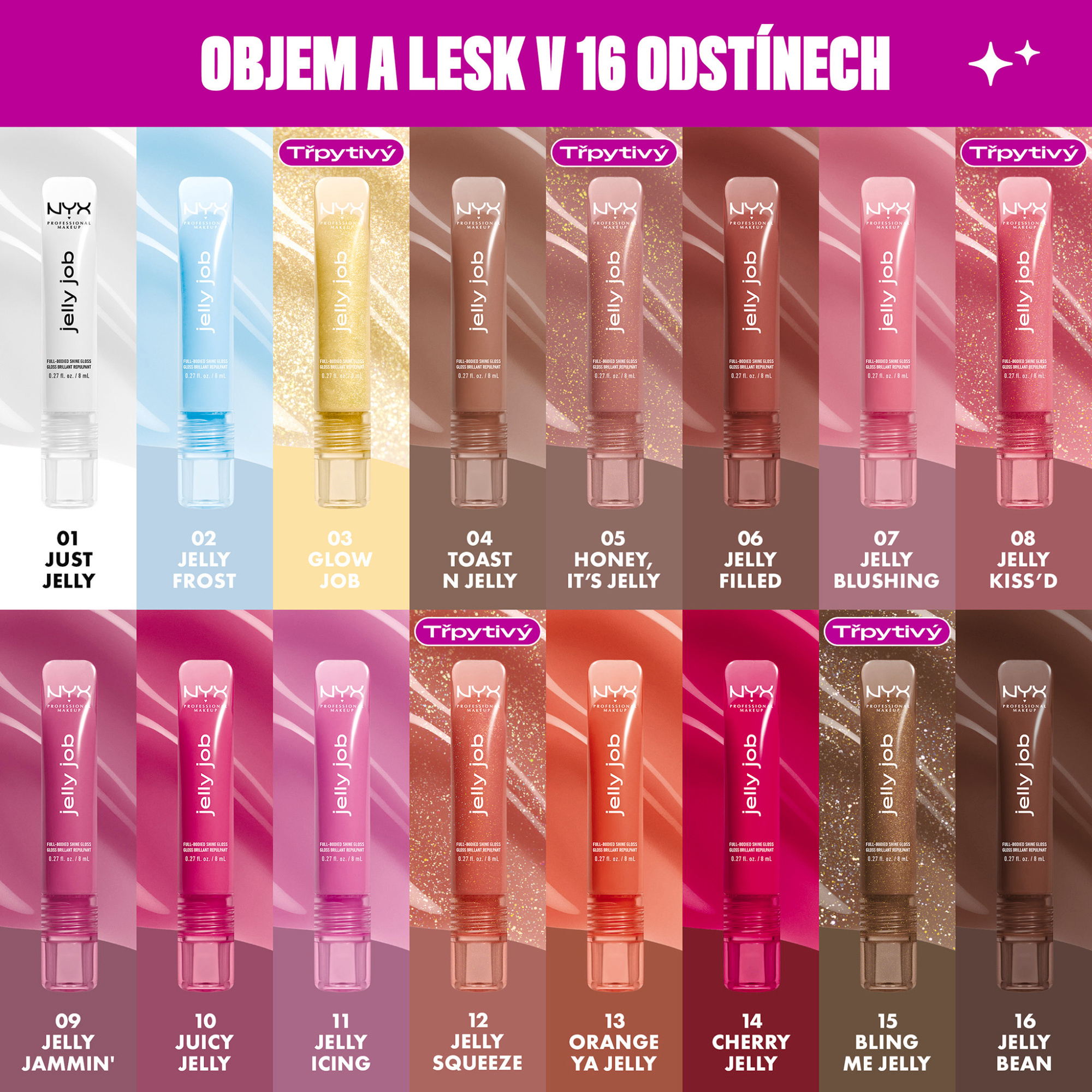 Najdi si svůj perfektní odstín, a to jak s třpytem, tak s čistě lesklým želé finišem. Od jemných nude a hravých růžových po oslnivé třpytky a odvážné červené, Jelly Job má tvůj perfektní odstín, aby se hodil k jakékoli náladě a pozvedl jakoukoli příležitost! Obohacený o lahodně sladkou třešňovou vůni, třešňový olej a peptidový komplex, Jelly Job je tvá nová oblíbená luxusní pochoutka pro tvé rty, po které budeš sahat každý den. Přimět všechny ostatní, aby ti záviděli tvé skleněně hladké, vysoce lesklé rty, nikdy nebylo jednodušší.