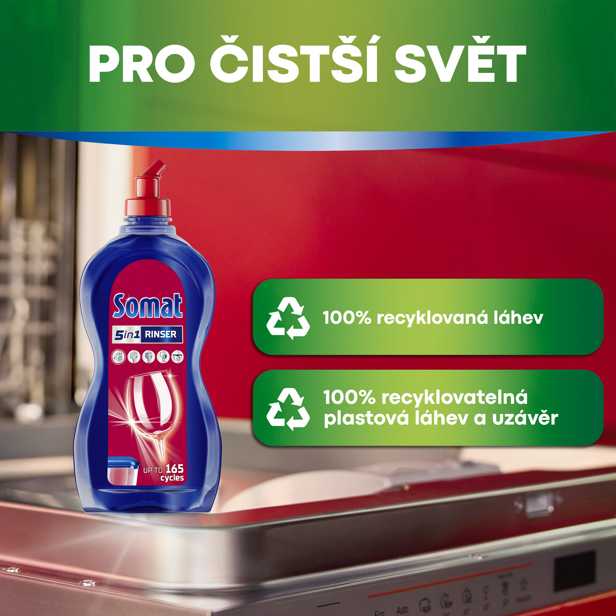 - 100% recyklovaný obal - Nejen, že Somat leštidlo eliminuje nutnost sušit nádobí po mycím cyklu, ale navíc je dodáváno ve 100% recyklovaném plastovém obalu