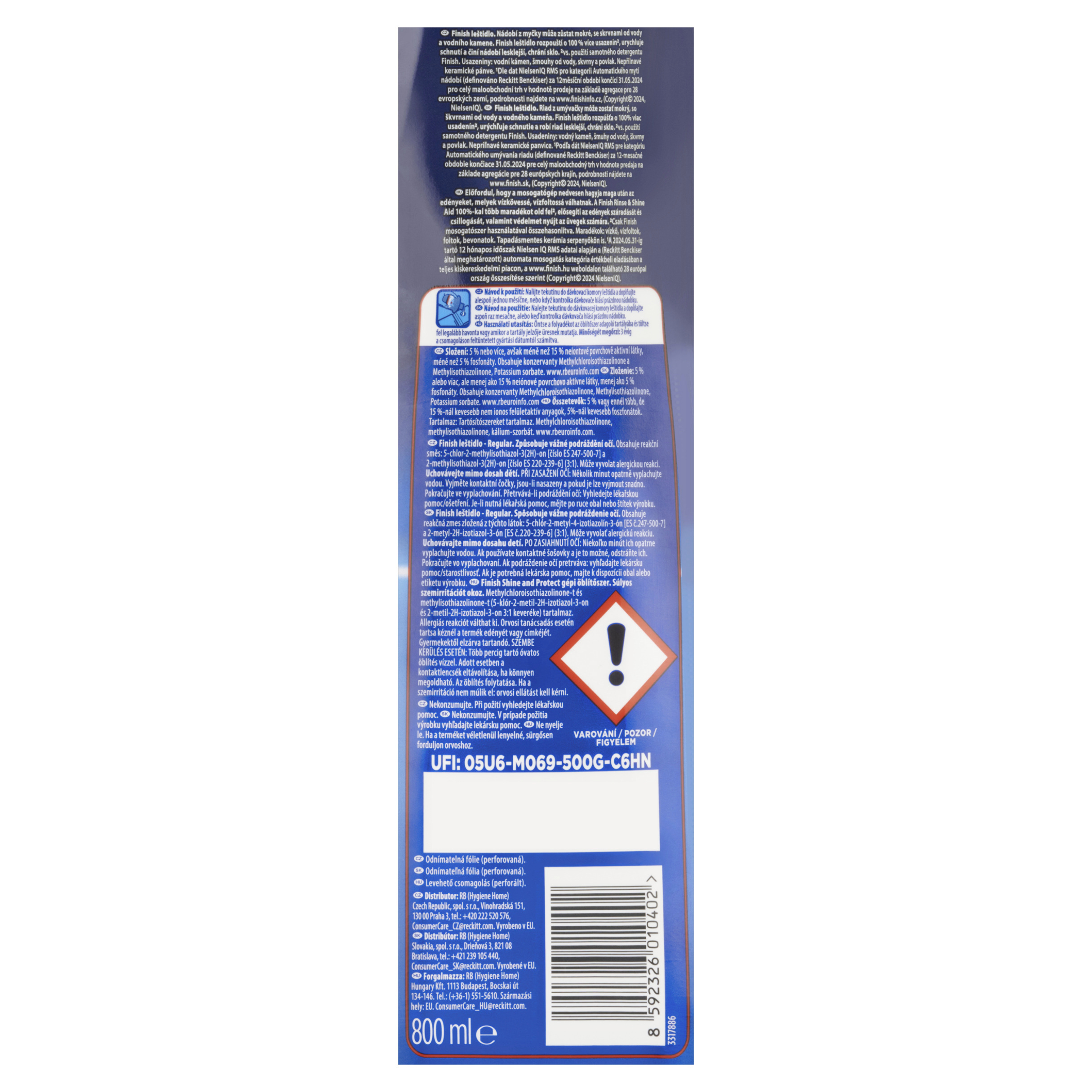 VAROVÁNÍ Finish leštidlo - Regular. Způsobuje vážné podráždění očí. Obsahuje reakční směs: 5-chlor-2-methylisothiazol-3(2H)-on [číslo ES 247-500-7] a 2-methylisothiazol-3(2H)-on [číslo ES 220-239-6] (3:1). Může vyvolat alergickou reakci. Uchovávejte mimo dosah dětí. PŘI ZASAŽENÍ OČÍ: Několik minut opatrně vyplachujte vodou. Vyjměte kontaktní čočky, jsou-li nasazeny a pokud je lze vyjmout snadno. Pokračujte ve vyplachování. Přetrvává-li podráždění očí: Vyhledejte lékařskou pomoc/ošetření. Je-li nutná lékařská pomoc, mějte po ruce obal nebo štítek výrobku. Nekonzumujte. Při požití vyhledejte lékařskou pomoc. Uchovávejte mimo dosah dětí.