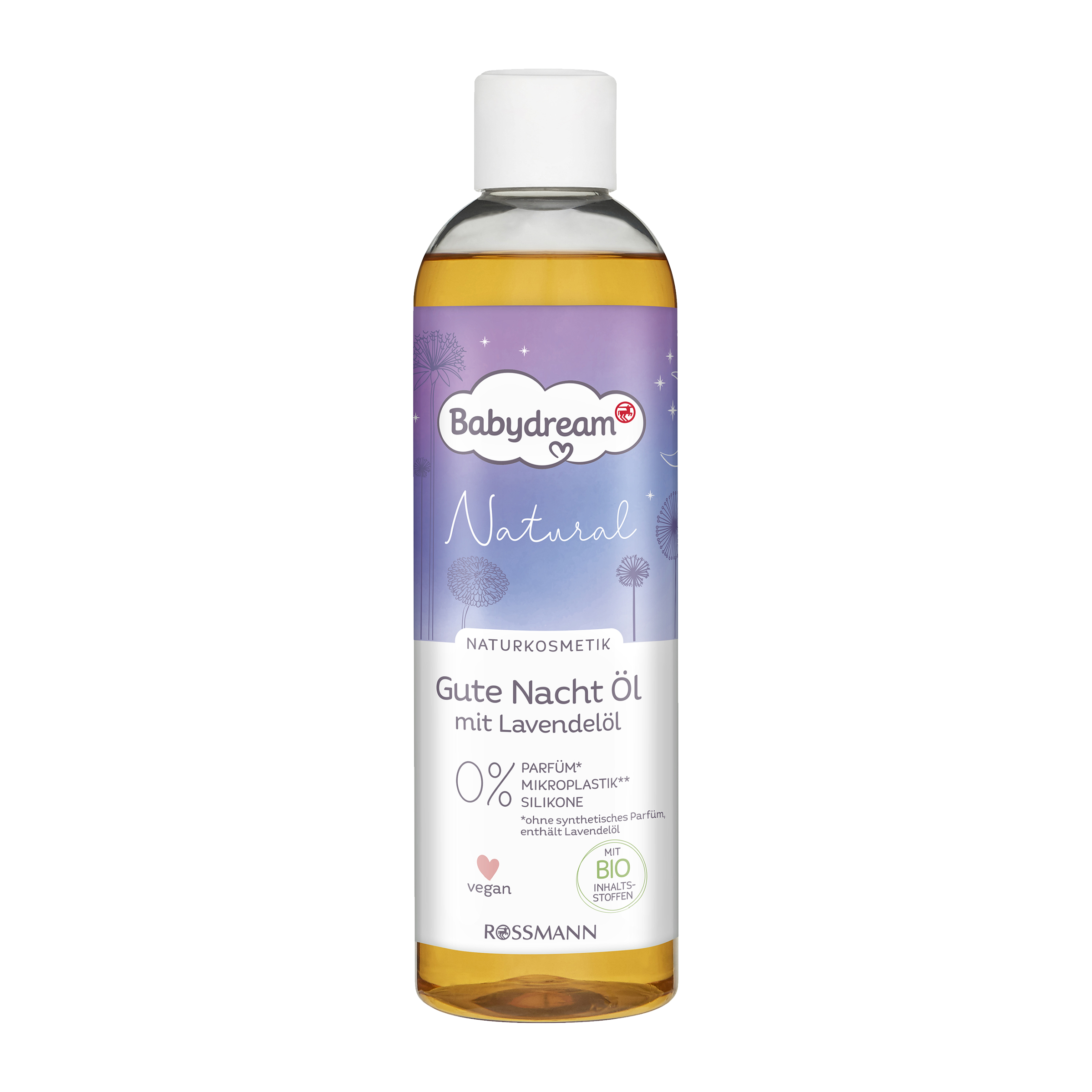 Náš přírodní olej na dobrou noc Babydream s organickými přísadami vyživuje jemnou dětskou pokožku přes noc. Jemná levandulová vůně slouží k večerní relaxaci a zajišťuje klidný spánek. Rituál před spaním pomůže vašemu dítěti lépe spát. Olej na dobrou noc je také ideální jako přísada do koupele nebo na dětskou masáž před spaním.