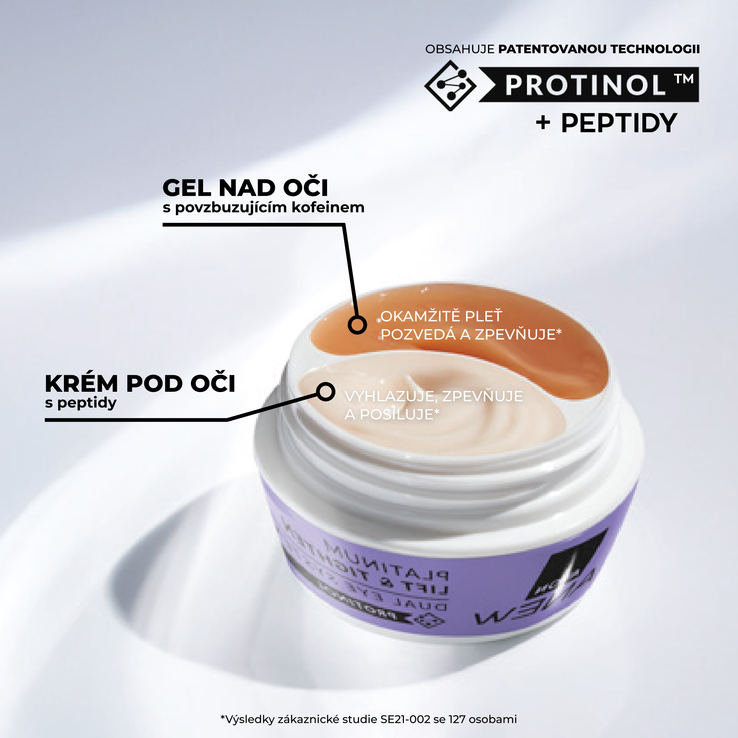 Gel nad oči dodá očnímu okolí vypnutější vzhled, složení s povzbuzujícím kofeinem. Krém pod očí zajistí hladší a pevnější vzhled pleti pod očima, obsahuje vyživující složení bohaté na peptidy.